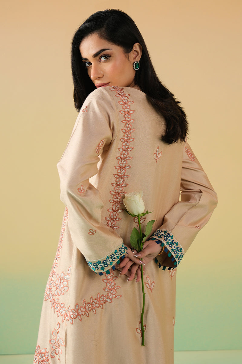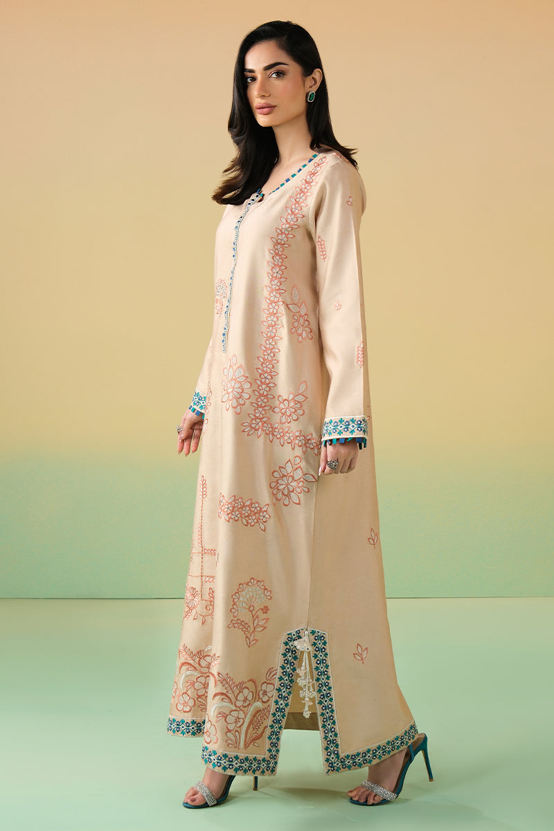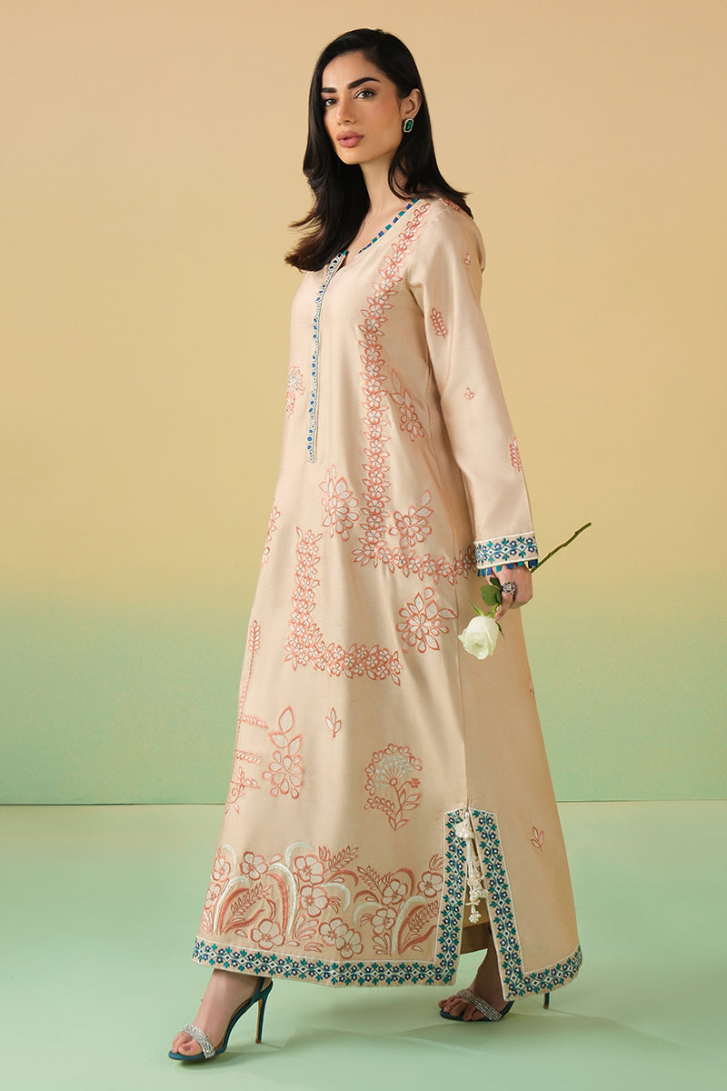 This sand-toned kaftan is adorned with intricate coral threadwork that blooms across the silhouette in artful floral patterns. The elongated cut is elevated with a striking embellished neckline, finished with teal accents and tassels.