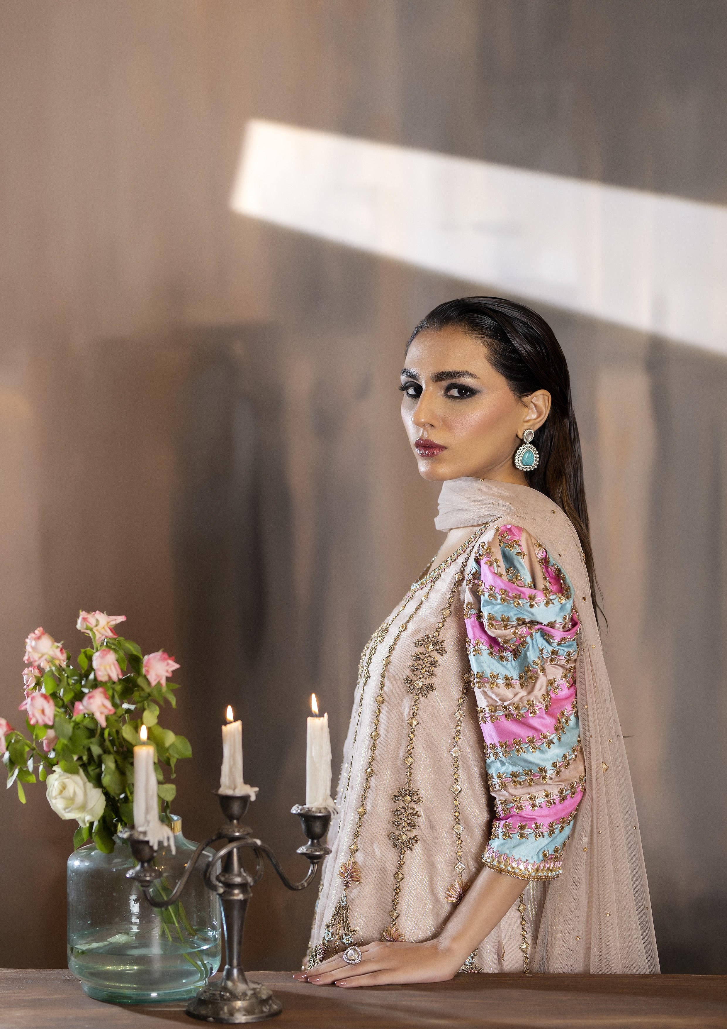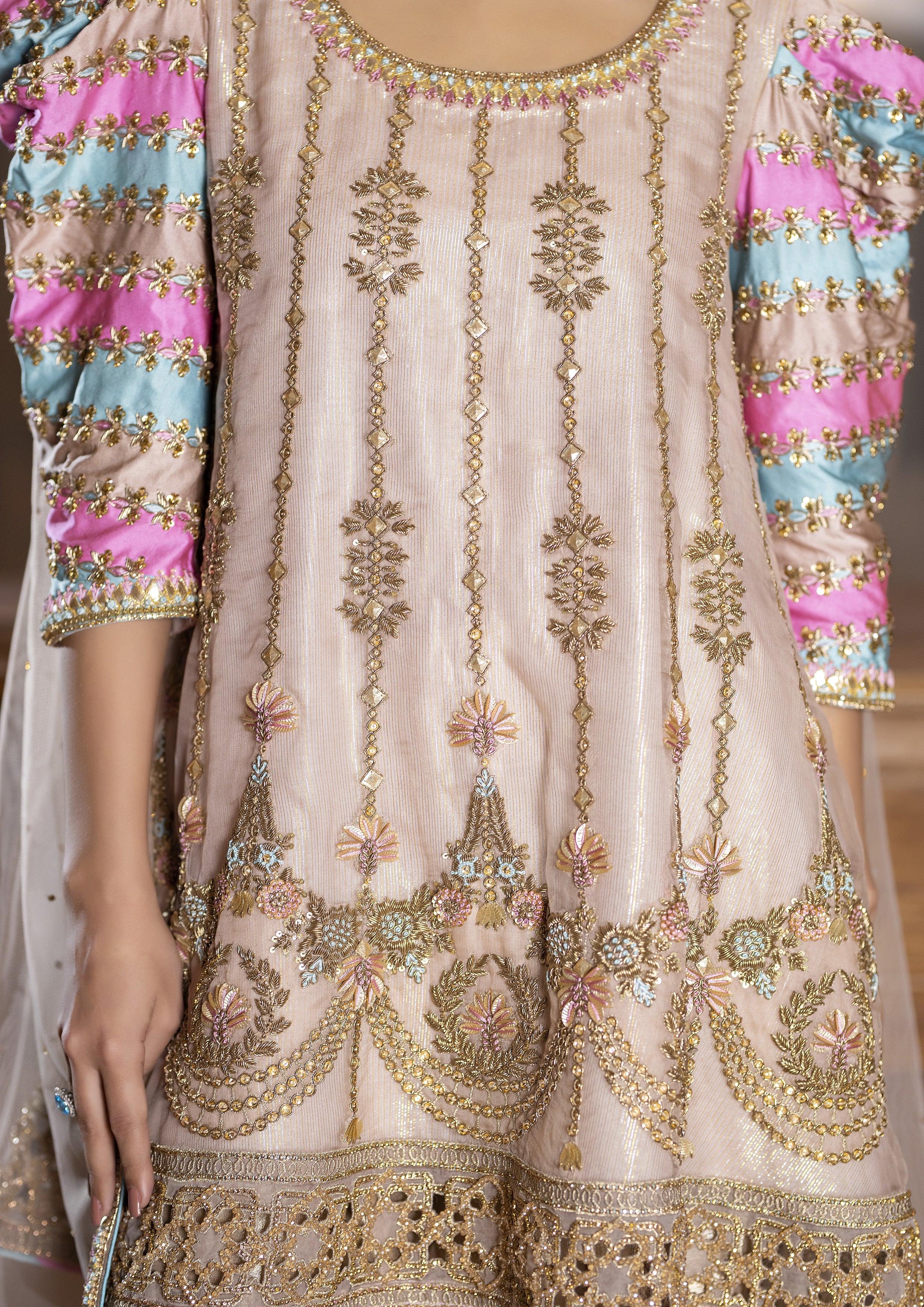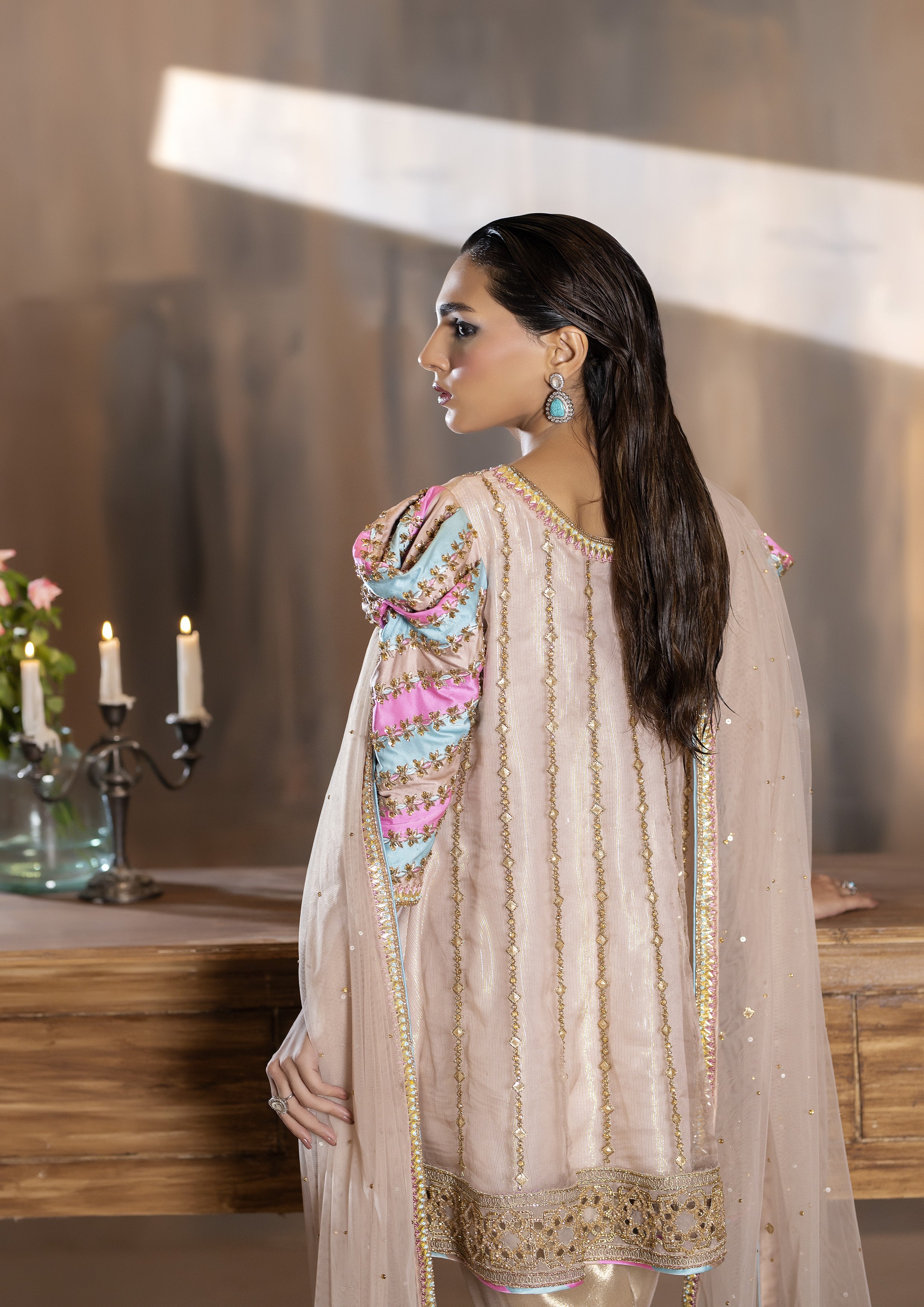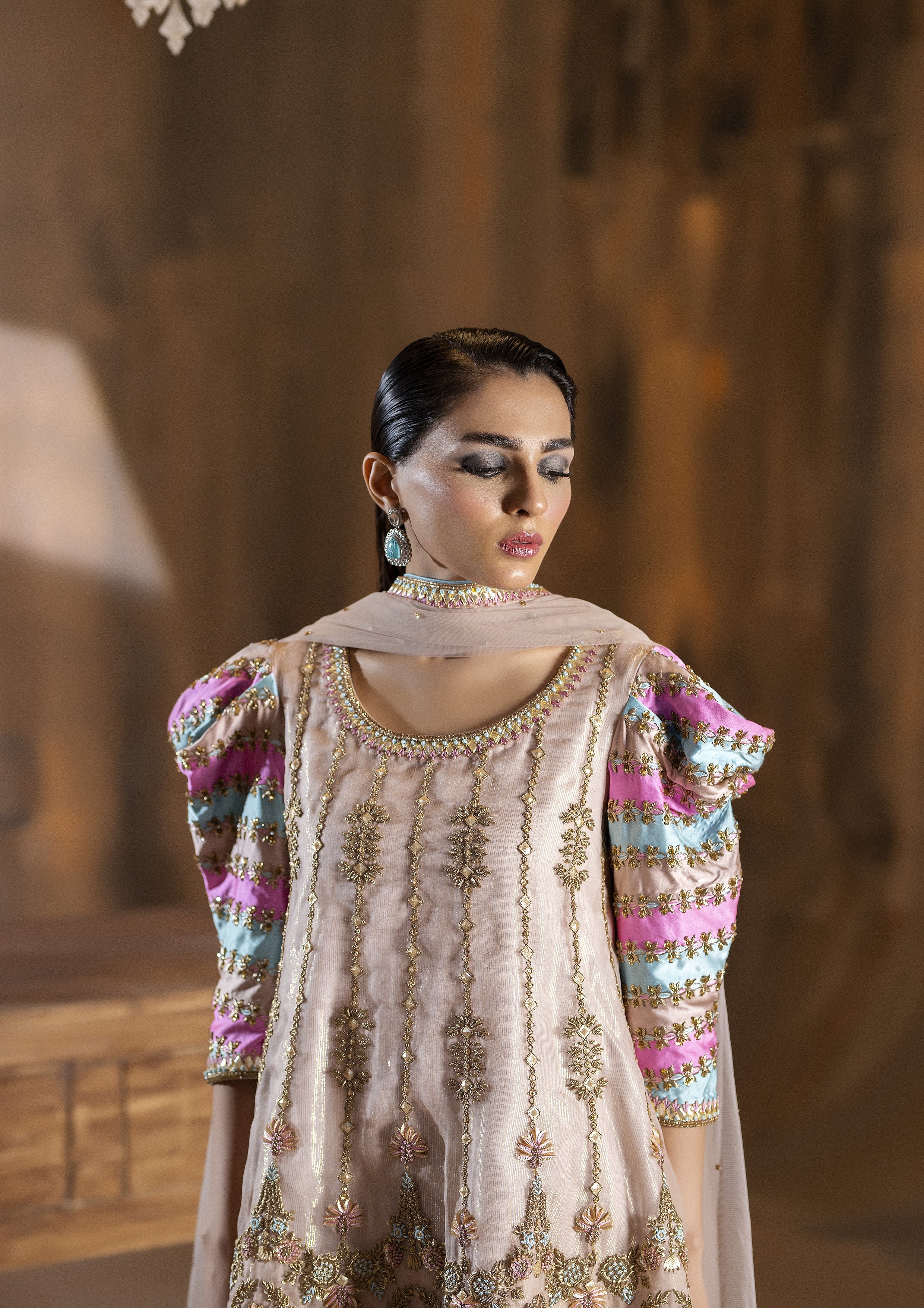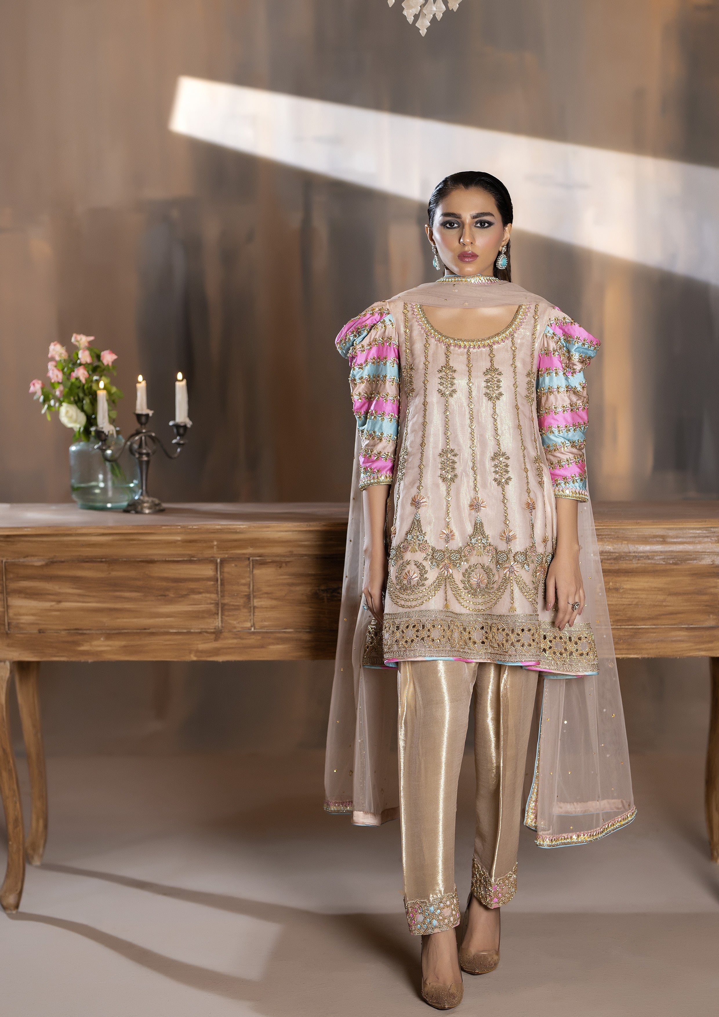 Making a statement with style and sophistication! This peplum net shirt, adorned with stunning gold embellishments, offers a perfect blend of modern flair and traditional elegance. The puffy sleeves add a touch of drama, making the silhouette truly eye-catching. Paired with fitted shalwar, this look effortlessly combines comfort with class, perfect for any formal occasion.