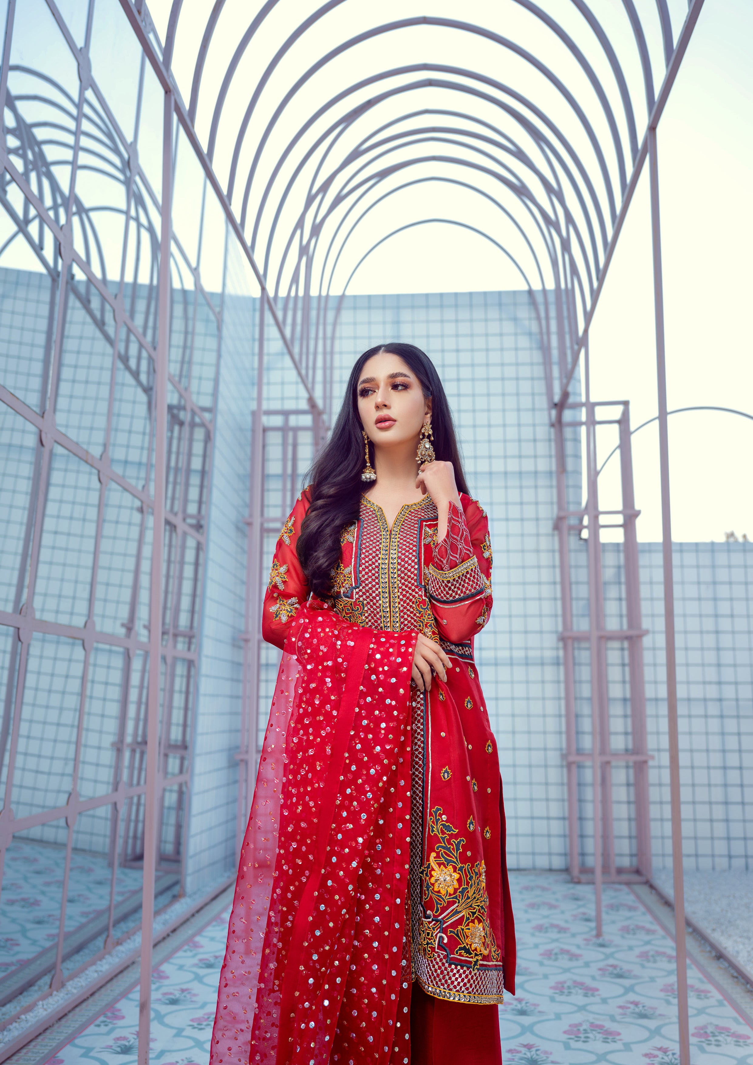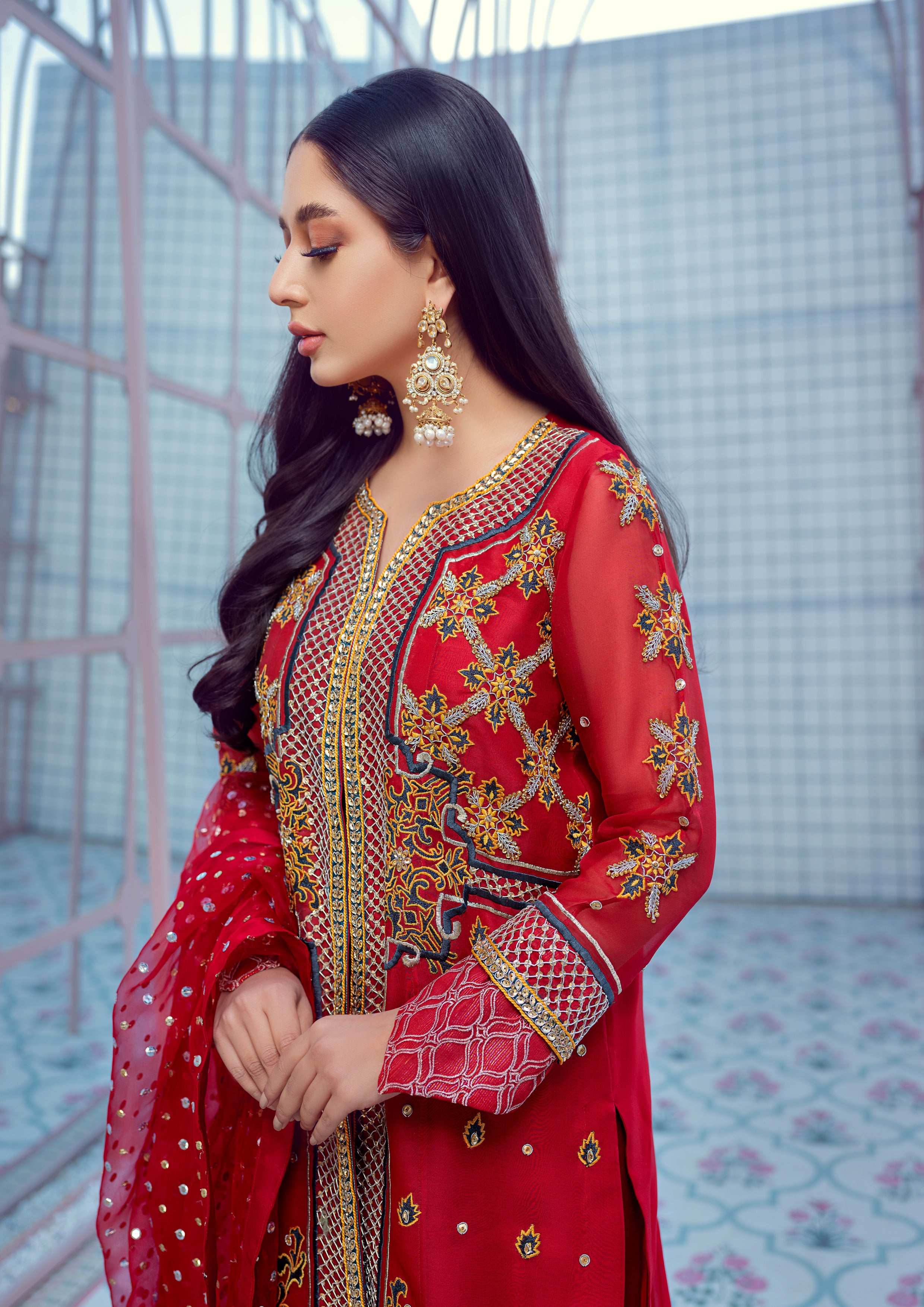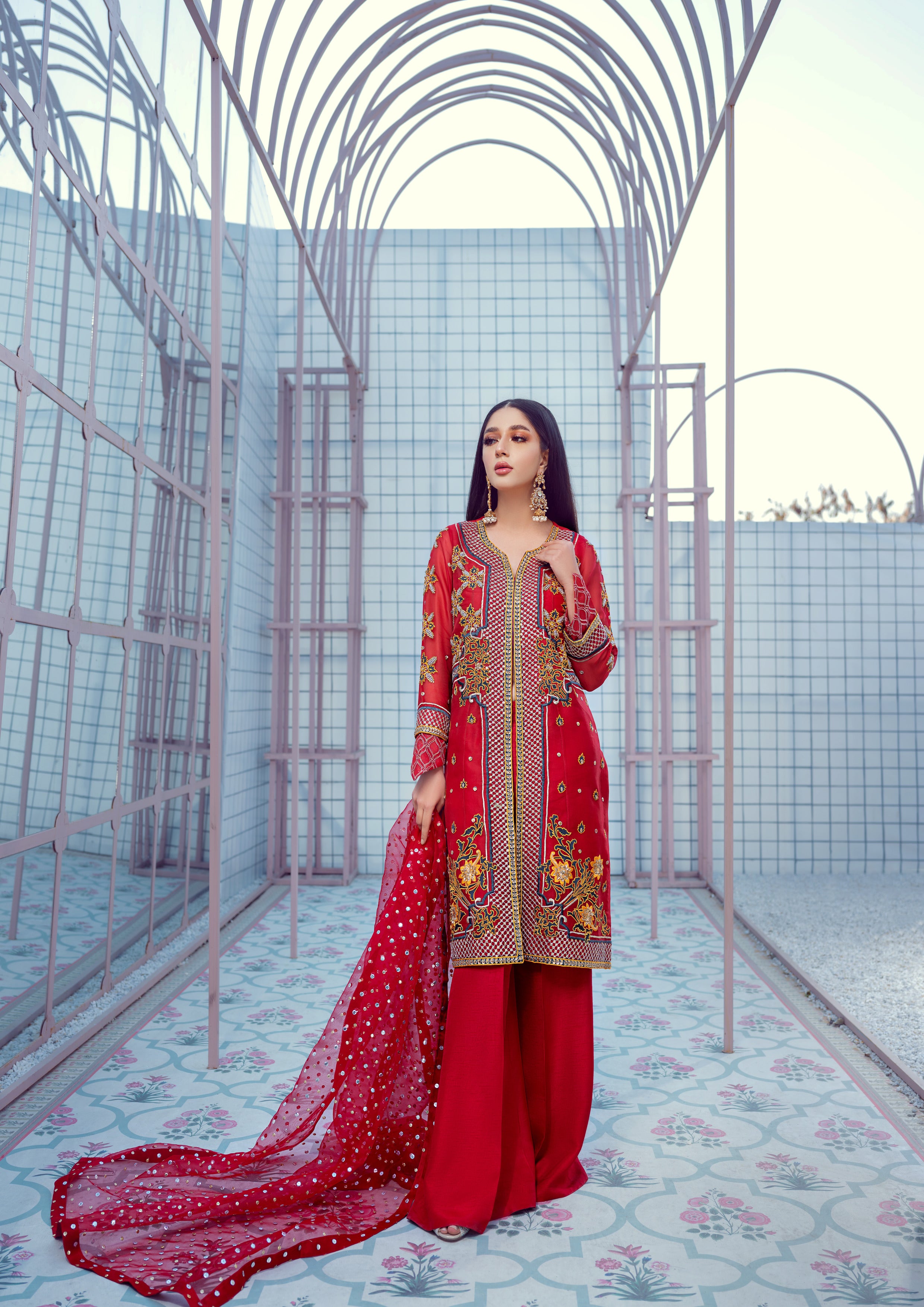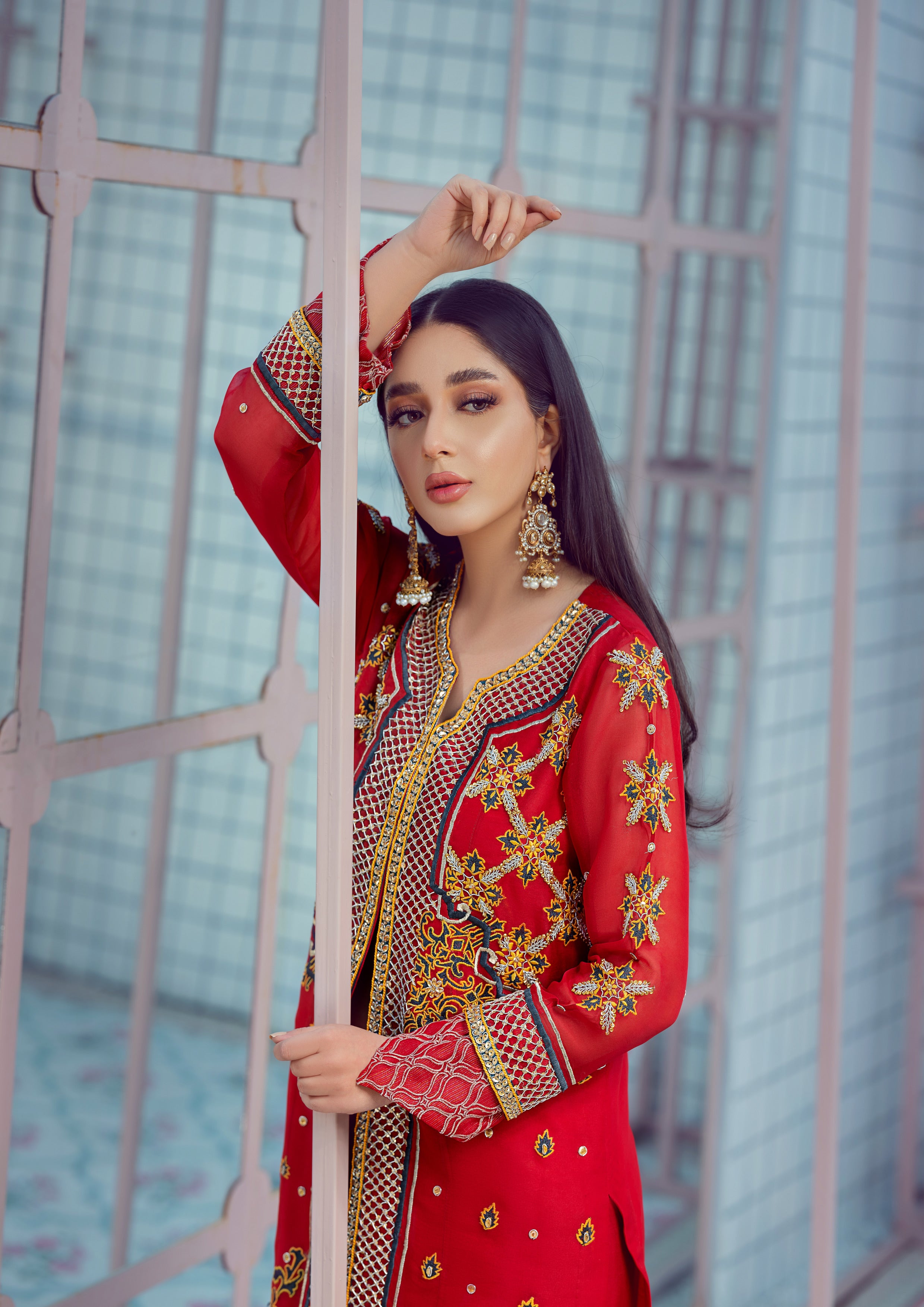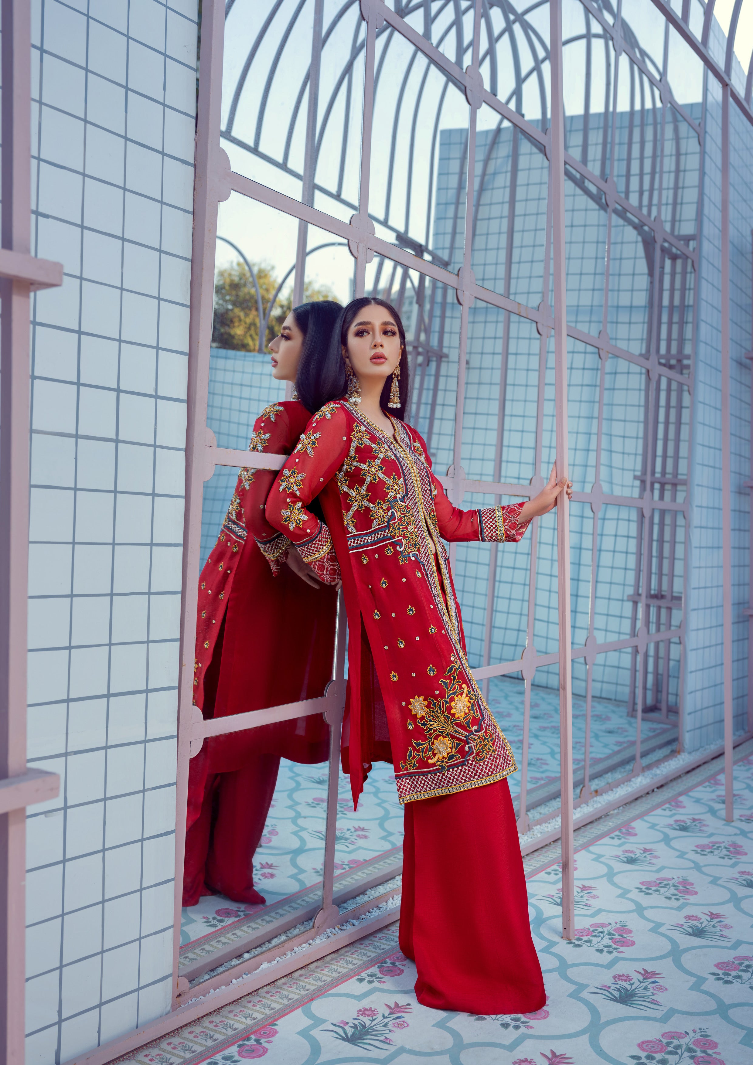 Embrace the allure of 'Dusky Sky' – a striking rich red, front-open shirt outfit adorned with intricate thread, sequin, and tilla embroidery. This exquisite piece is enhanced by vibrant yellow accents, adding warmth and contrast to the ensemble’s bold hue. The detailed craftsmanship on the shirt brings elegance and sophistication, making it an ideal choice for festive and formal occasions. With its unique color palette and artful embroidery, 'Dusky Sky' is a statement outfit that beautifully balances tradition with contemporary style.