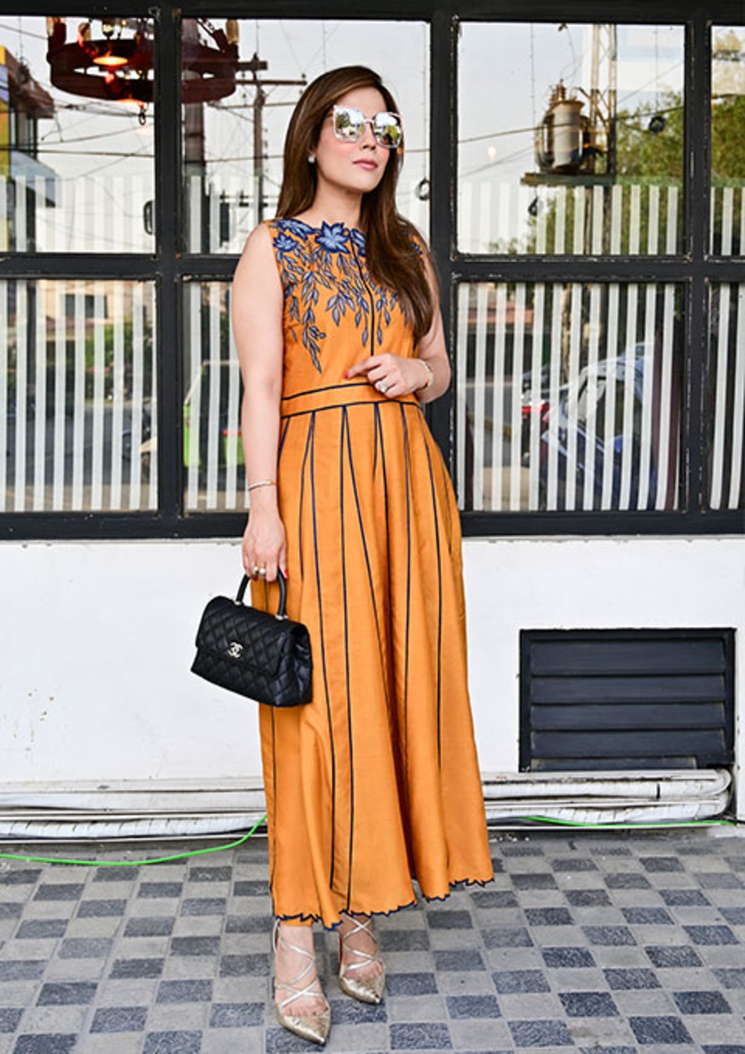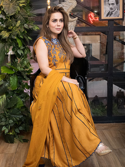 Georgia was in love. In love with flowers, nature and skyscrapers. She wanted to embrace them all. She wanted the world to know how beautiful these are. She expresses her obsession by stepping out in this gorgeous mustard cotton net unique kalidar with an embroidered floral bodice and cutwork daman. Georgia is an innovative impressionist of modern art and challenges perceptions to achieve worldwide acclaims from critics and general public.