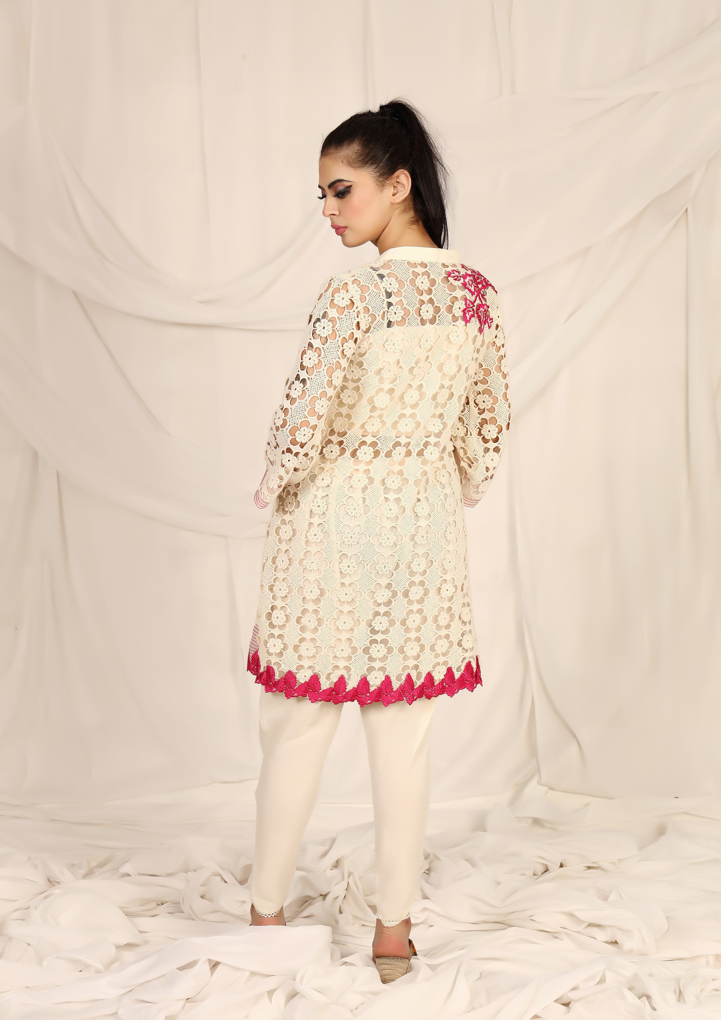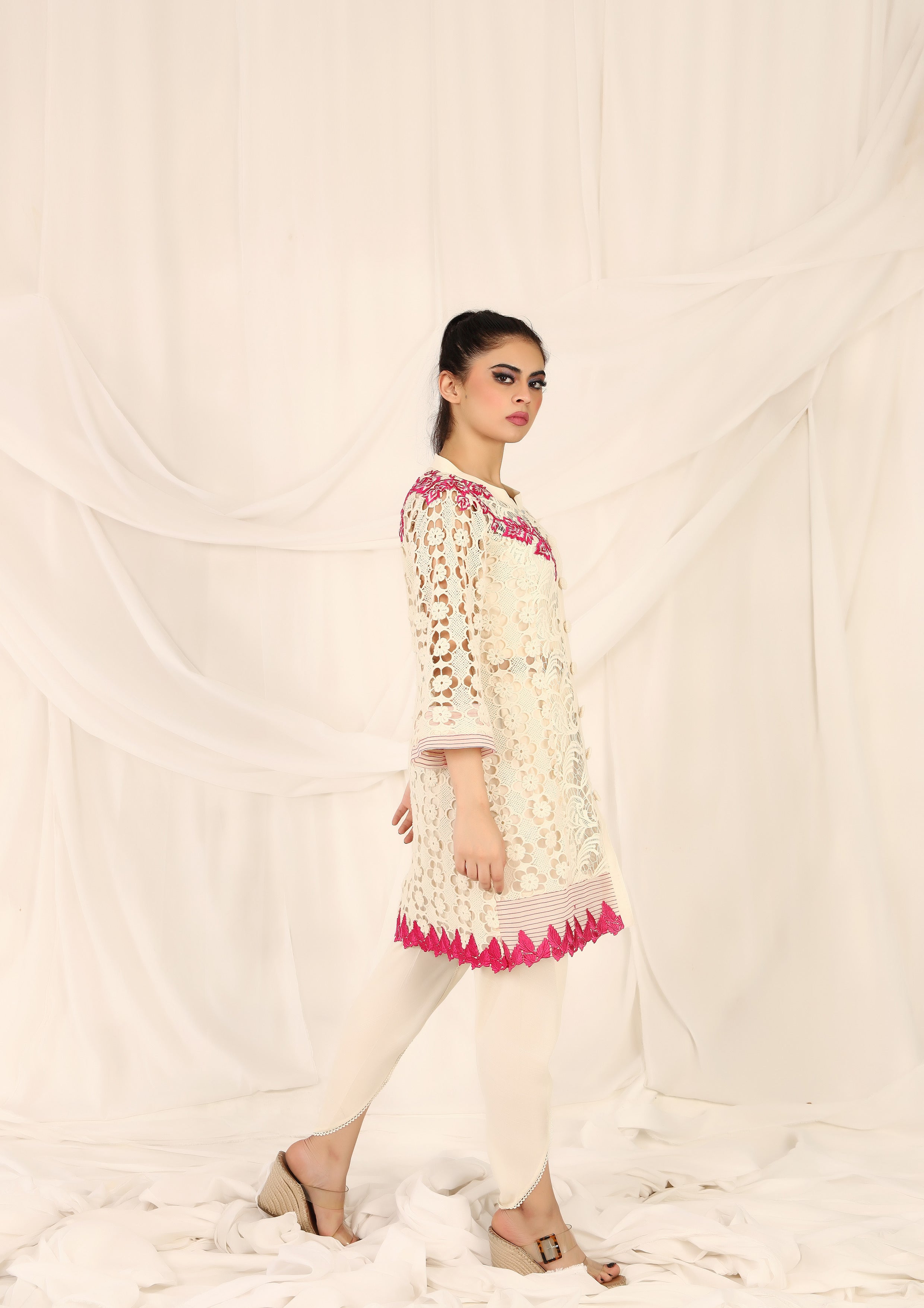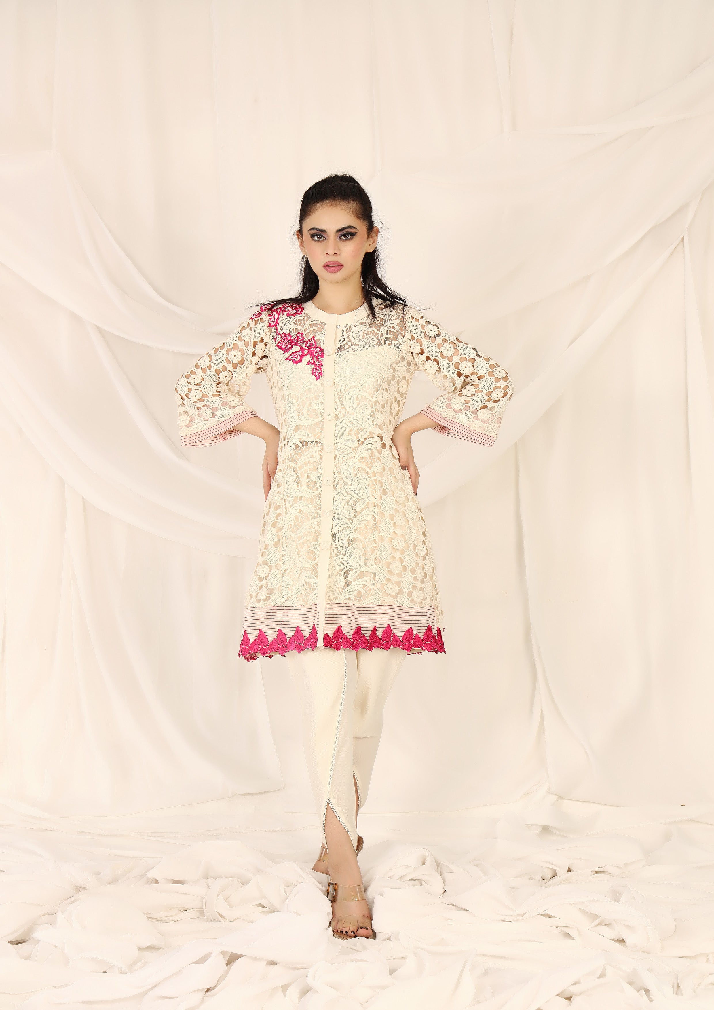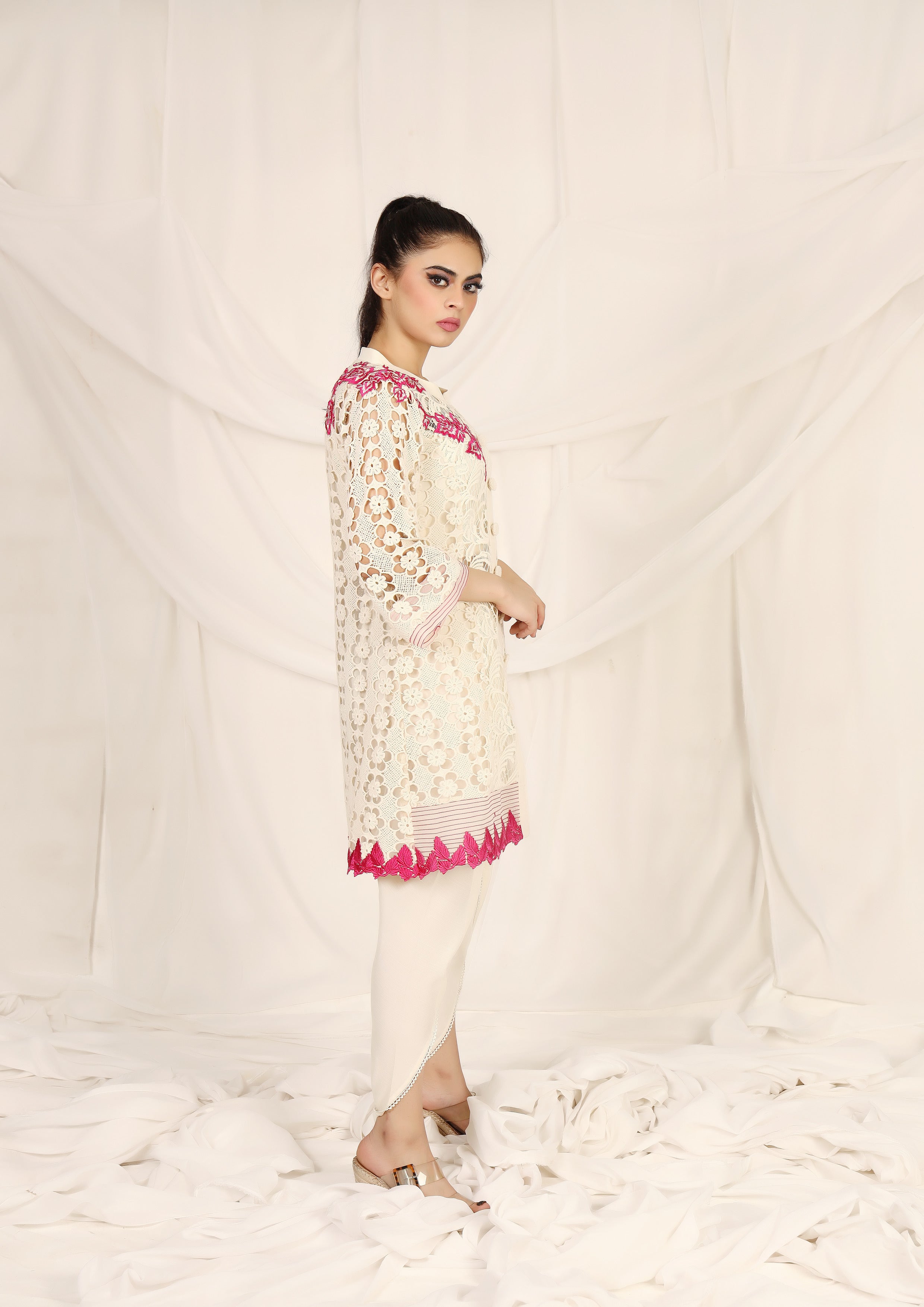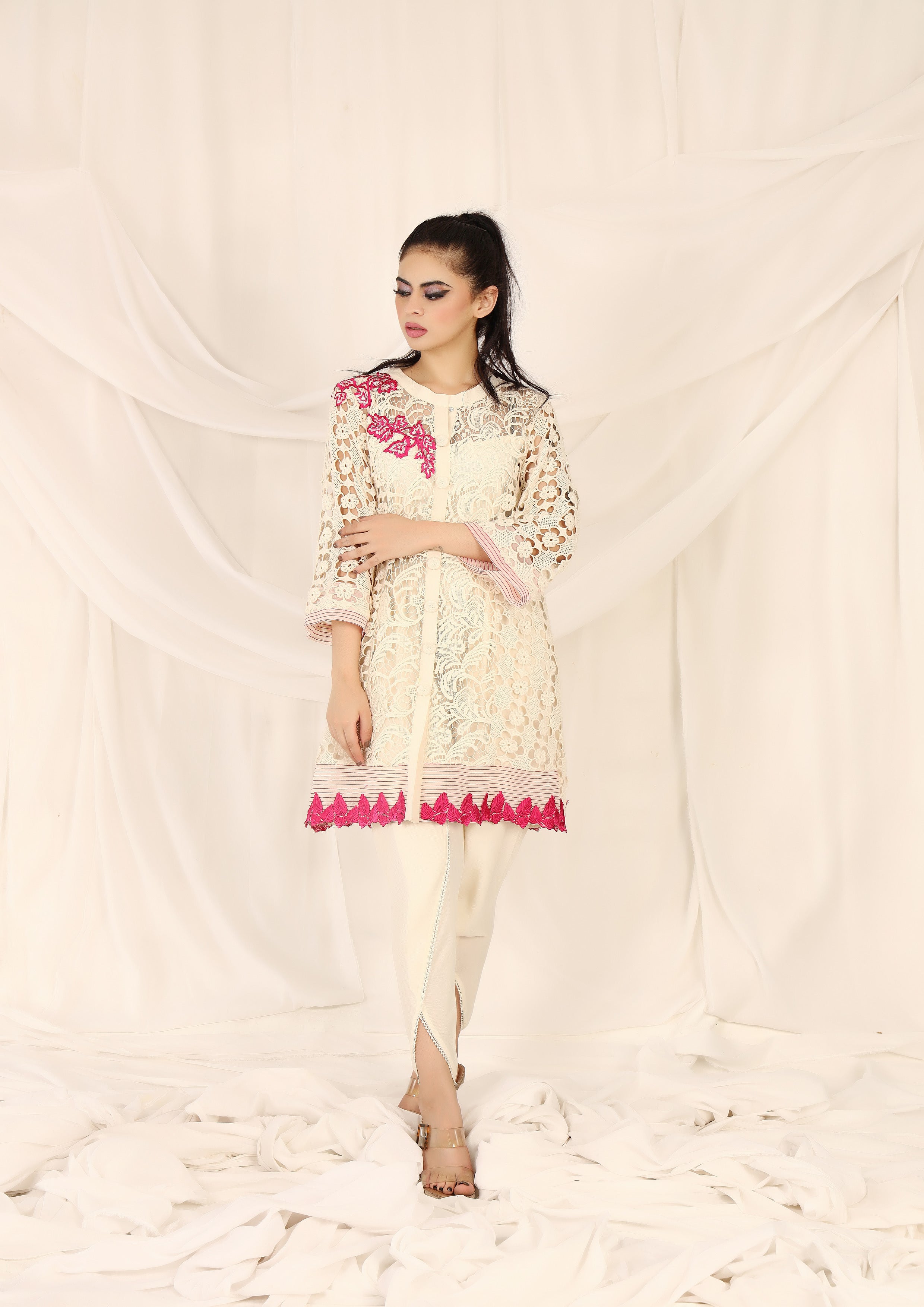 Unleash your inner fashionista with our breathtaking lace/net ensemble! Featuring a short length and trendy tulip shalwar, this outfit is the epitome of modern elegance. The delicate lace detailing adds a touch of sophistication that is sure to turn heads.
