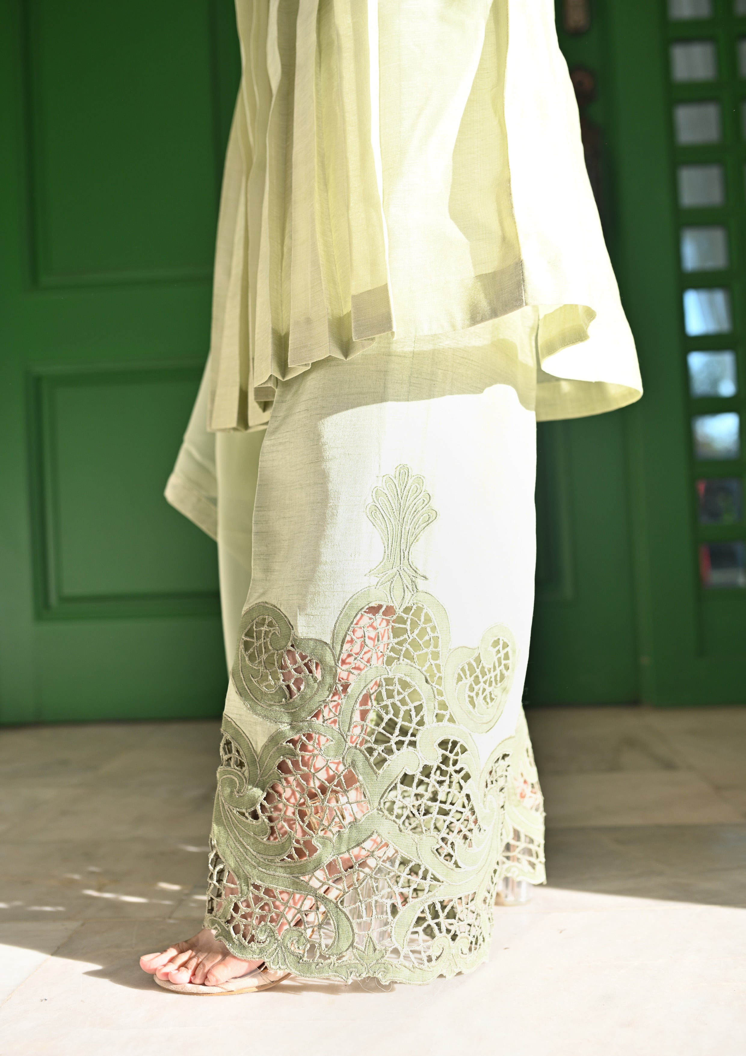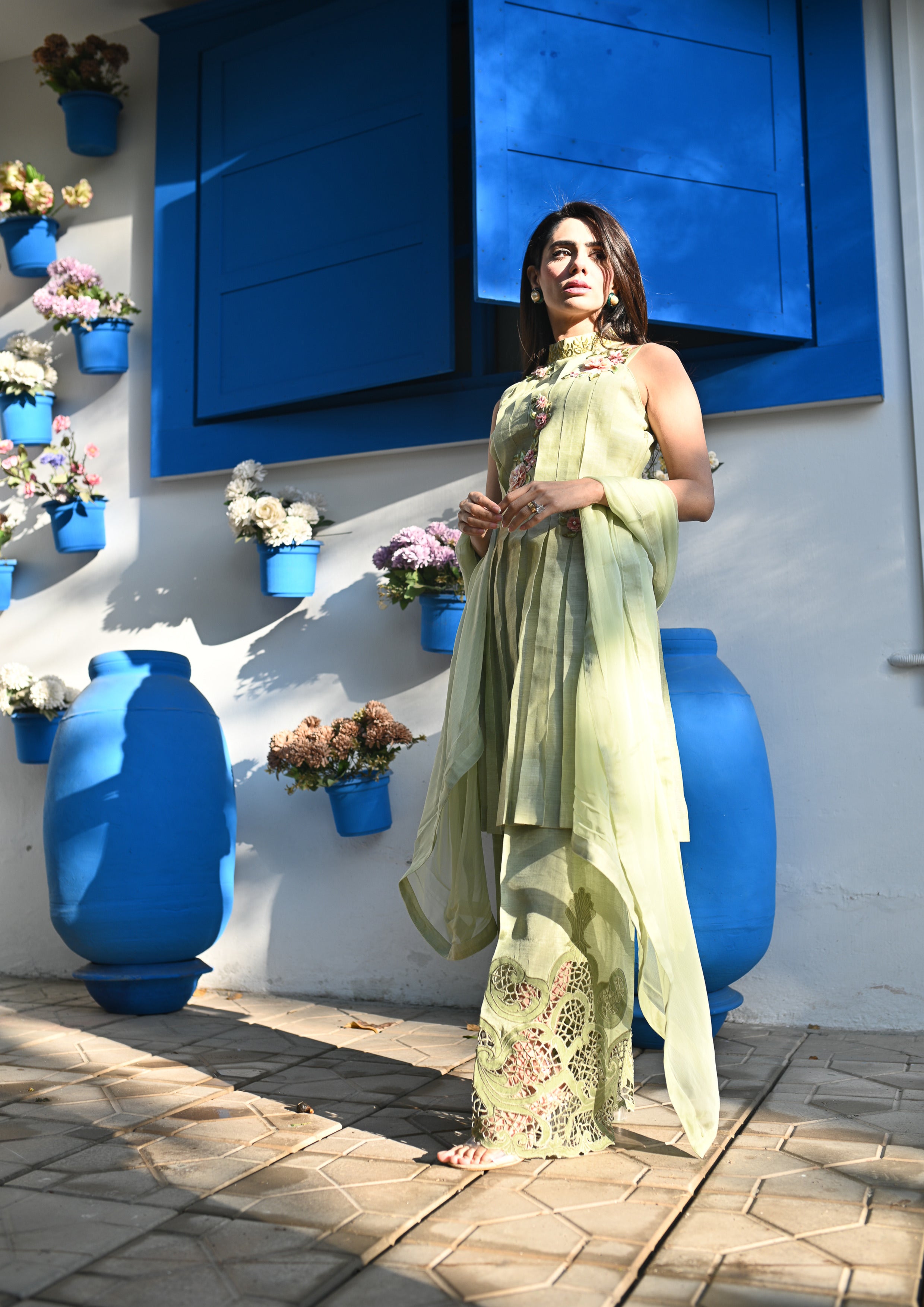June stood still. The sense of inner peace and harmony was unmatched. She could smell the caramel in the air and the music of the meadows echoed in her ears. She danced bare feet. Her green paper lawn dress decorated with its own bouquet of delicate pink flowers and cutwork palazzos with dupatta in the same shade, blends June ever so naturally in this picturesque setting.