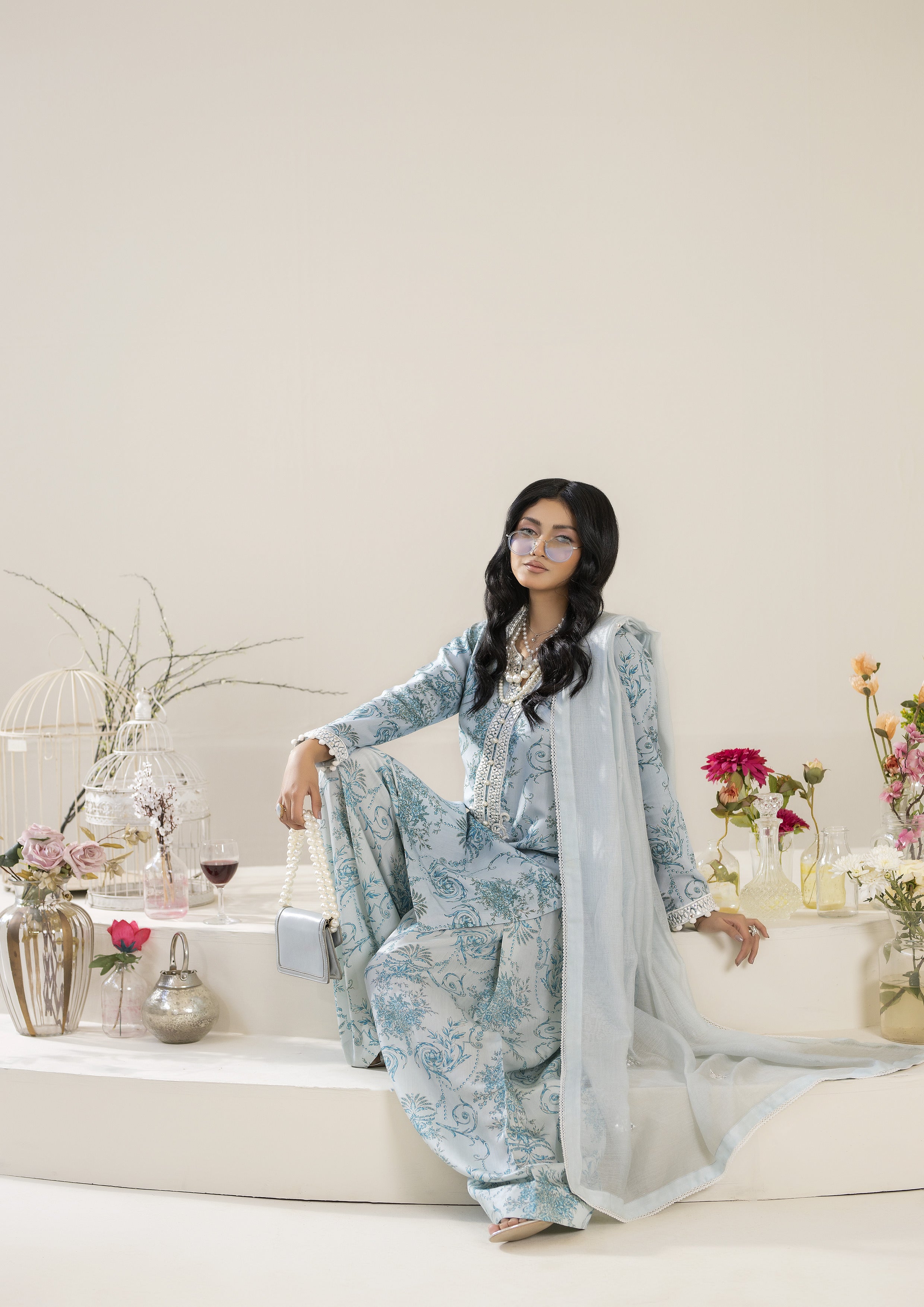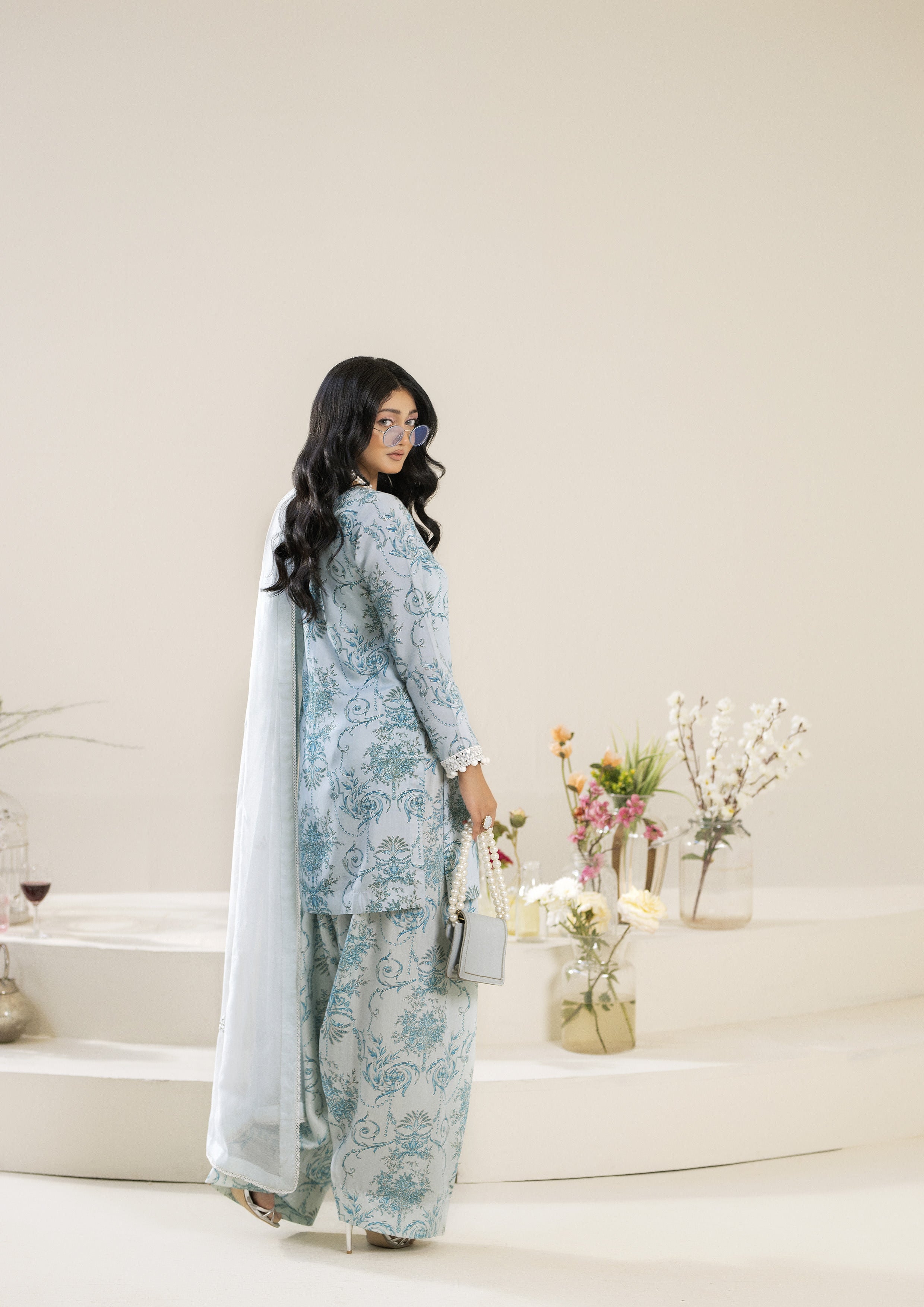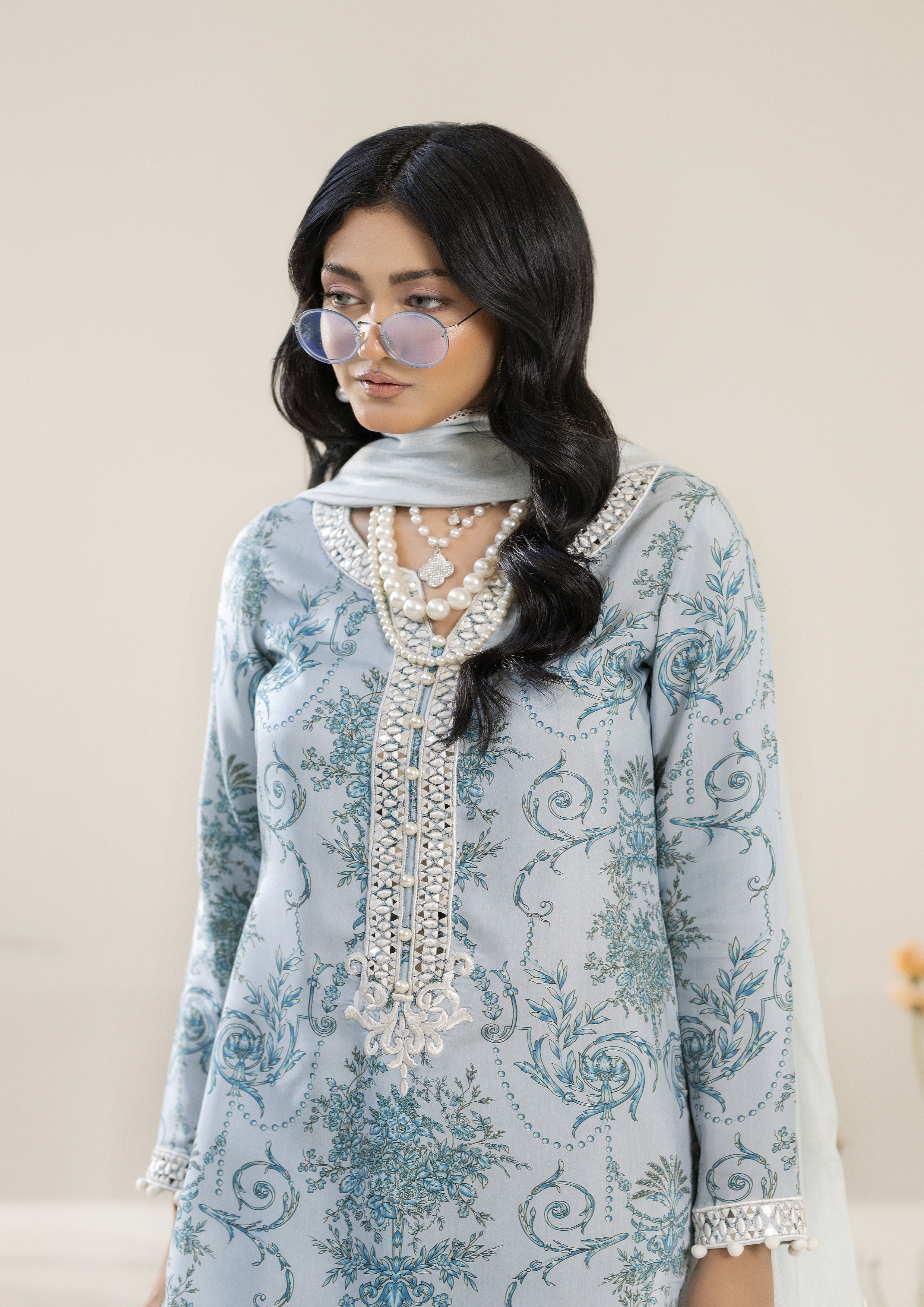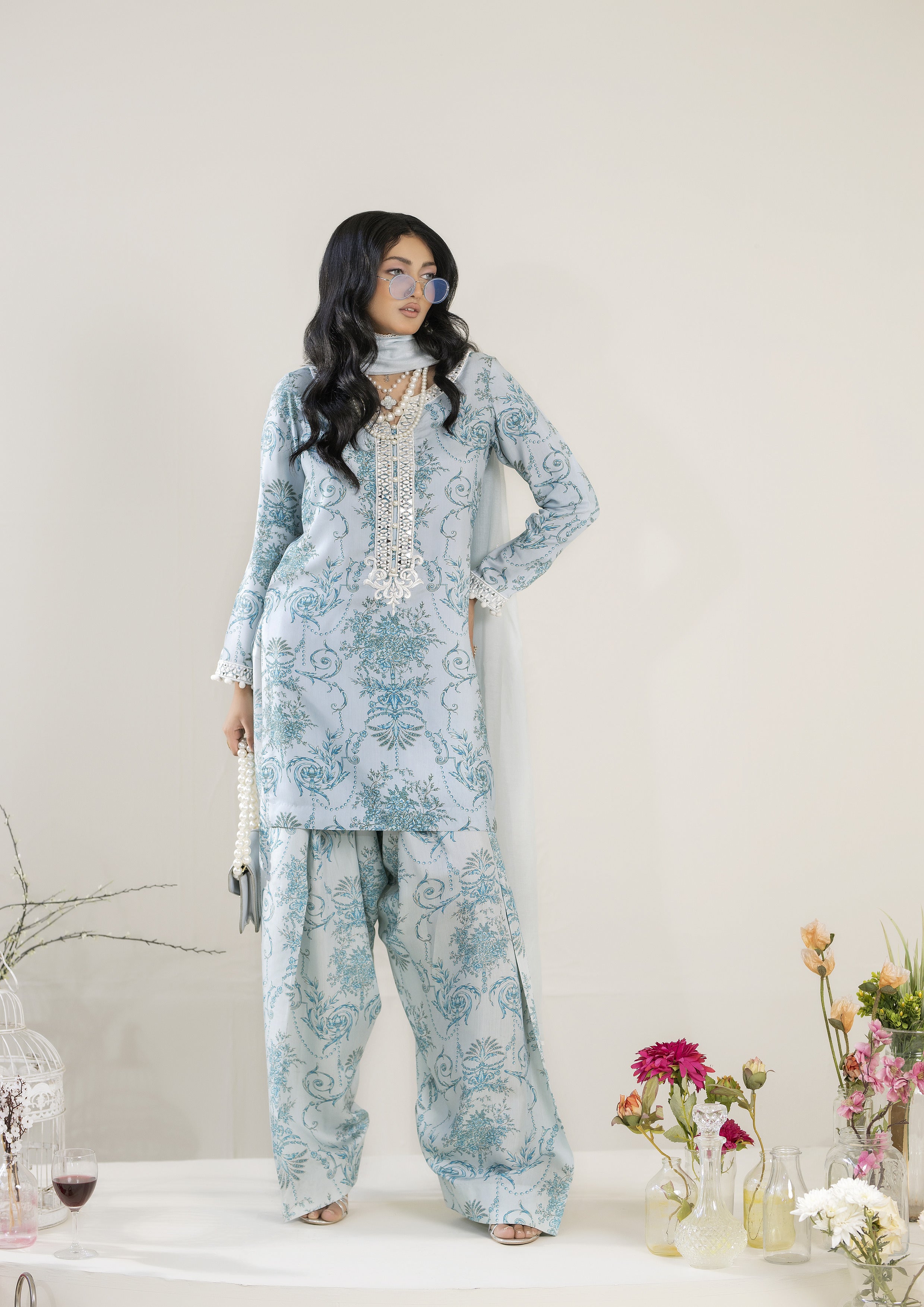 Capture the essence of the season with your new favorite traditional shalwar qameez! This all-over printed cotton silk shalwar qameez features a refreshing blue palette, complemented by beautifully embroidered sheesha work on the neckline and sleeves, giving it an elegant touch. It’s perfectly paired with a farsi shalwar.