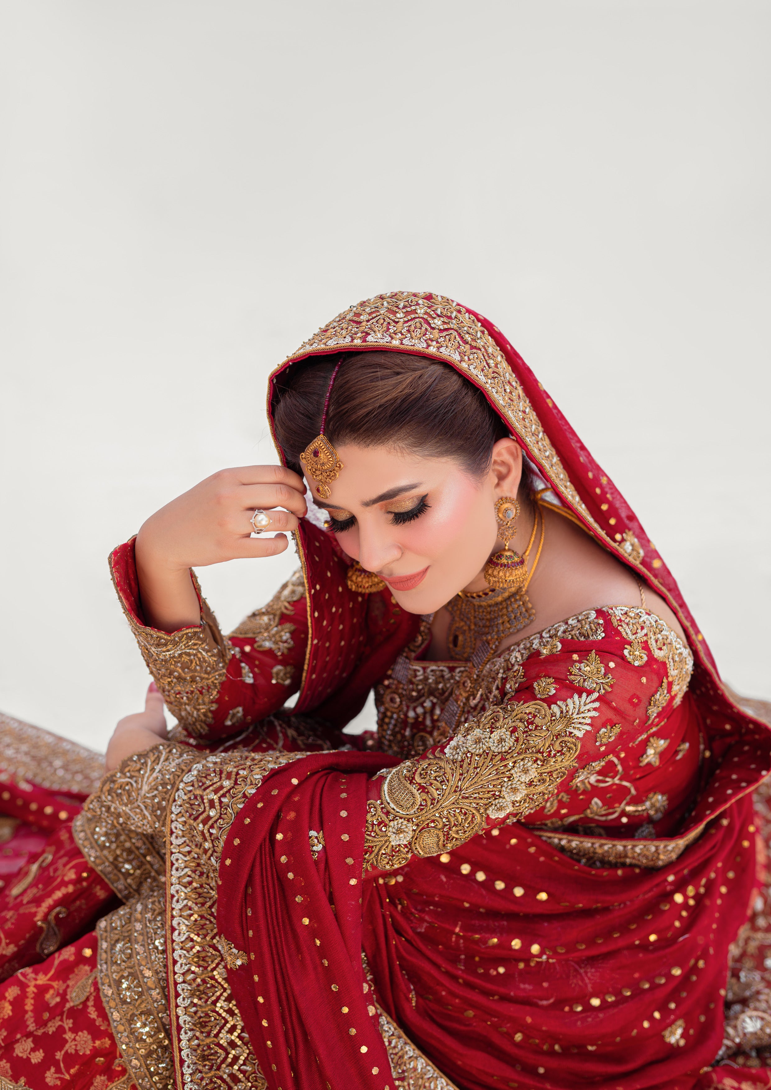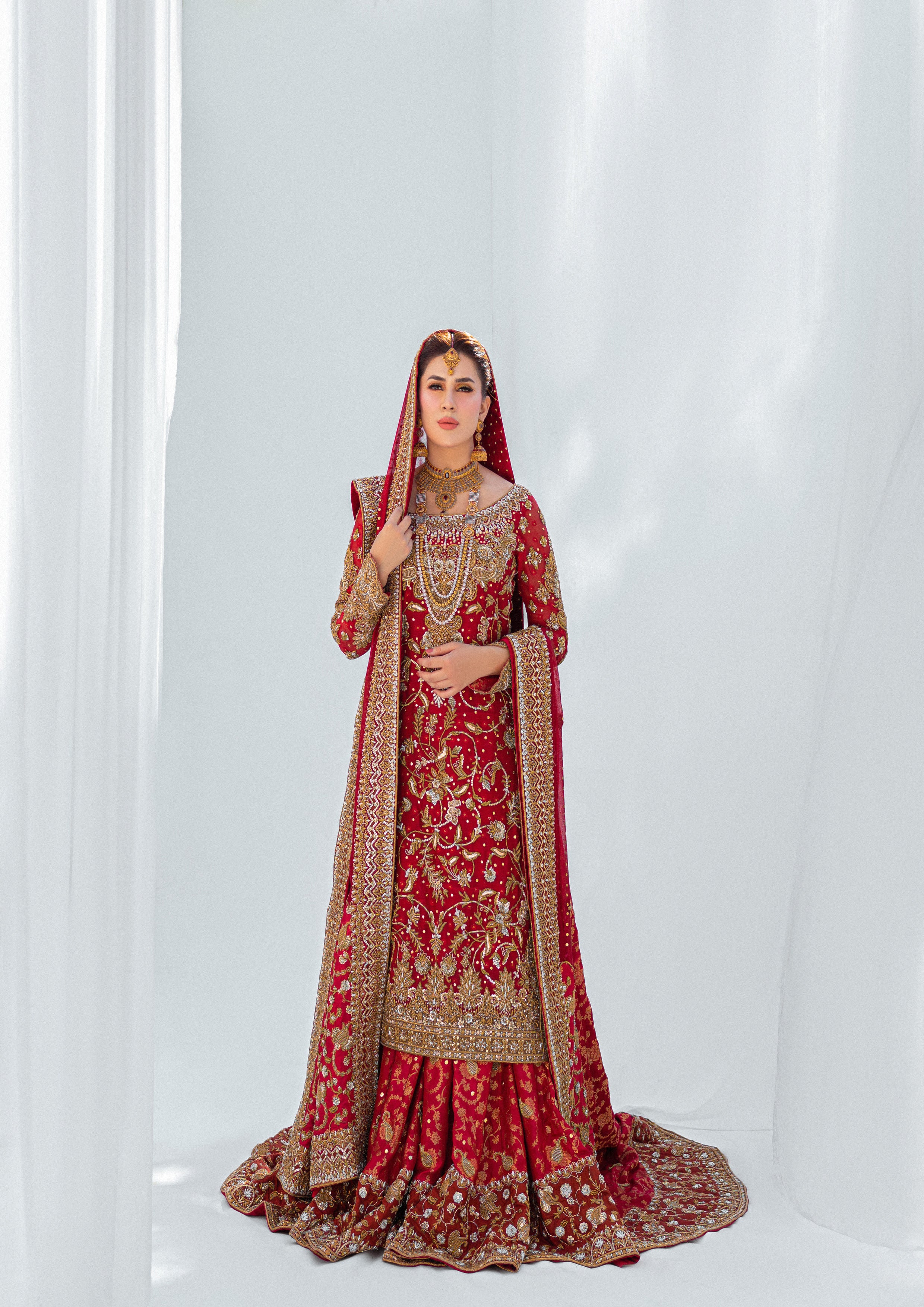 Ndulge in opulence with this deep red bridal ensemble, featuring intricate hand-crafted zardozi work on a luxurious khaddi net shirt. Paired with a rich banarsi lehenga and a khaddi net dupatta, adorned with quora, dabka, and detailed jaal borders, this look embodies the essence of timeless bridal elegance.