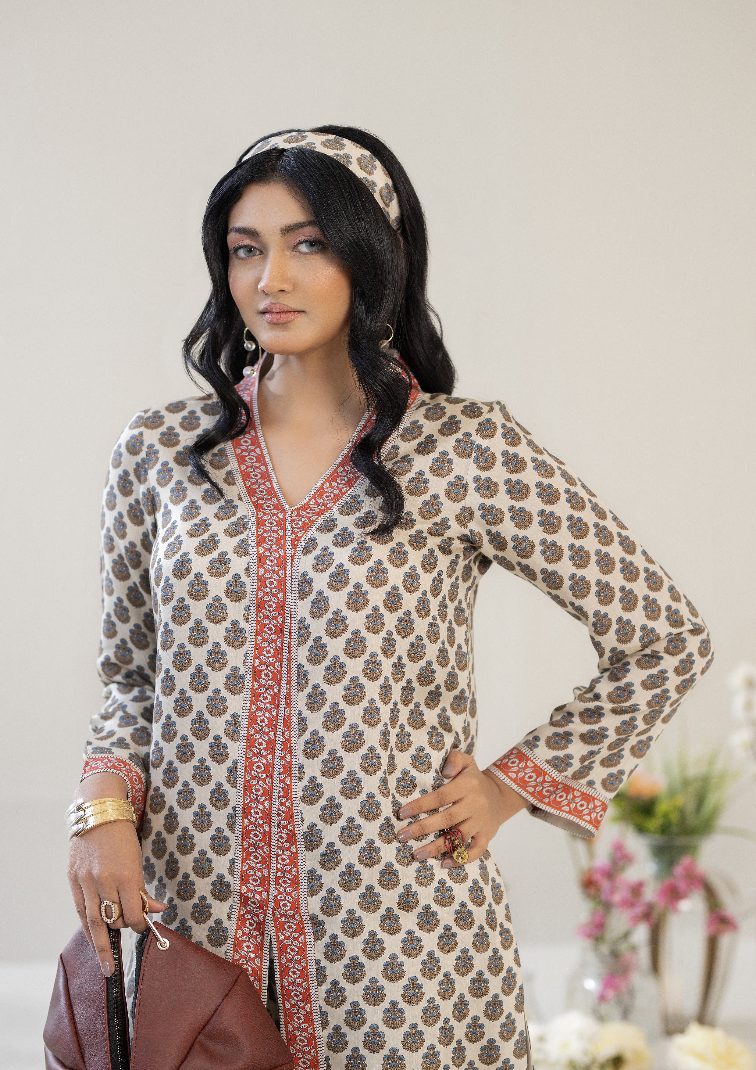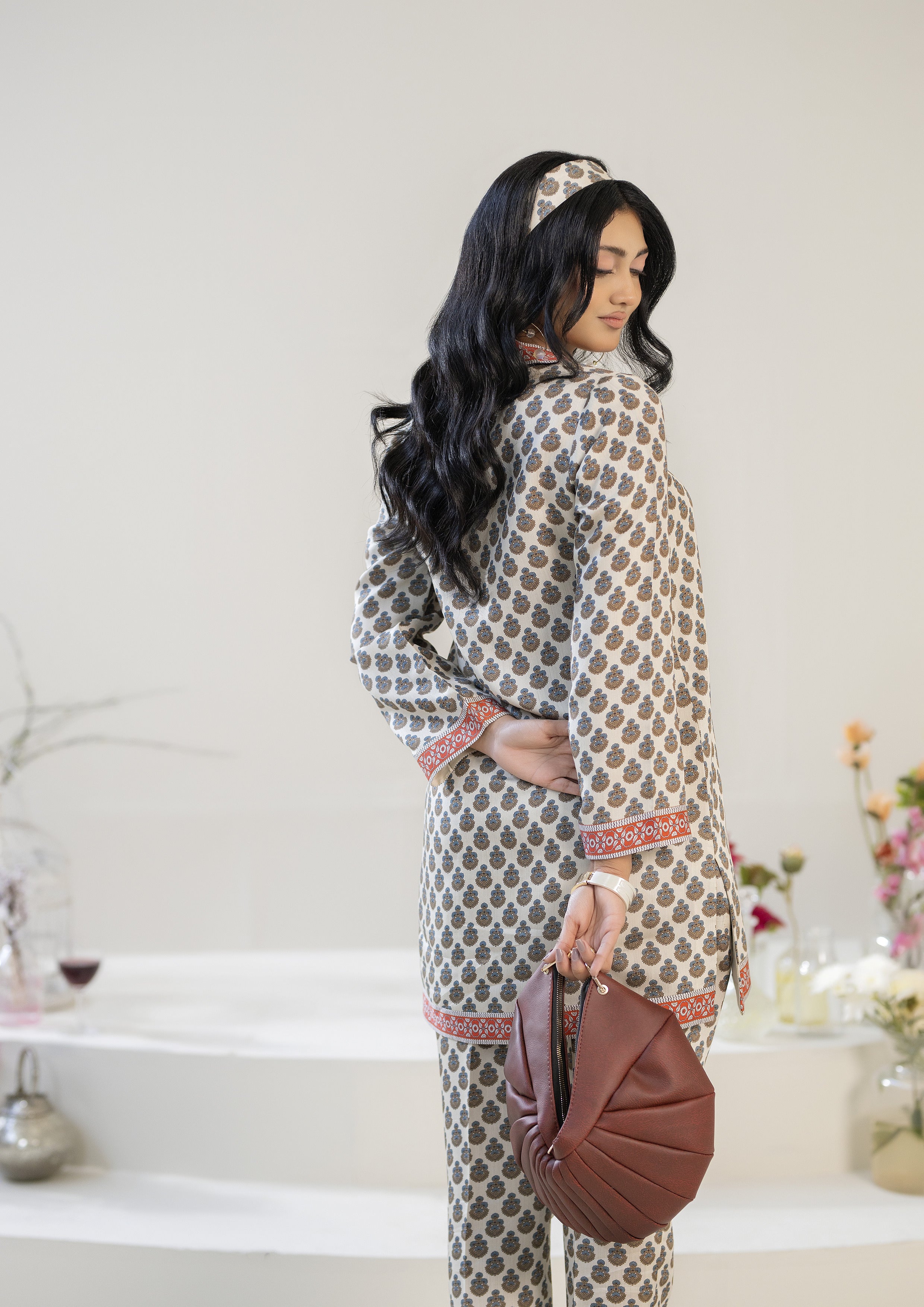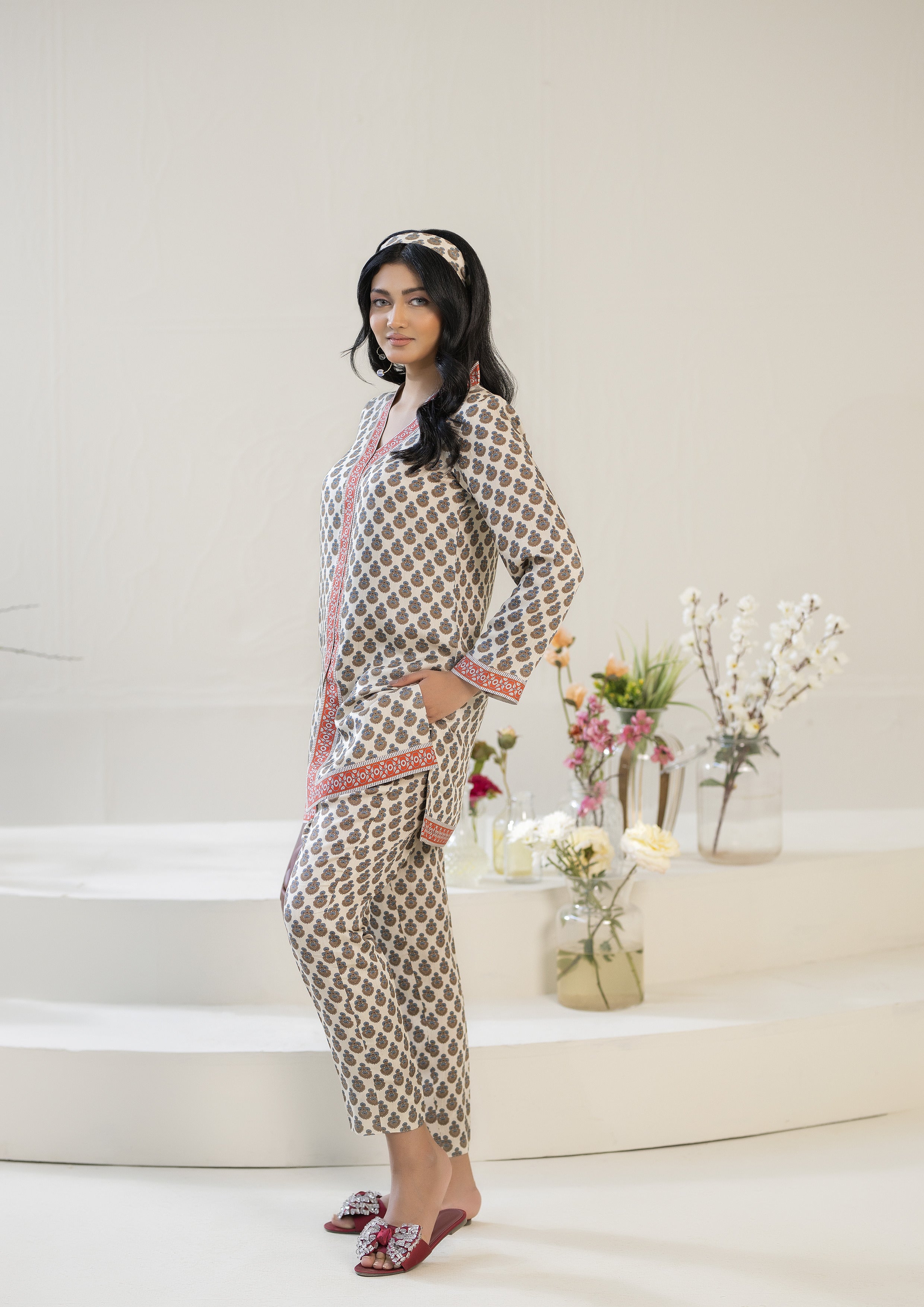 Overflowing with delightful prints in sweet hues, complemented by a strikingly contrasting printed border! This cotton net printed co-ord set exudes a refined vibe.