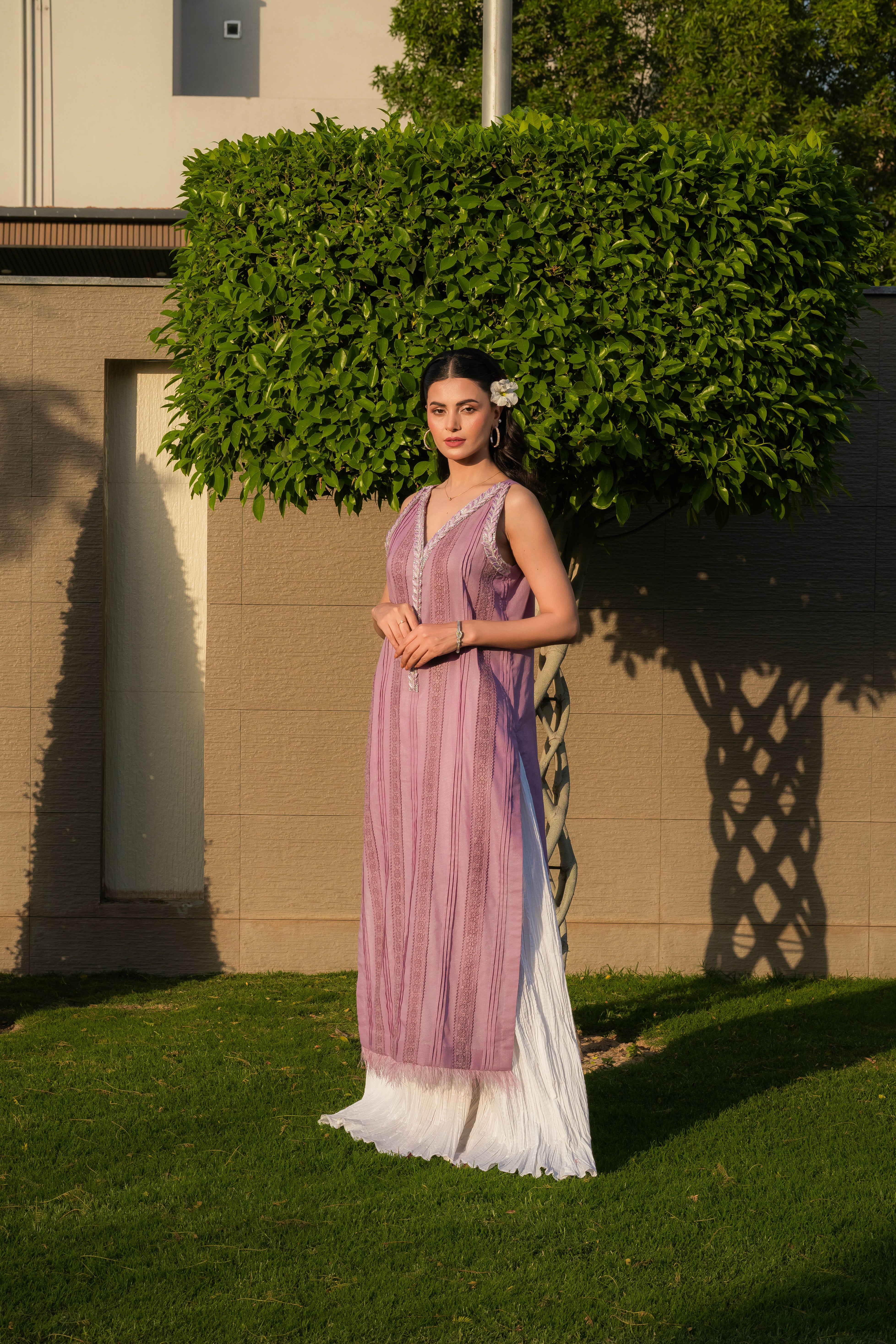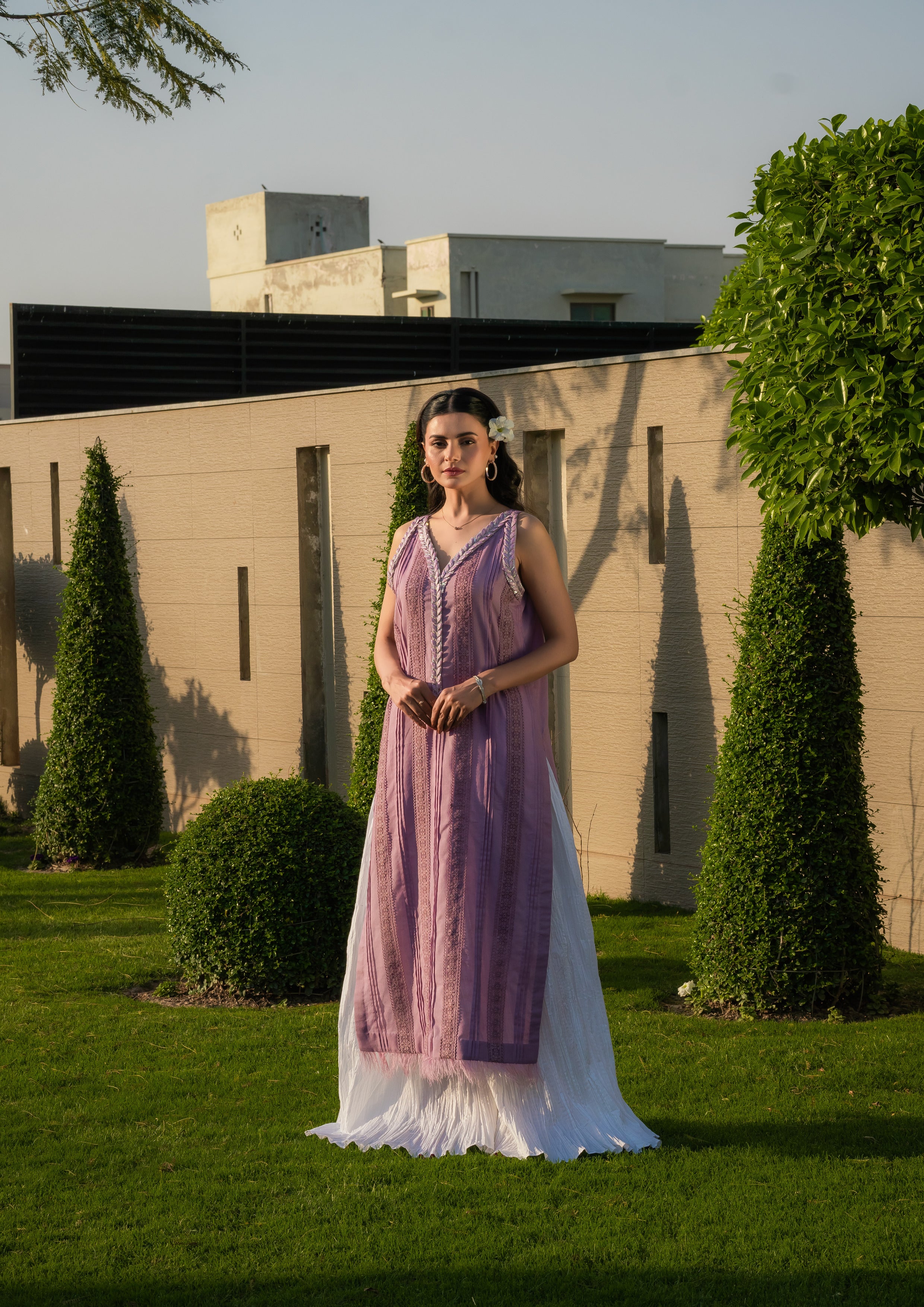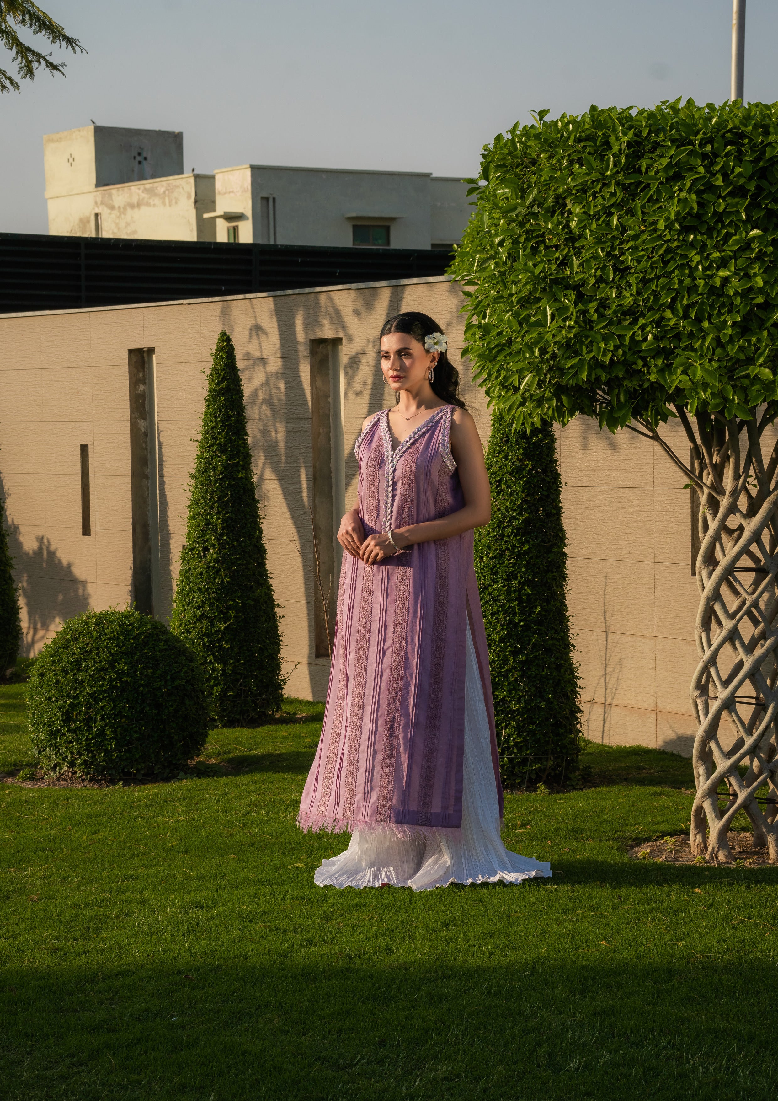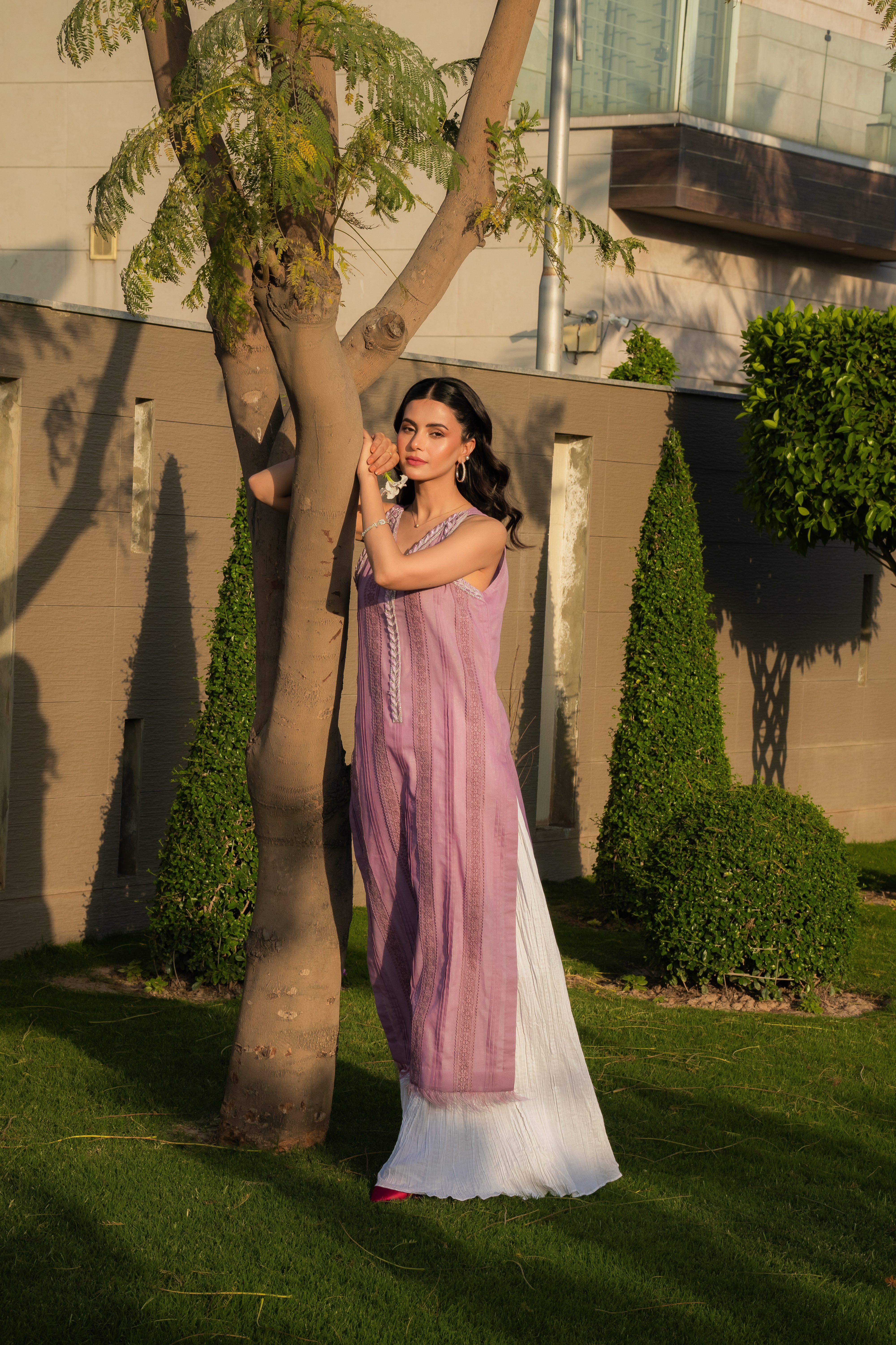 Indulge in the ethereal beauty of our lilac slub lawn outfit, exquisitely adorned with intricate embroidery and delicate embellishments along the neckline. Paired flawlessly with crushed sharara pants, this ensemble is a captivating blend of elegance and grace. Organza dopatta with sequins embellishment or plain chiffon dopatta with plain fabric edging.