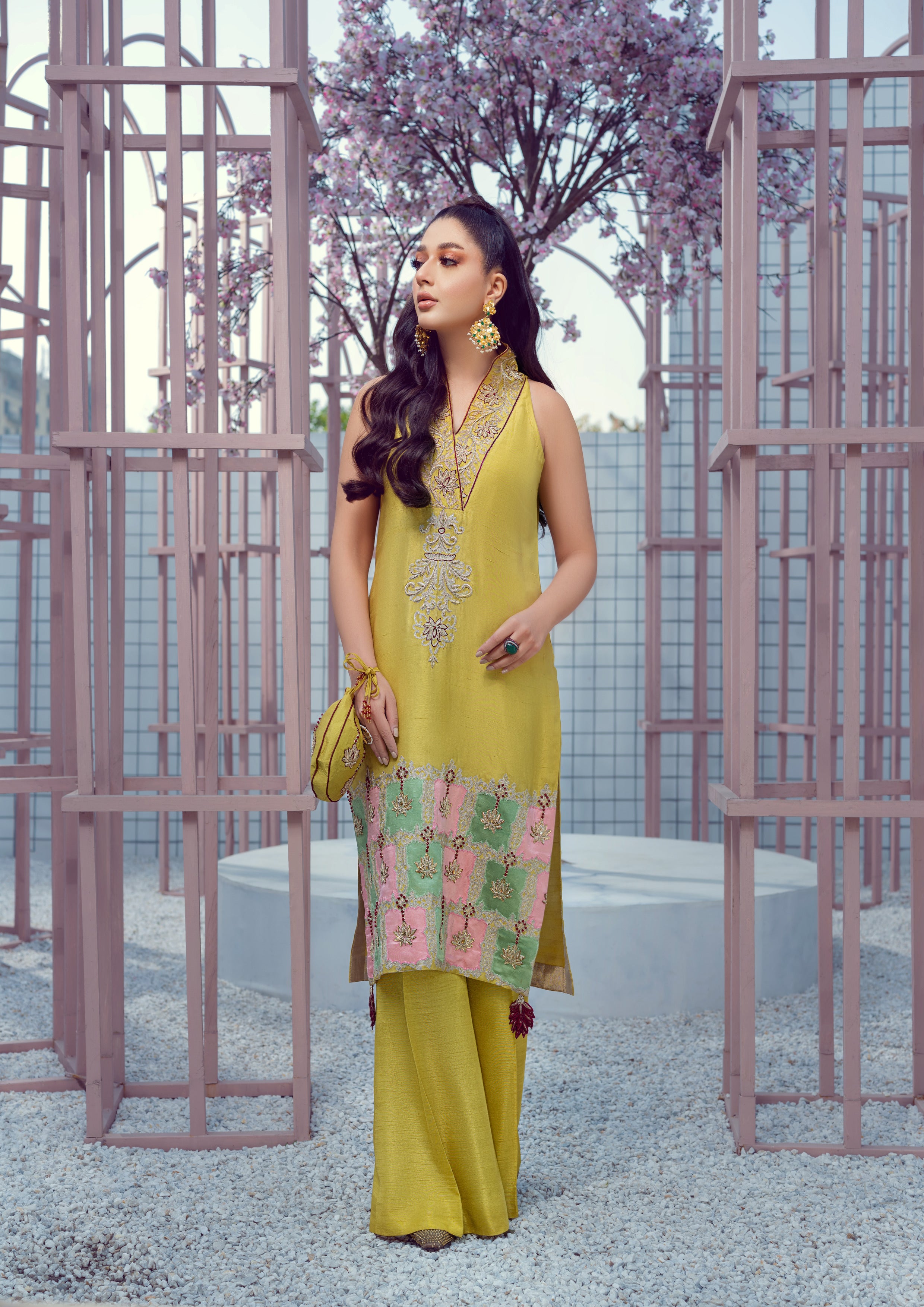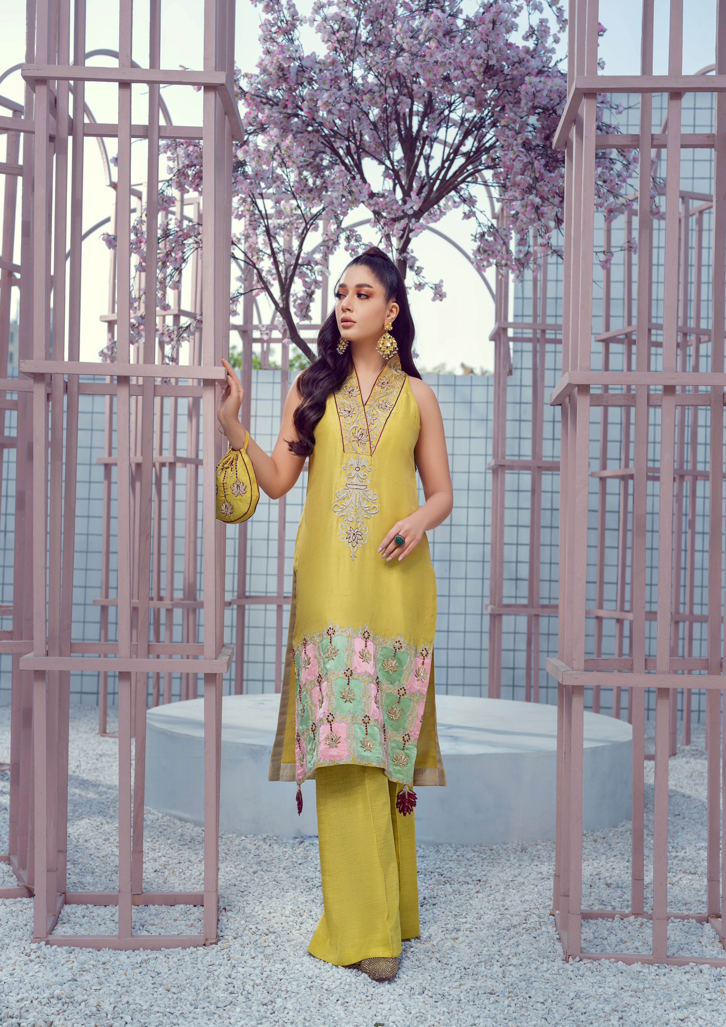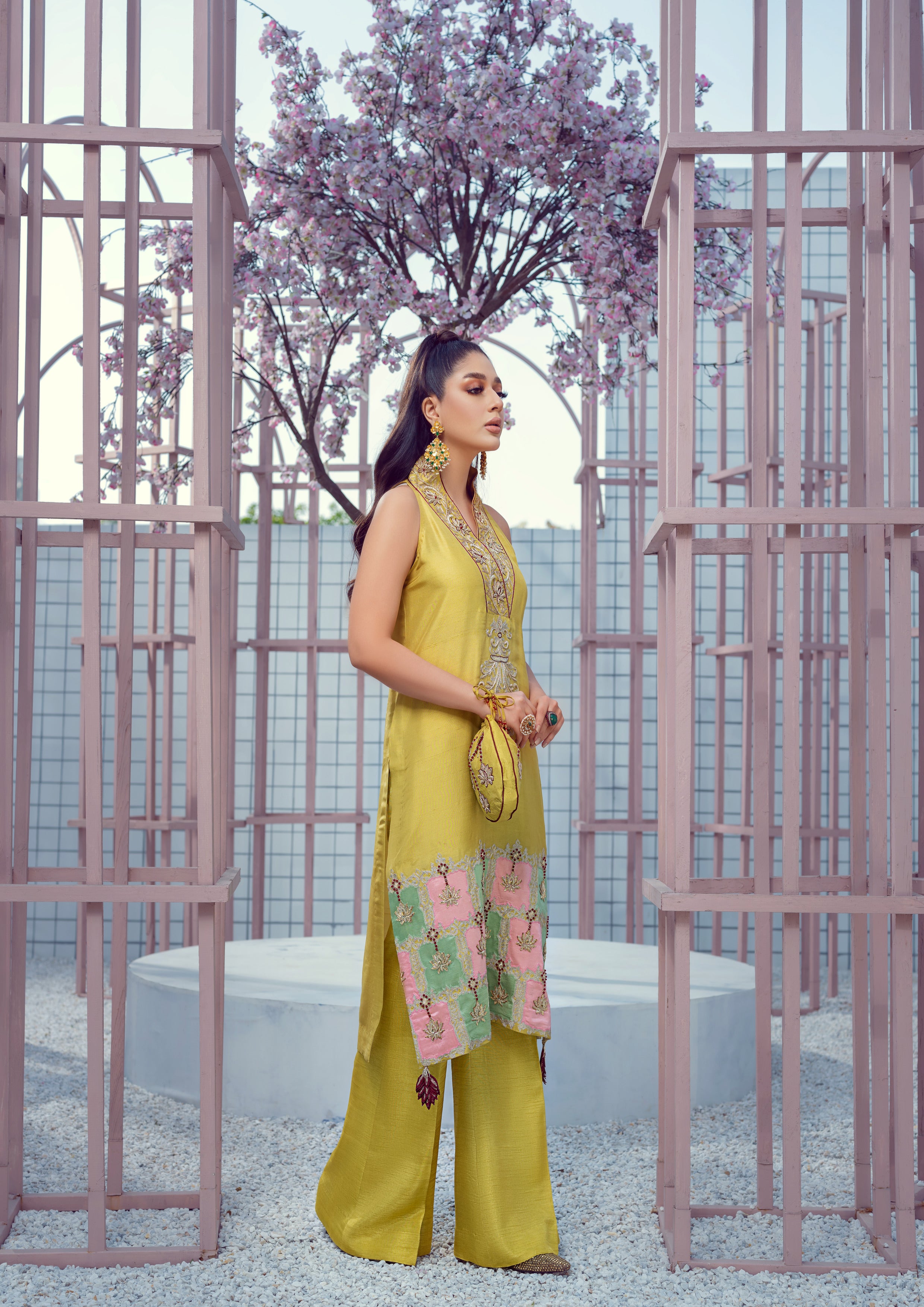 Our Lemon Mojito feels like the epitome of a refreshing cocktail. Each element is specifically designed to blend in with the weather induced pangs of style and gratification. Made on rawsilk, our expert craftsmen have put in some beautiful designs of patchwork embroidery and finishings in gold and trendy colors. The mesmerising effect is completed with pants in the same fabric.