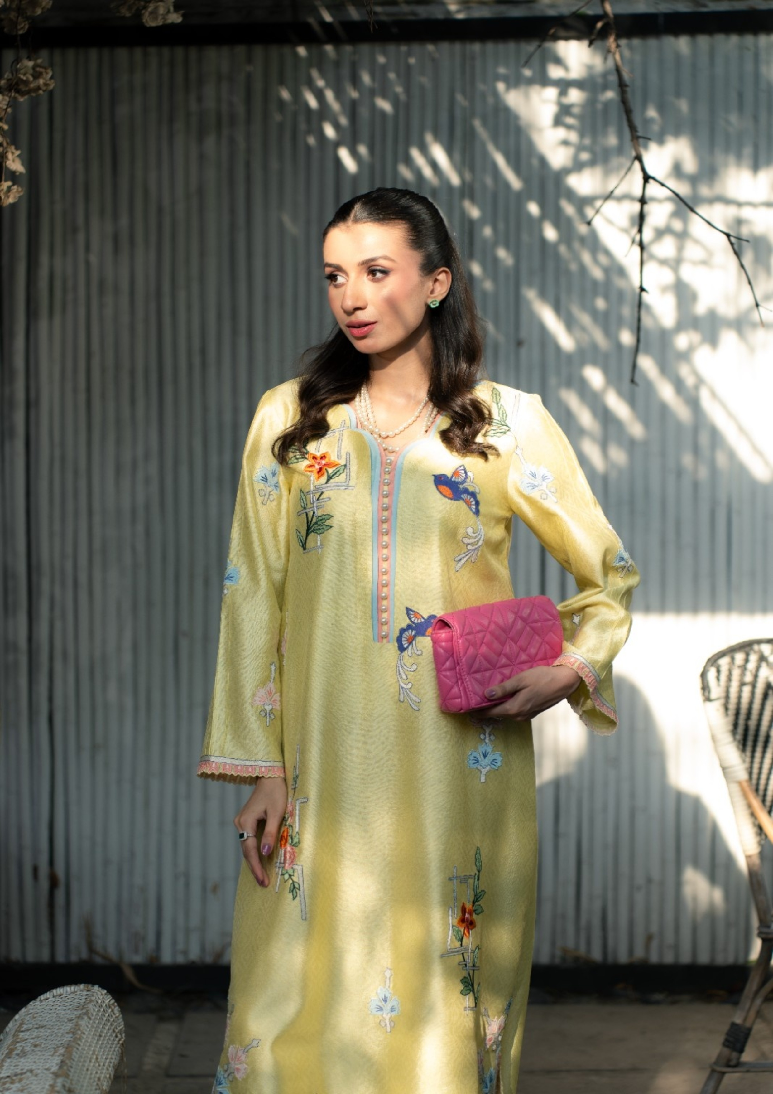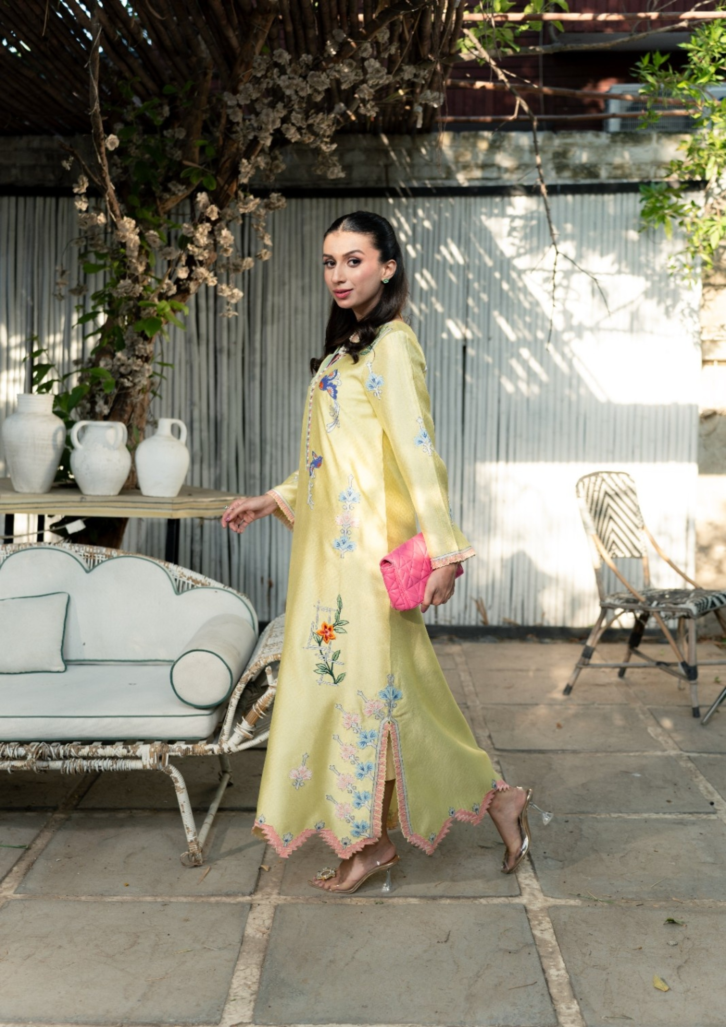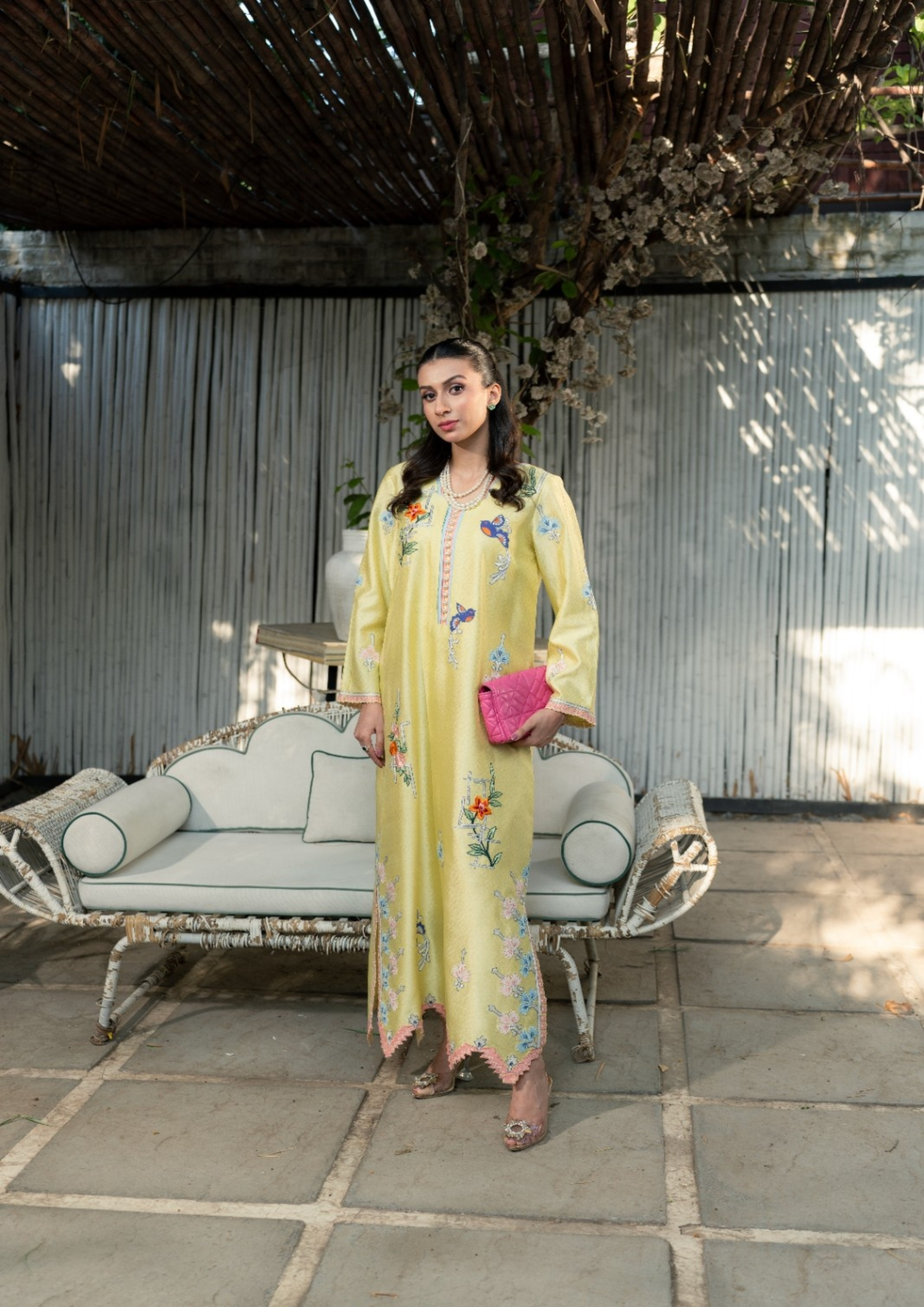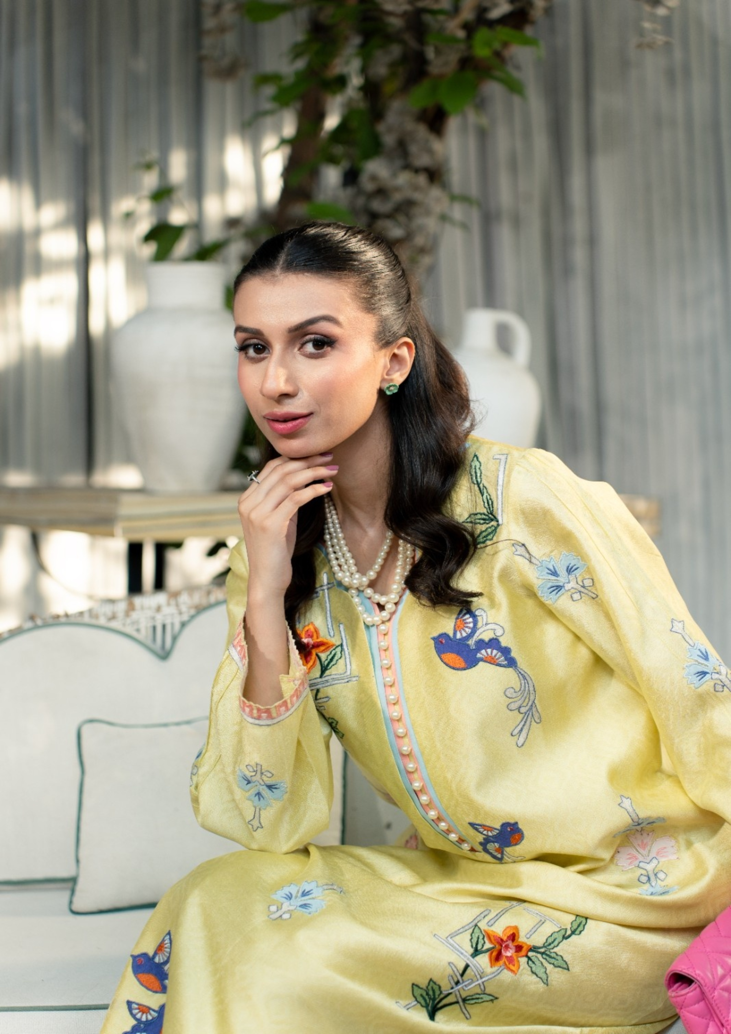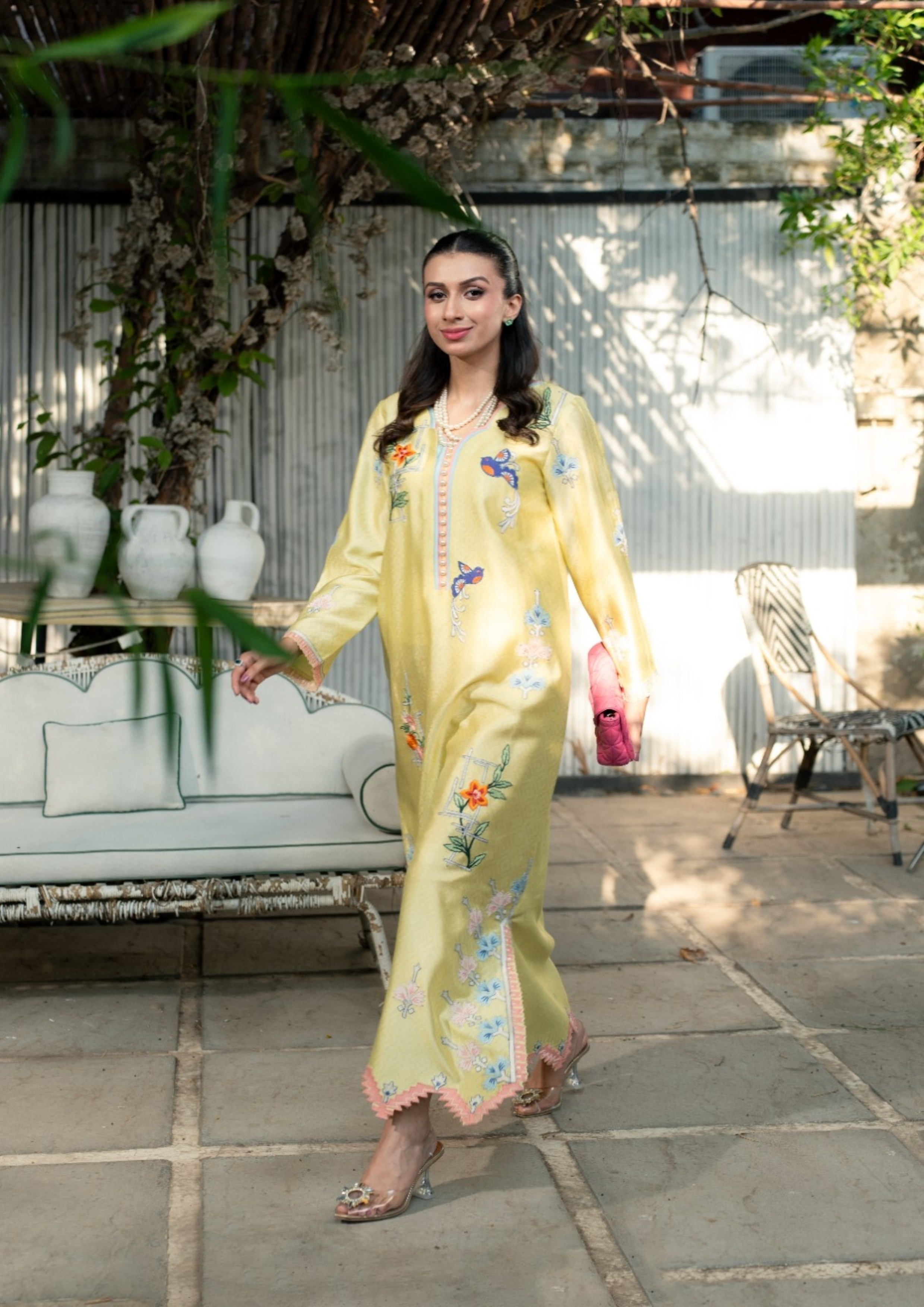 Basking in the richness of a lime yellow tissue silk kaftan, this regal kaftan features intricate embroidery with vibrant florals, graceful birds, and subtle geometric patterns, blending tradition with artistry.