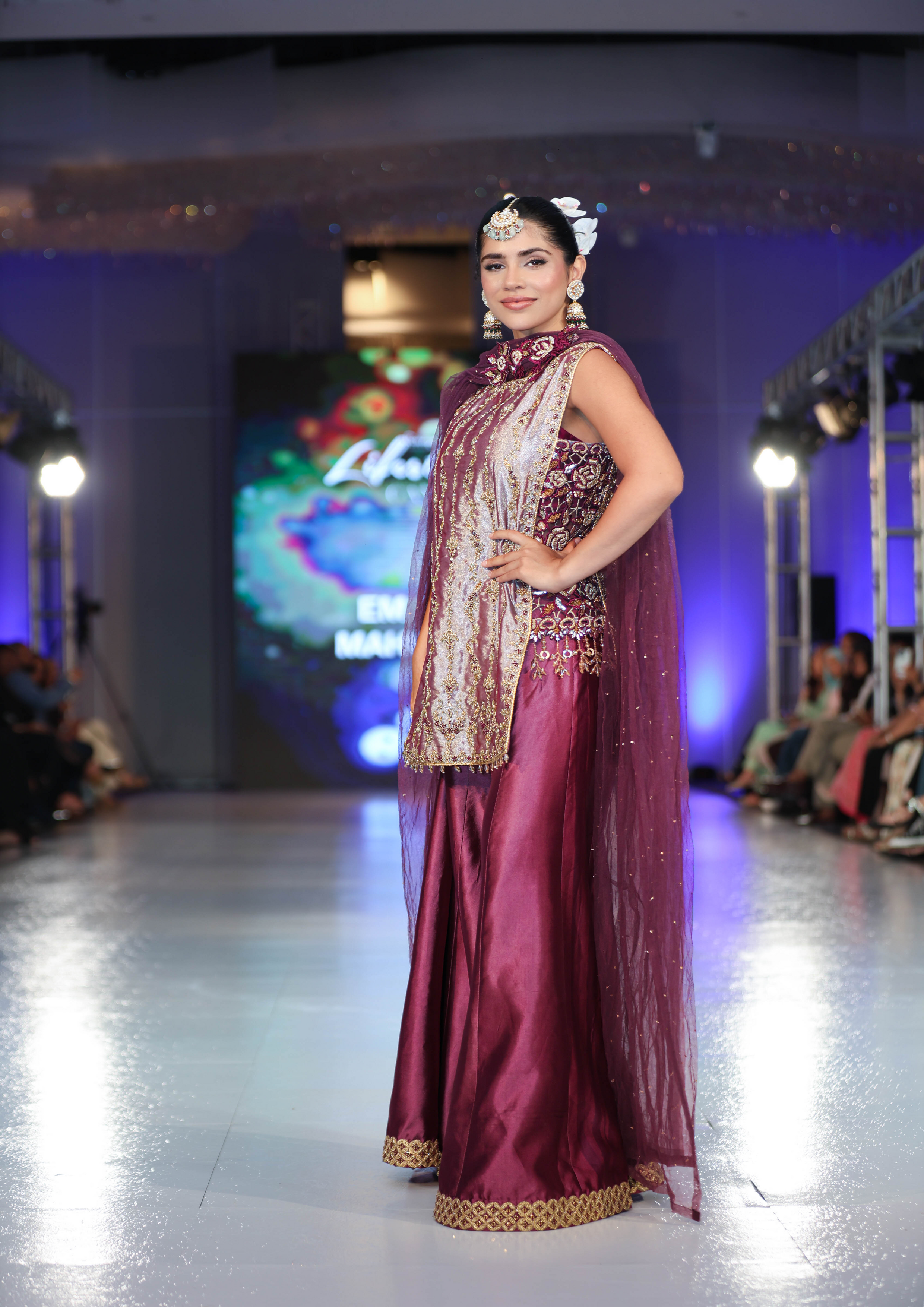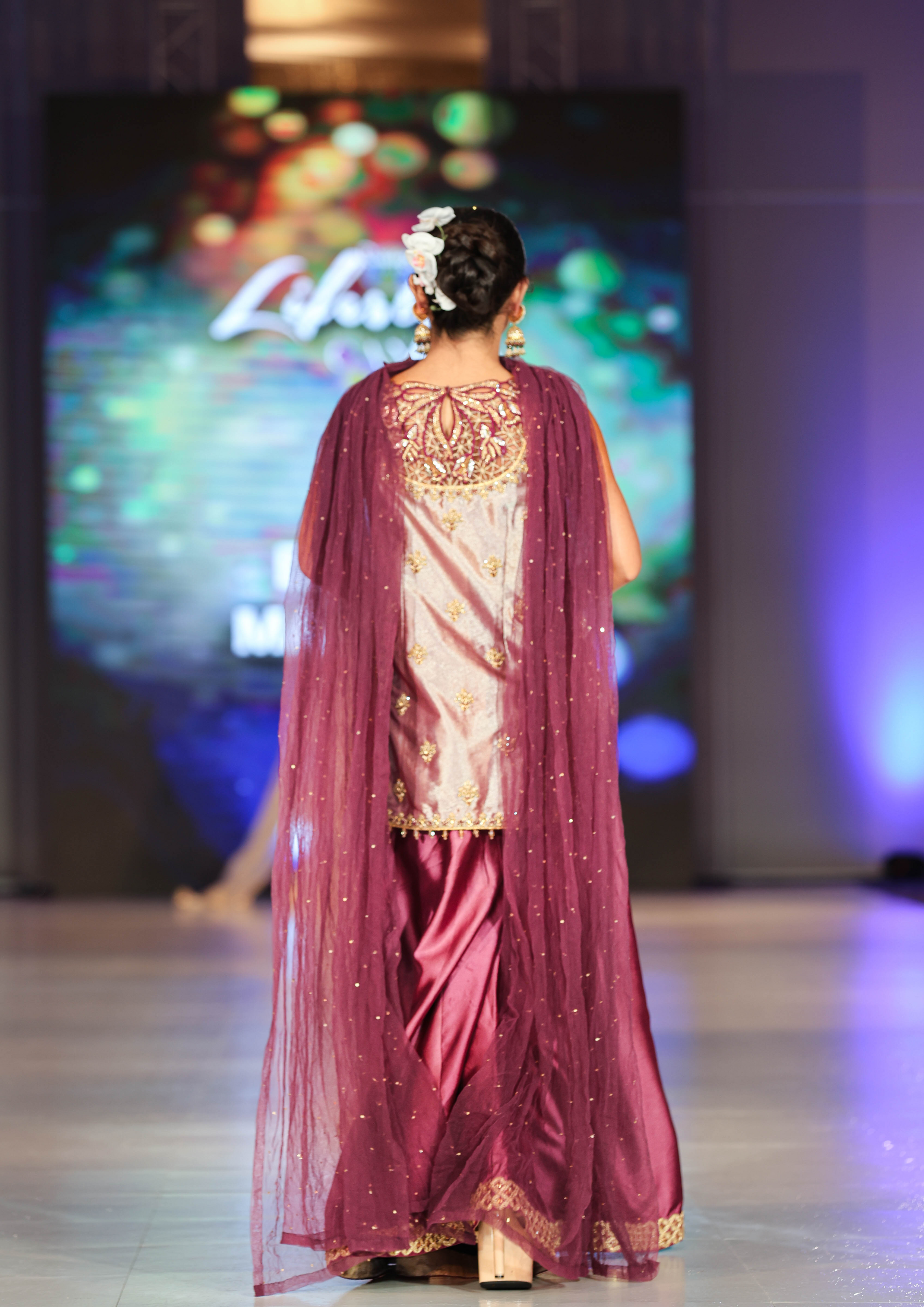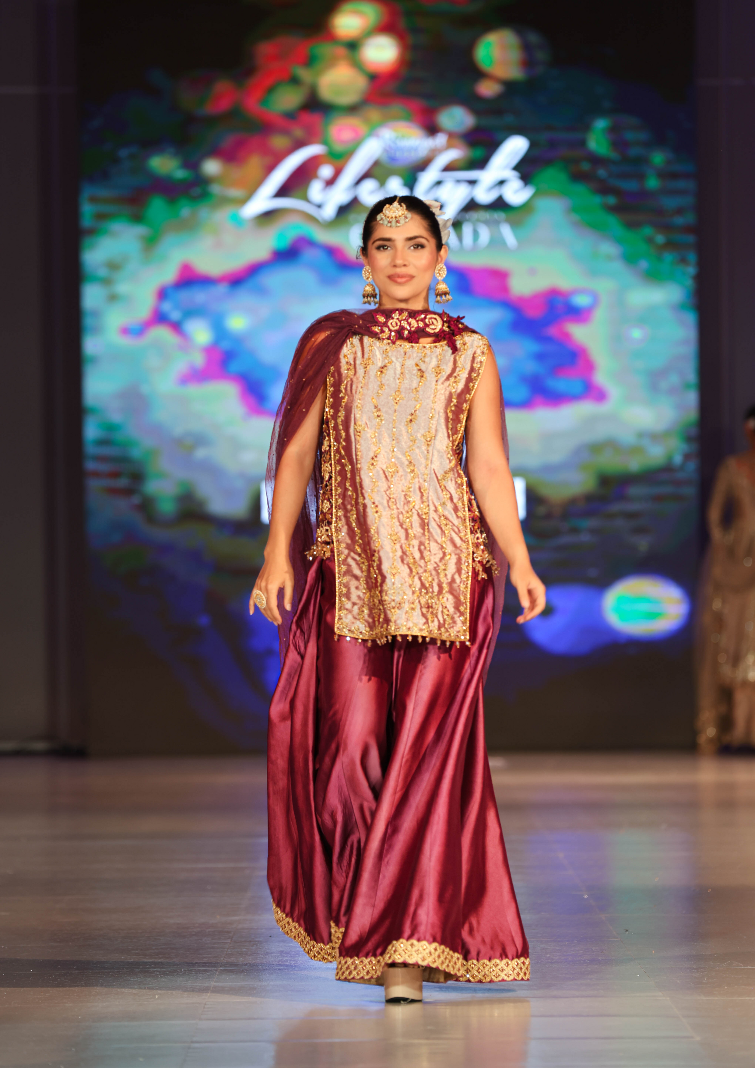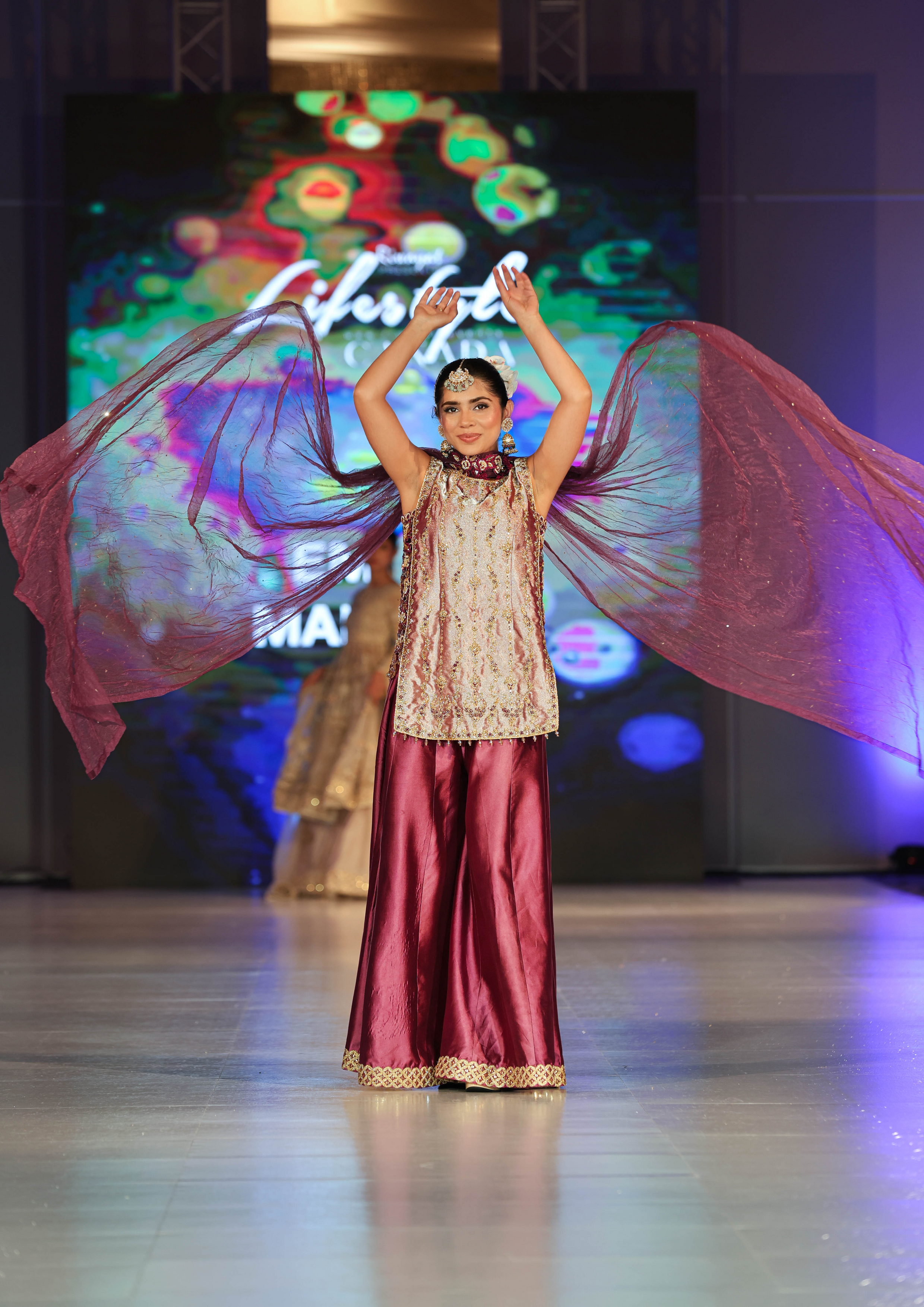 This burgundy sleeveless short shirt features exquisite hand embroidery with zardozi detailing, resham French knots, and delicate cutwork along the sides adorned with hanging tassels. It is paired with silk sharara enhanced with a tilla border and intricate hand embellishments. The look is completed with a net dupatta beautifully adorned with delicate 3D motifs.
