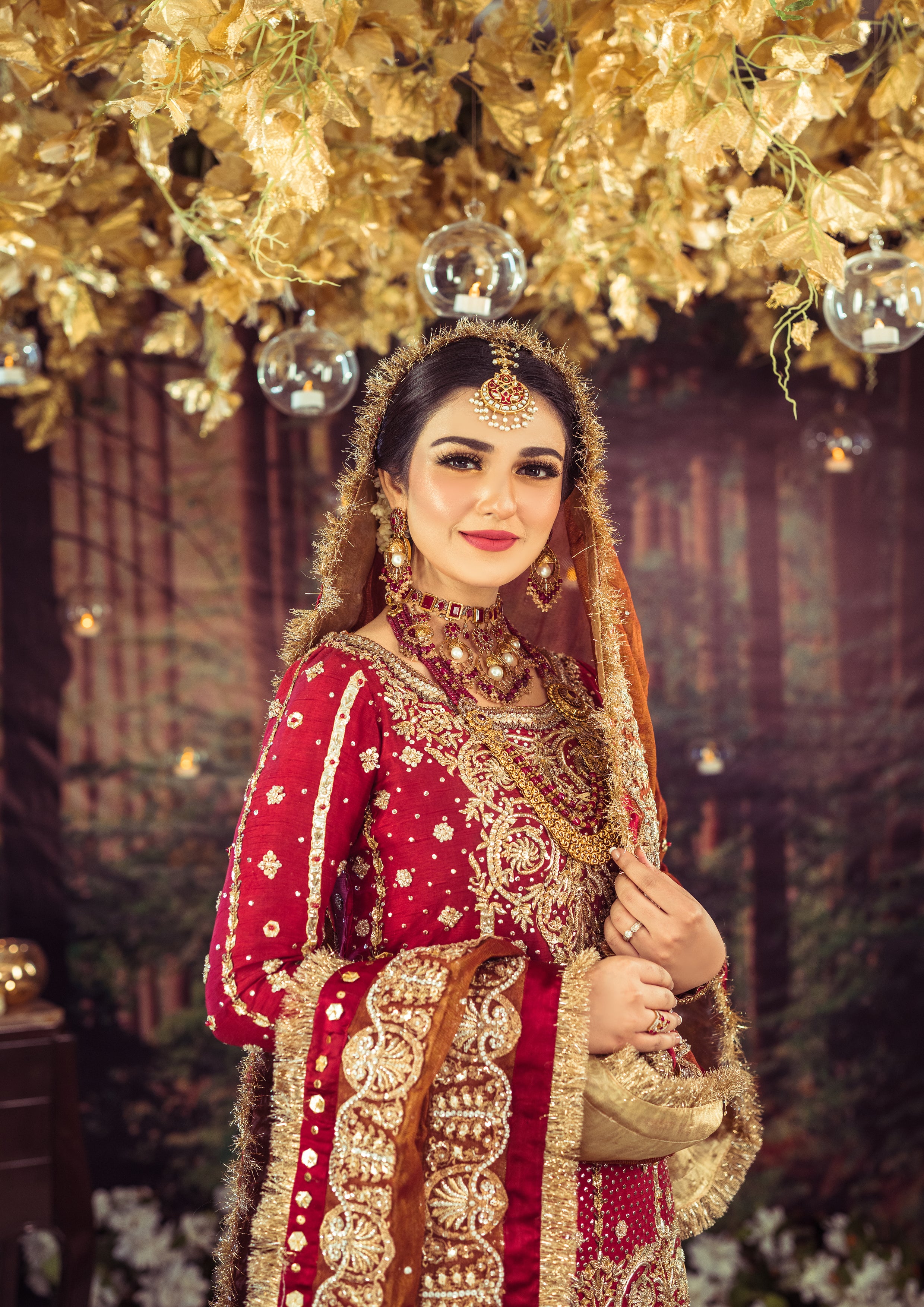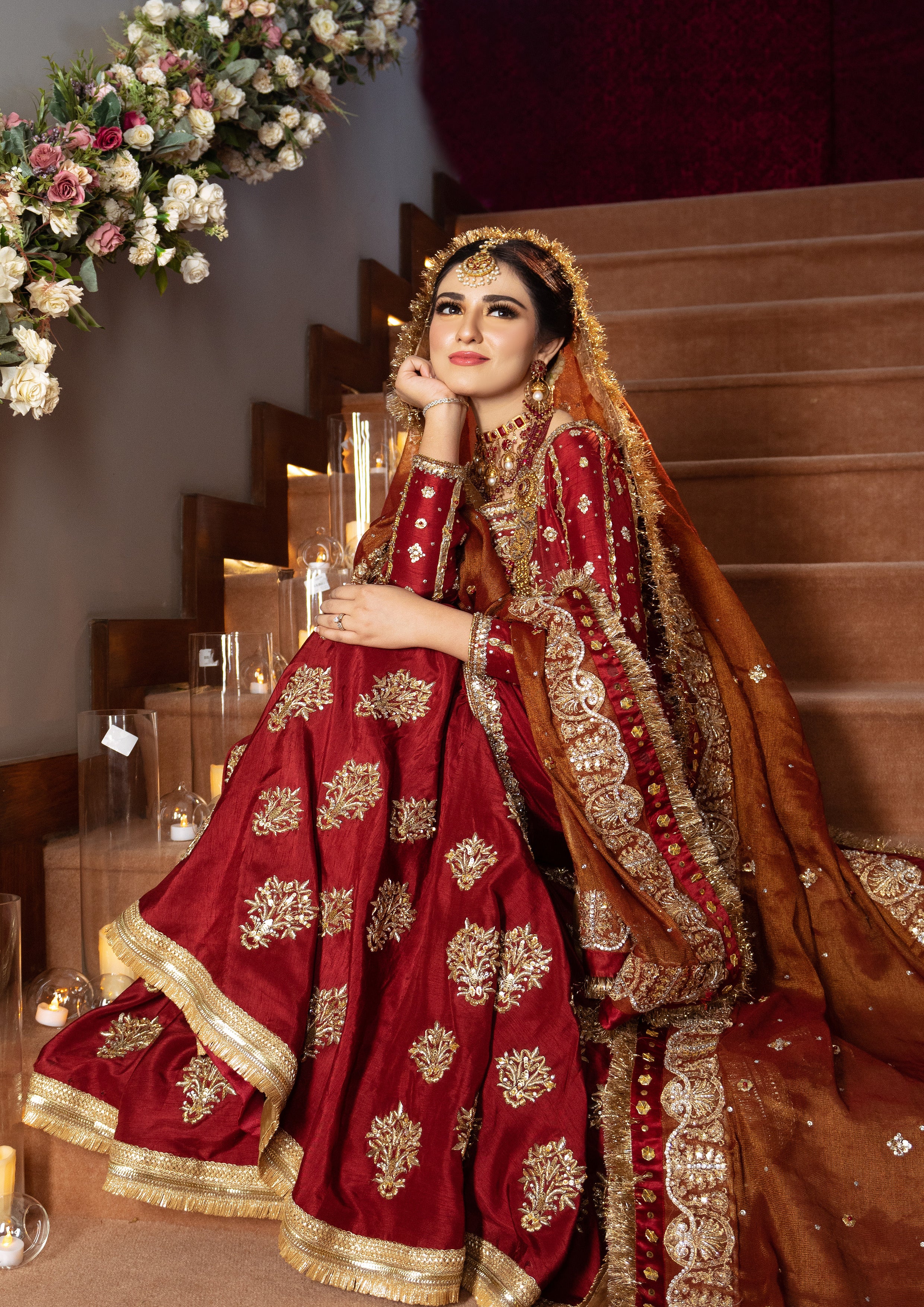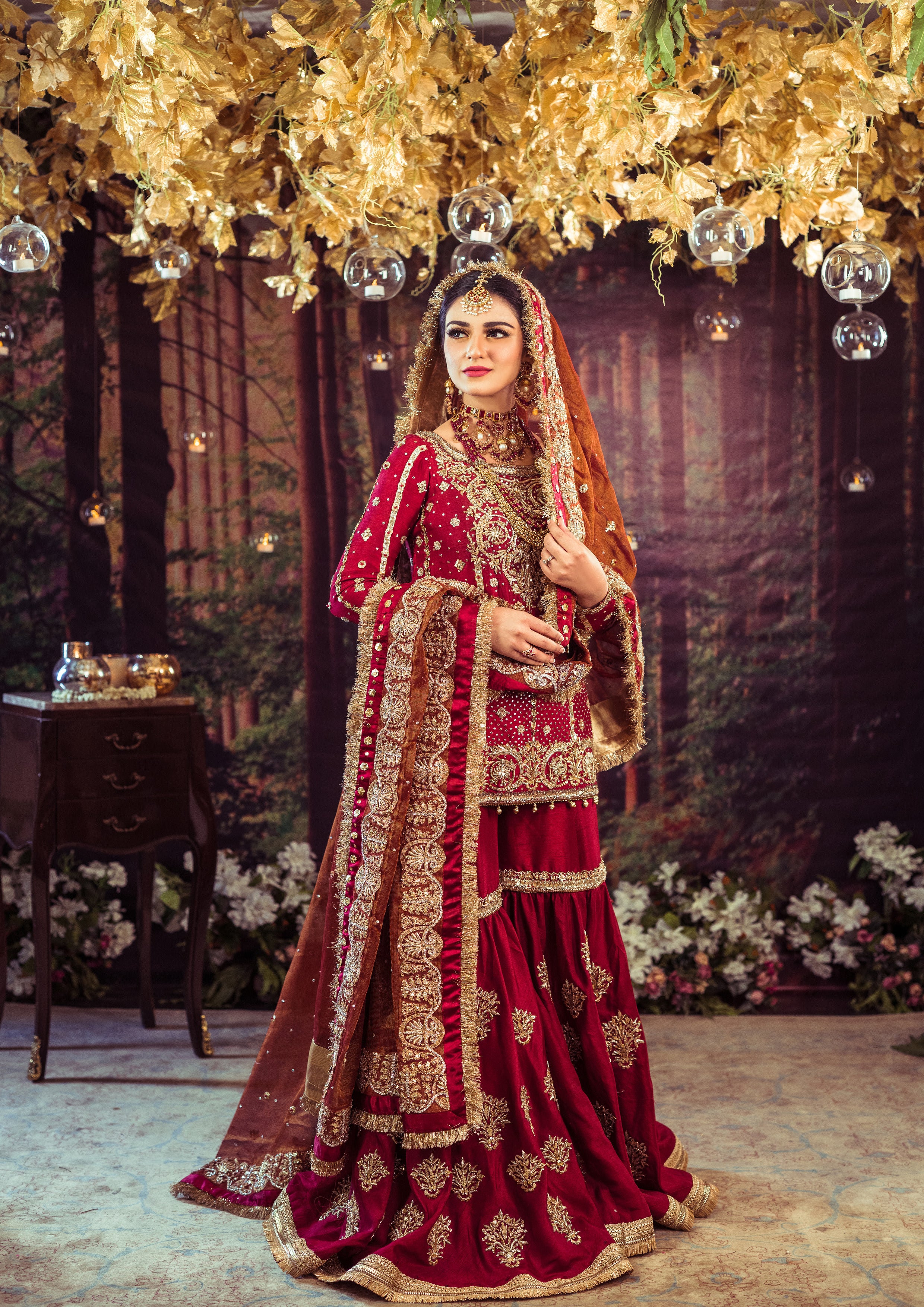Our classic maroon bridal. A rawsilk shirt paired with a beautiful rawsilk gharara, a zari net dupatta enriched with embellished details complete this bridal ensemble.
