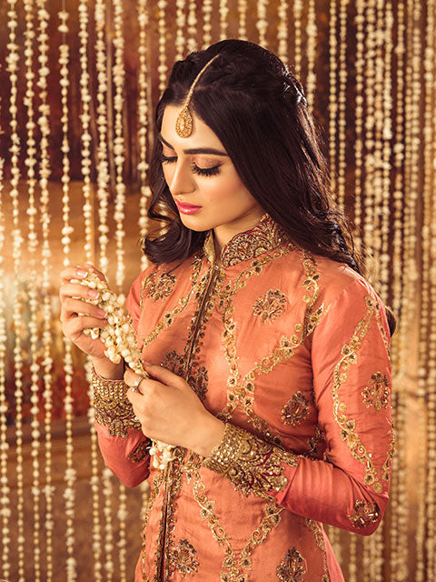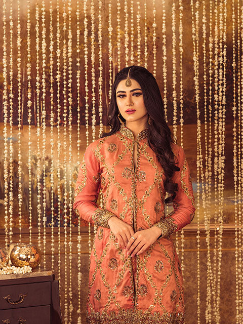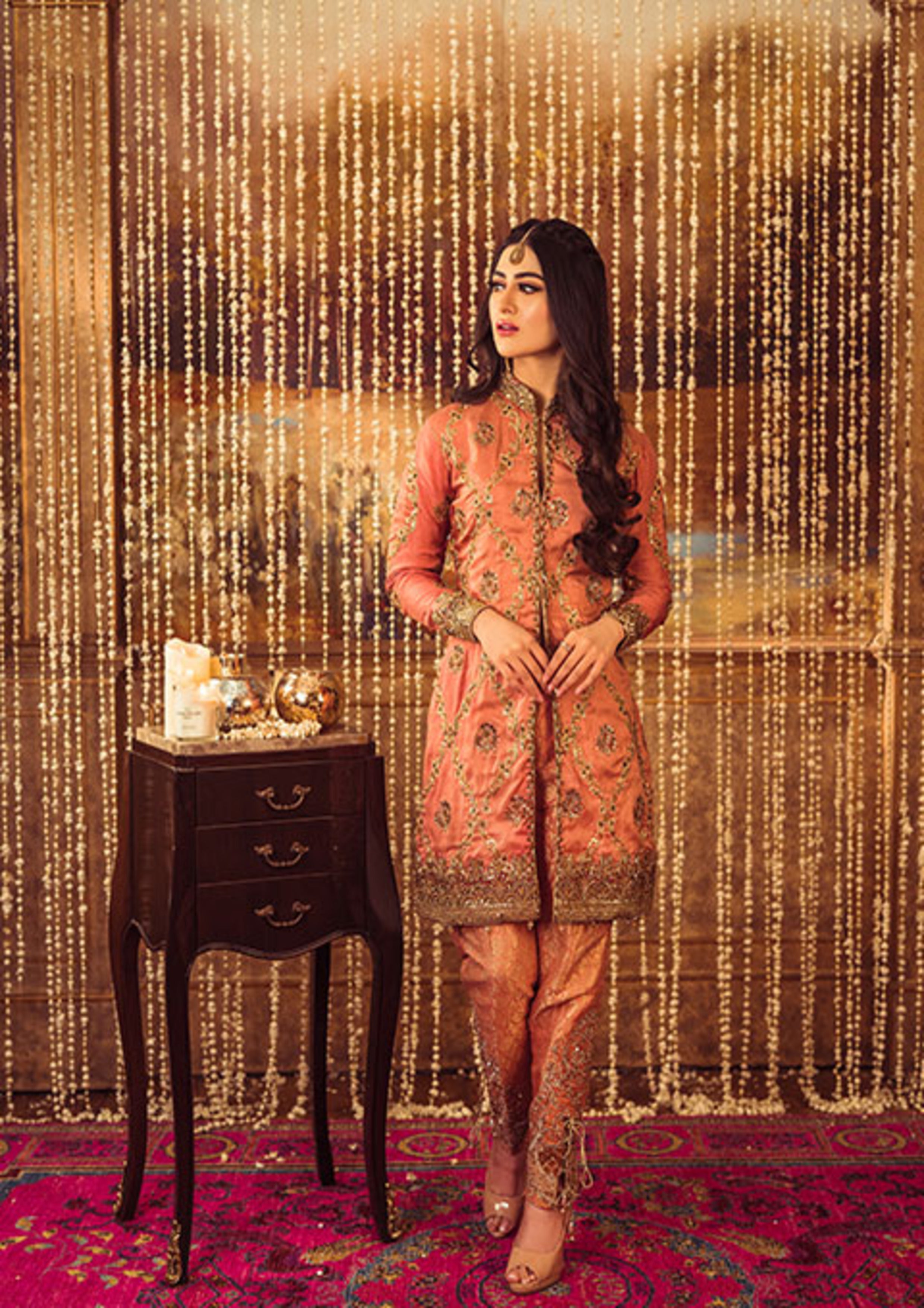 Rawsilk jacket with sequence, tilla and naqshi embellishment paired with jamawar pants.