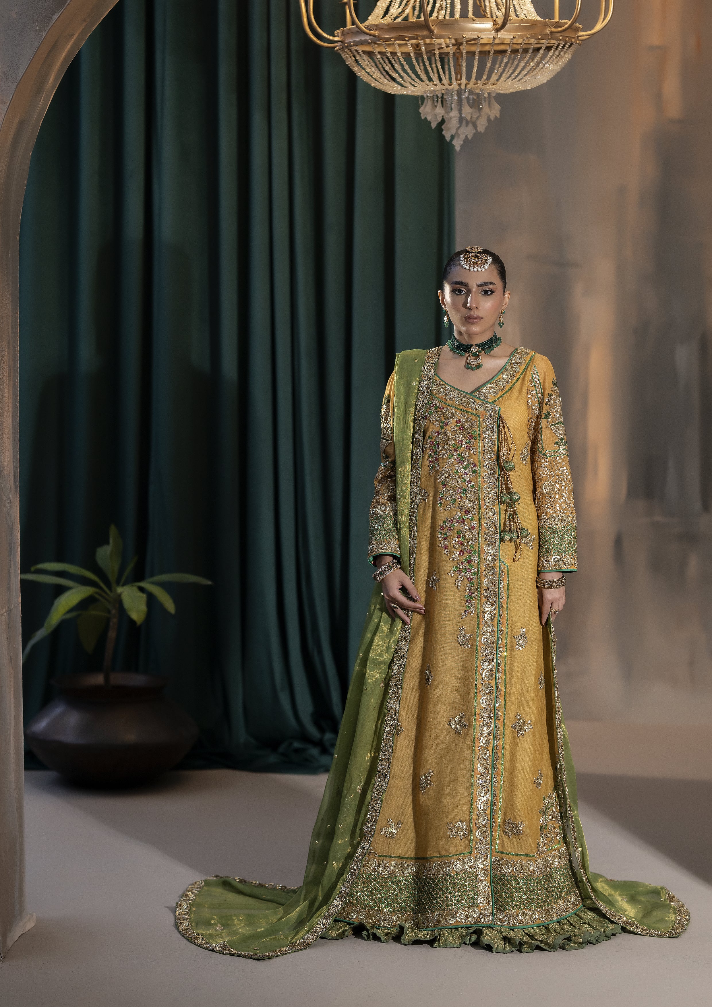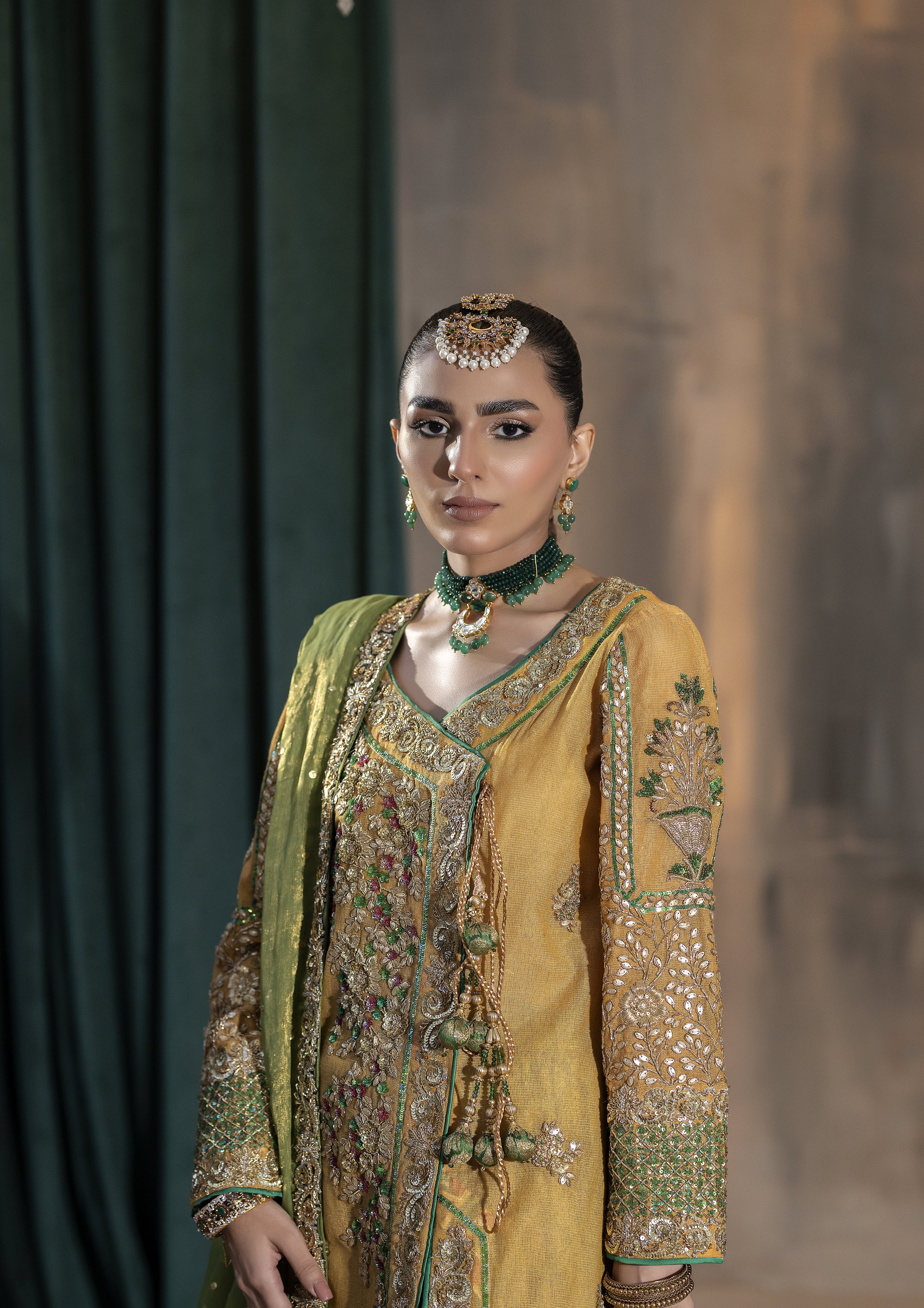 Stepping into tradition with a touch of timeless elegance . A vibrant yellow cotton net angrakha flows gracefully, complemented by a rich green jamawar gharara that speaks of heritage and artistry. The matching green dupatta adds the perfect finishing touch, creating a harmonious blend of colours and textures.