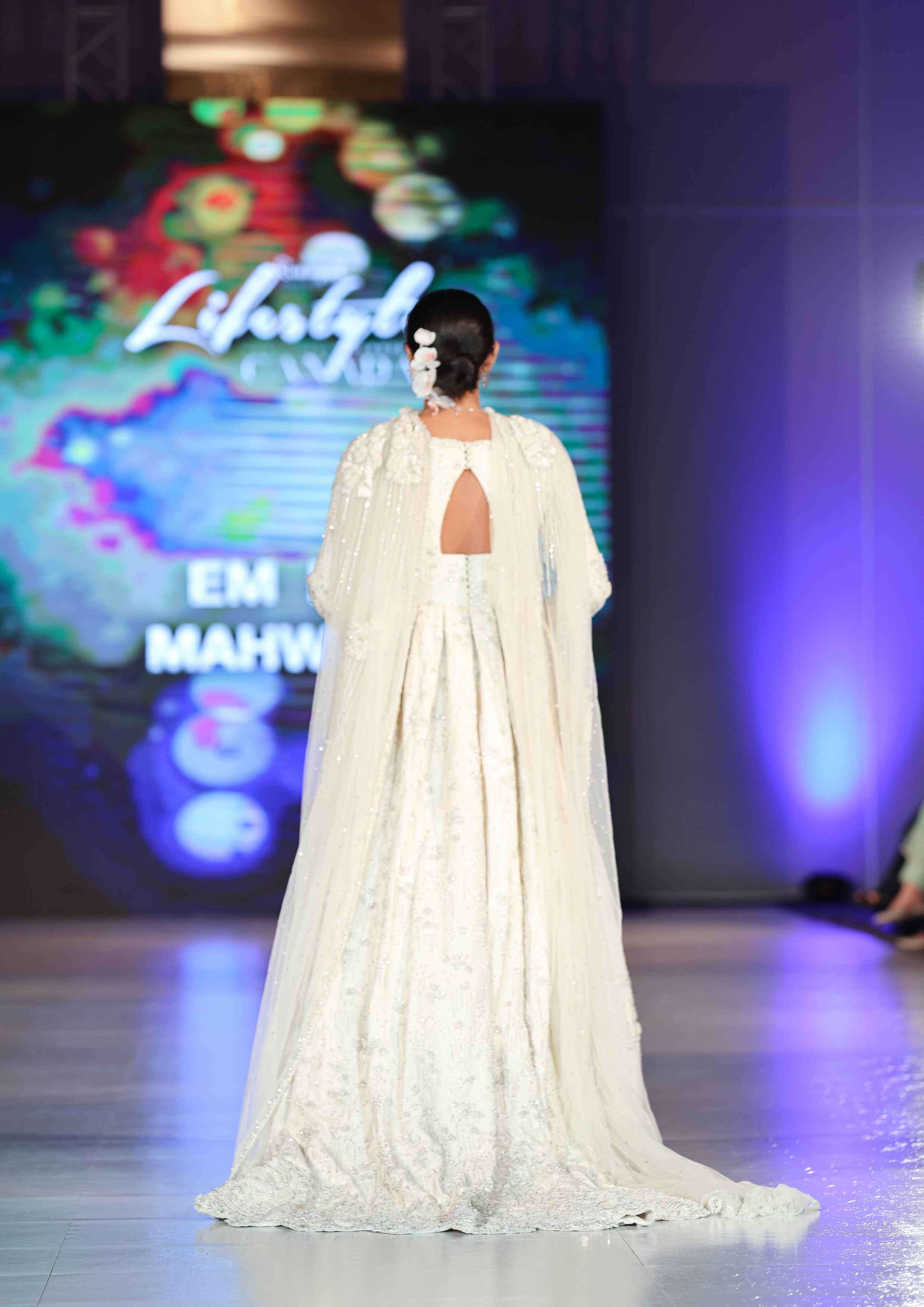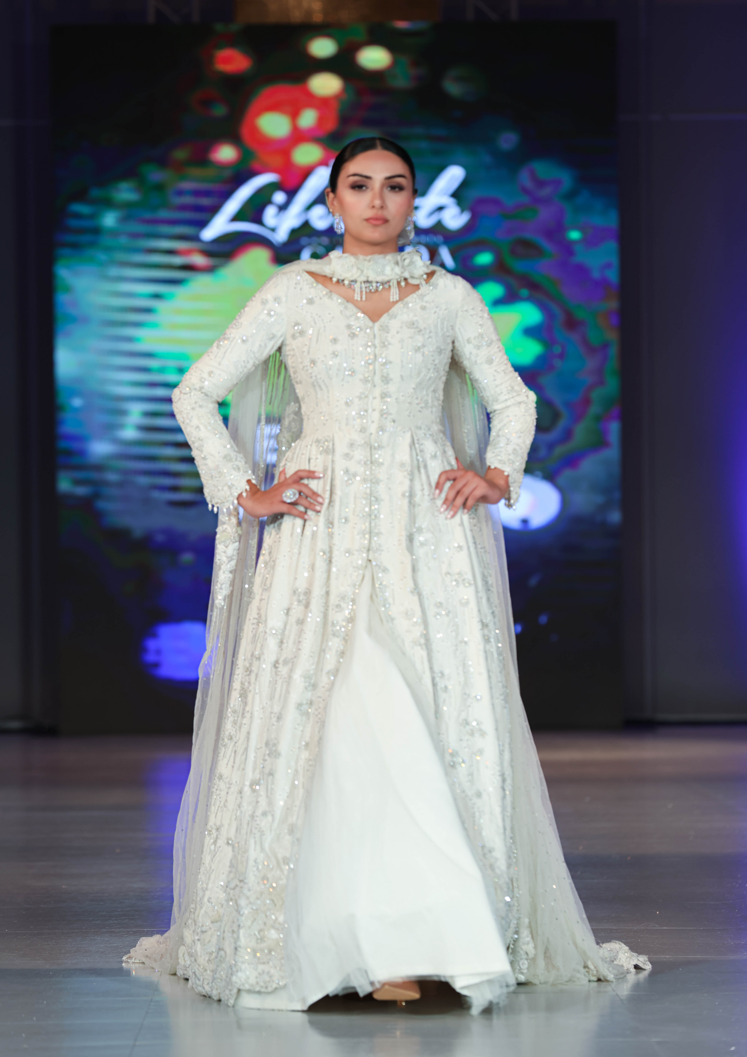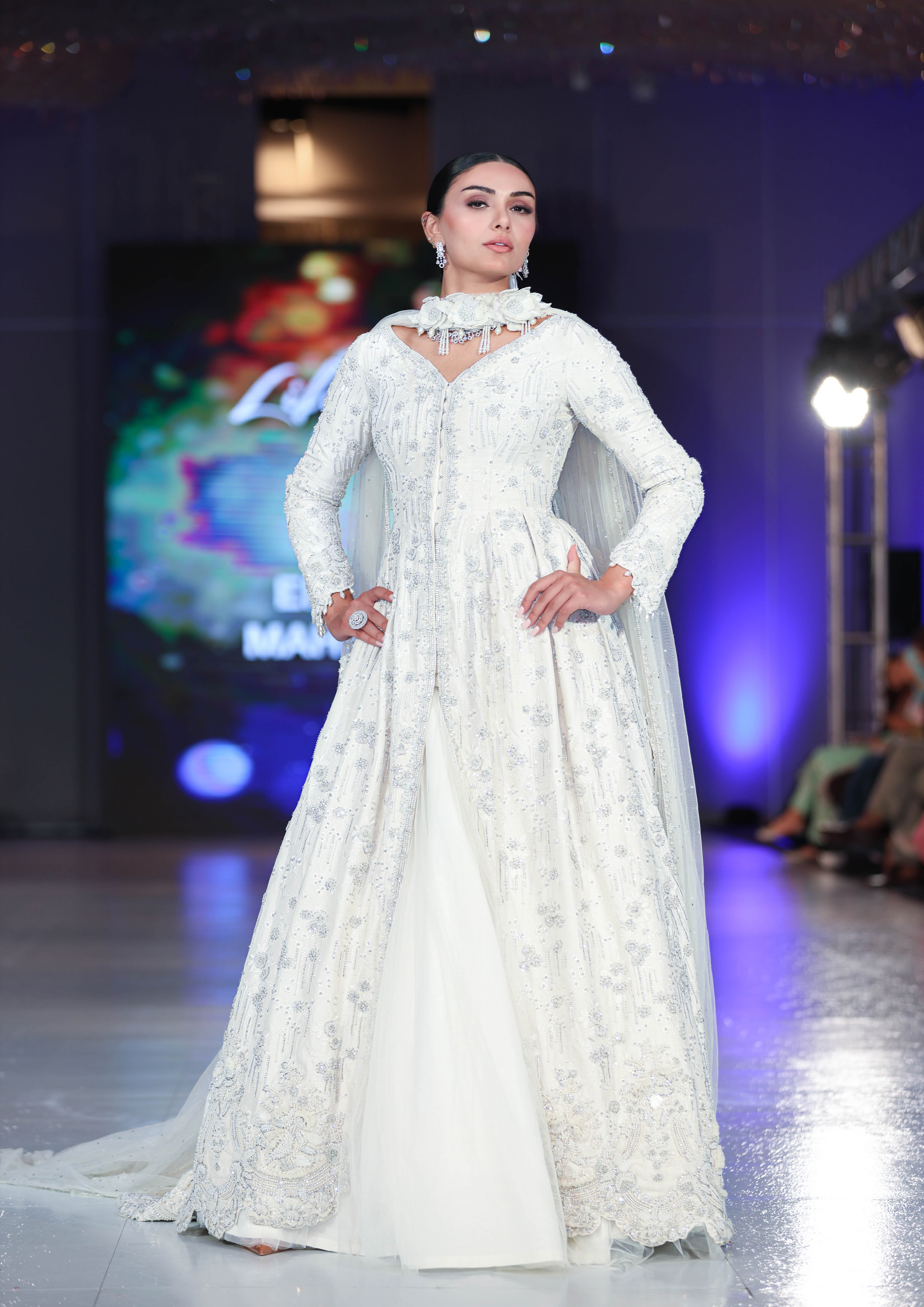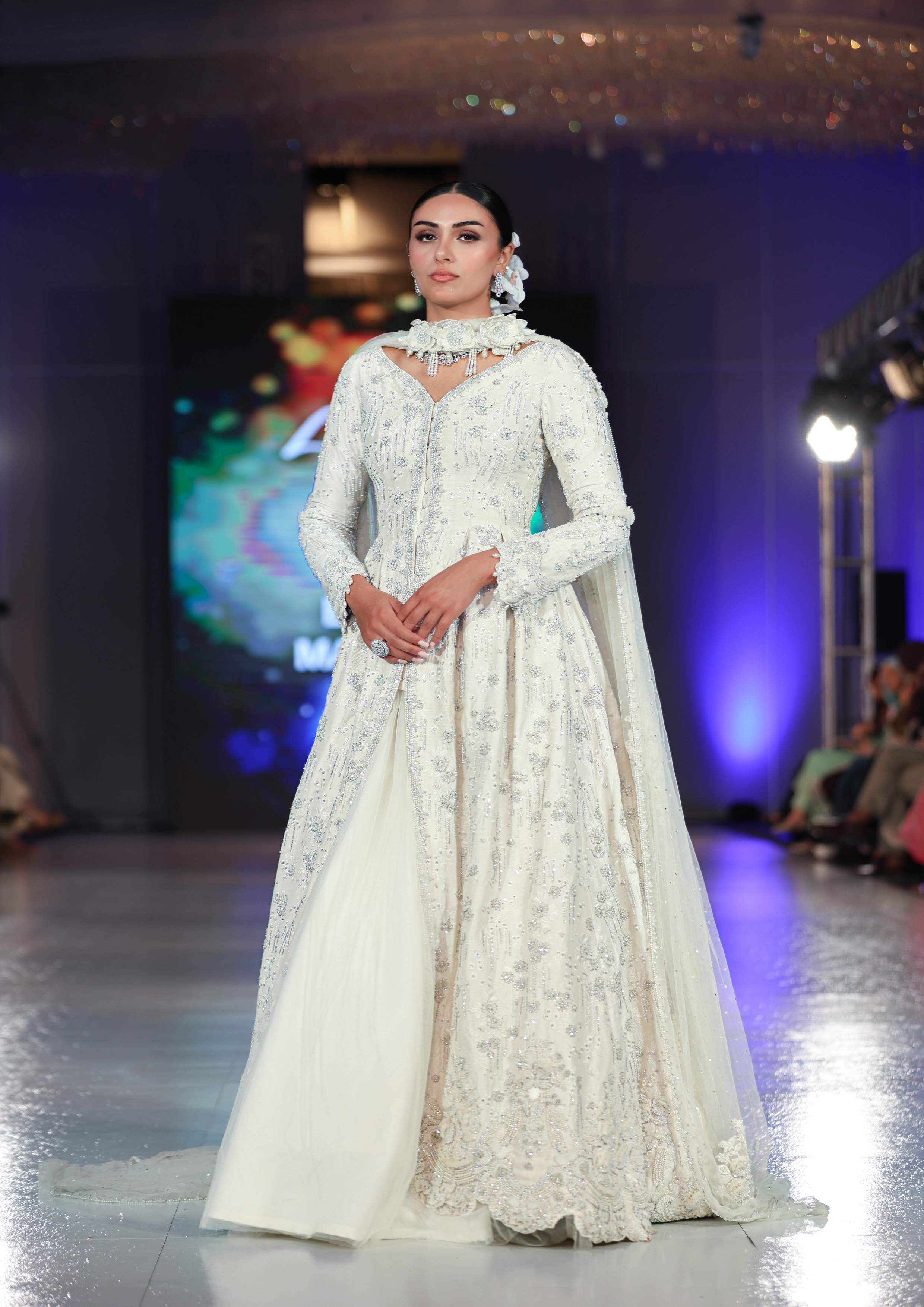 This heavily hand-embellished bridal ensemble is crafted on raw silk, featuring exquisite detailing with sequins, crystals, pearls, and resham. The borders and hemline are intricately finished to add graceful weight and fall. This timeless creation is a perfect choice for Nikkah brides, walima receptions, or a modern white bridal look.
