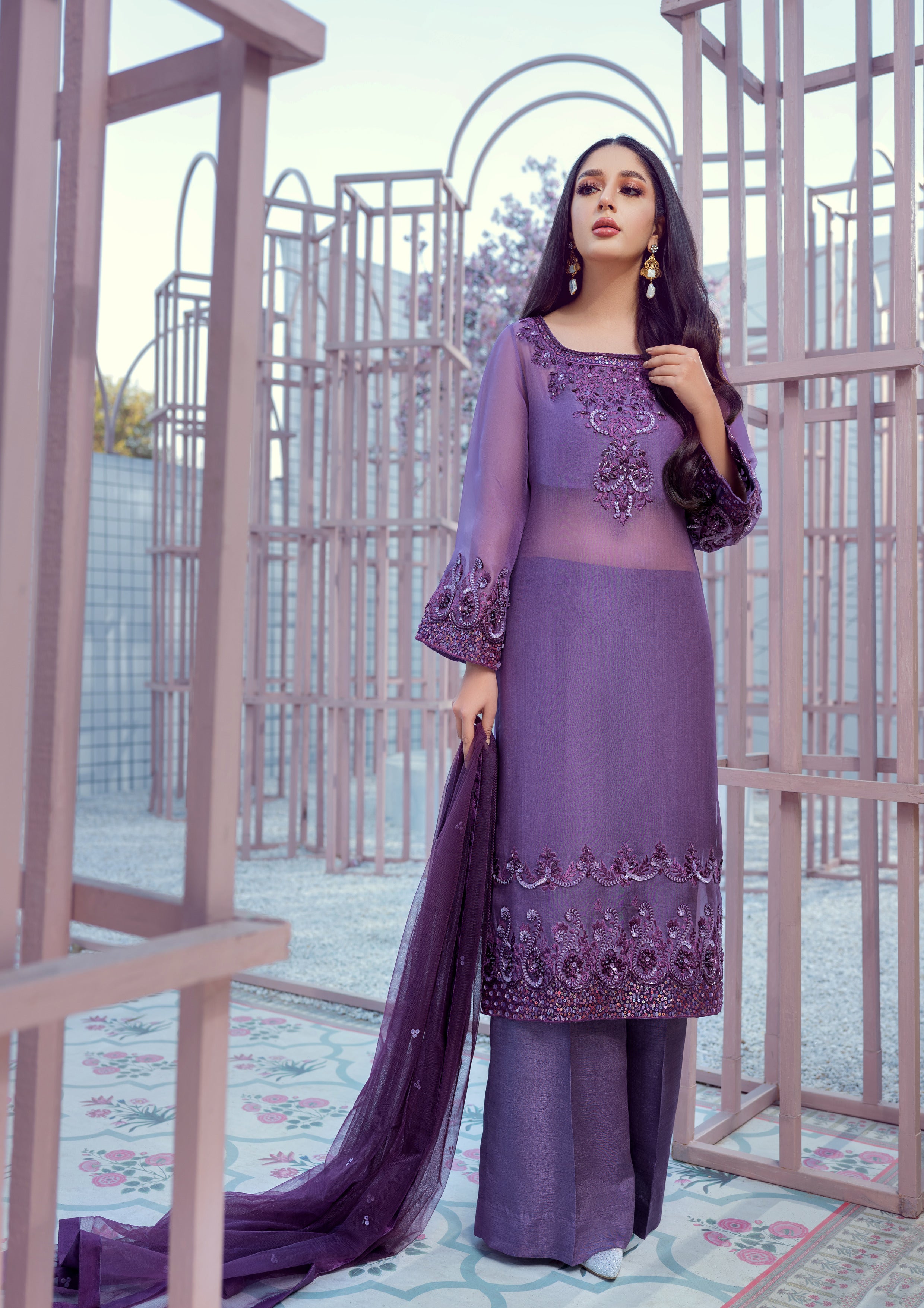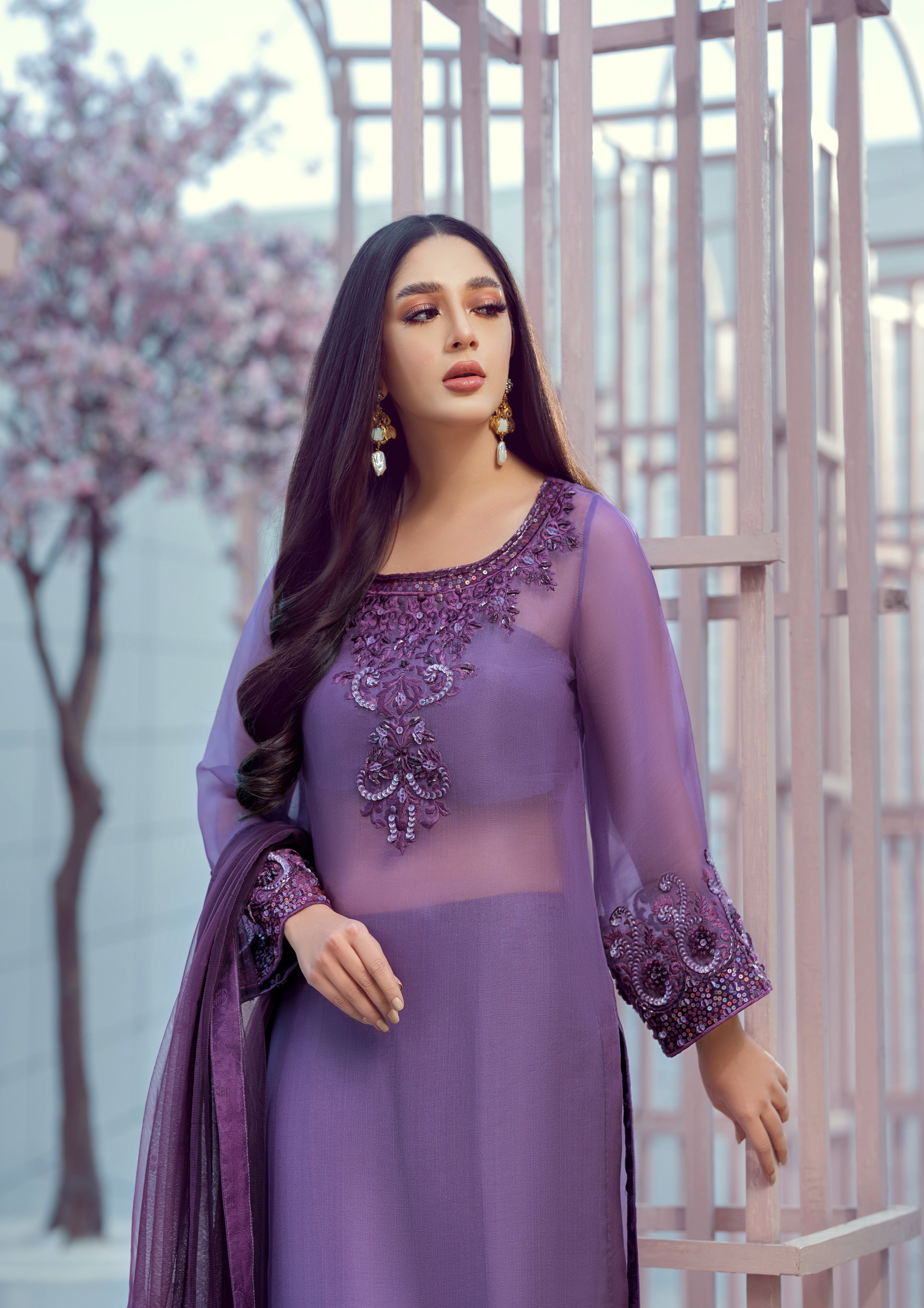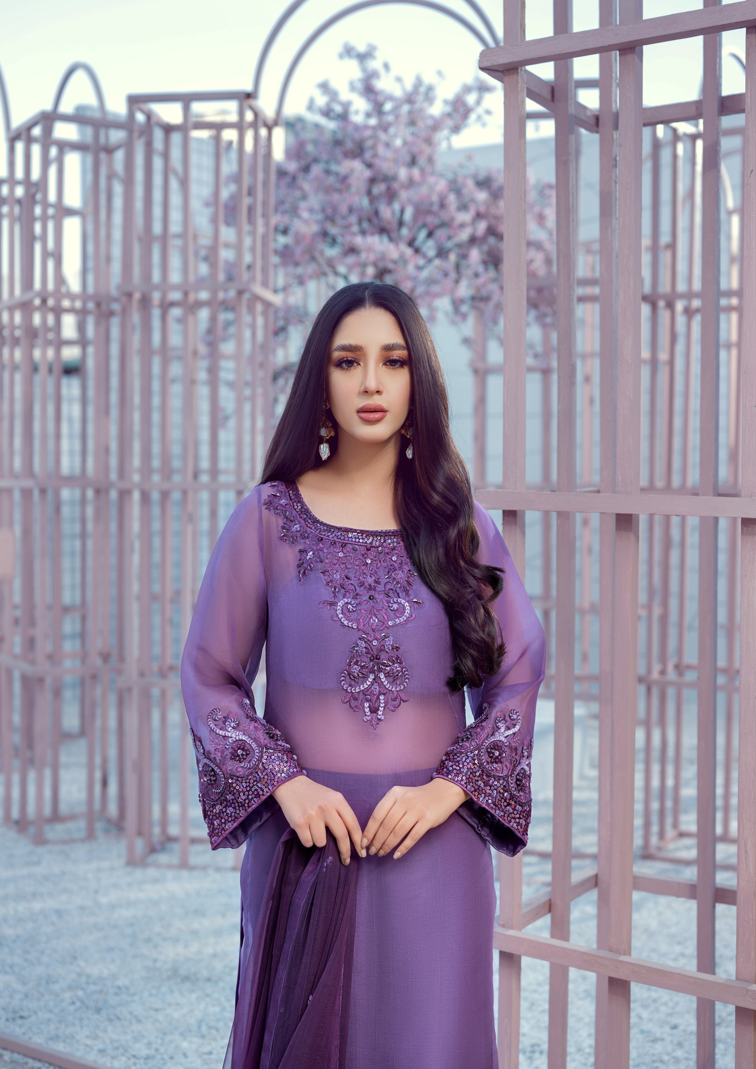 Embrace elegance with this exquisite lilac organza outfit, adorned with intricate thread and sequin embroidery that adds a touch of elegance and shimmer. The finely detailed embroidery graces the neckline and sleeves, creating a refined, sophisticated look. The double border on the daman enhances the ensemble’s luxurious appeal, making it a perfect choice for formal occasions. With its delicate color and artful detailing, this outfit is a statement of grace and modern elegance.