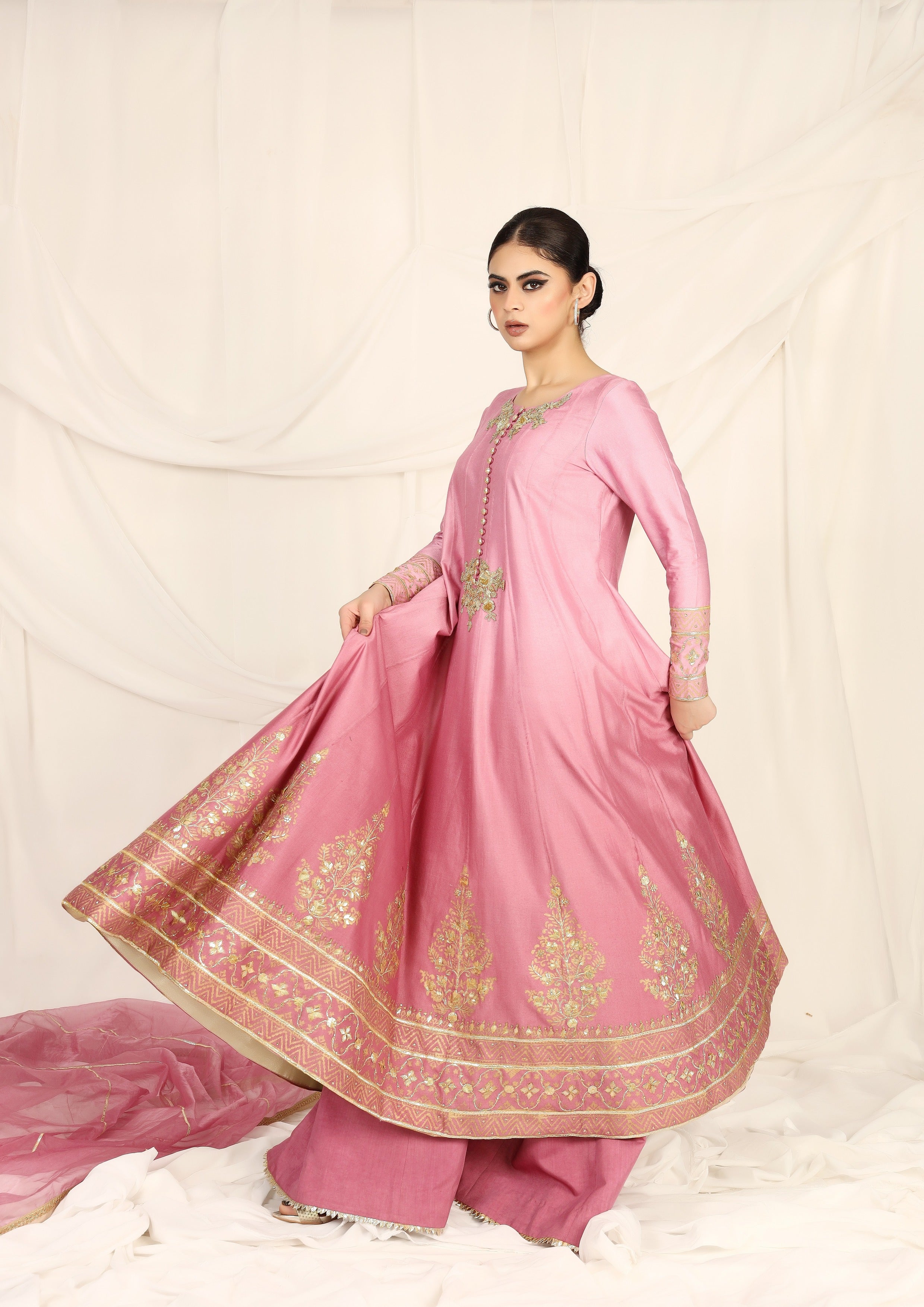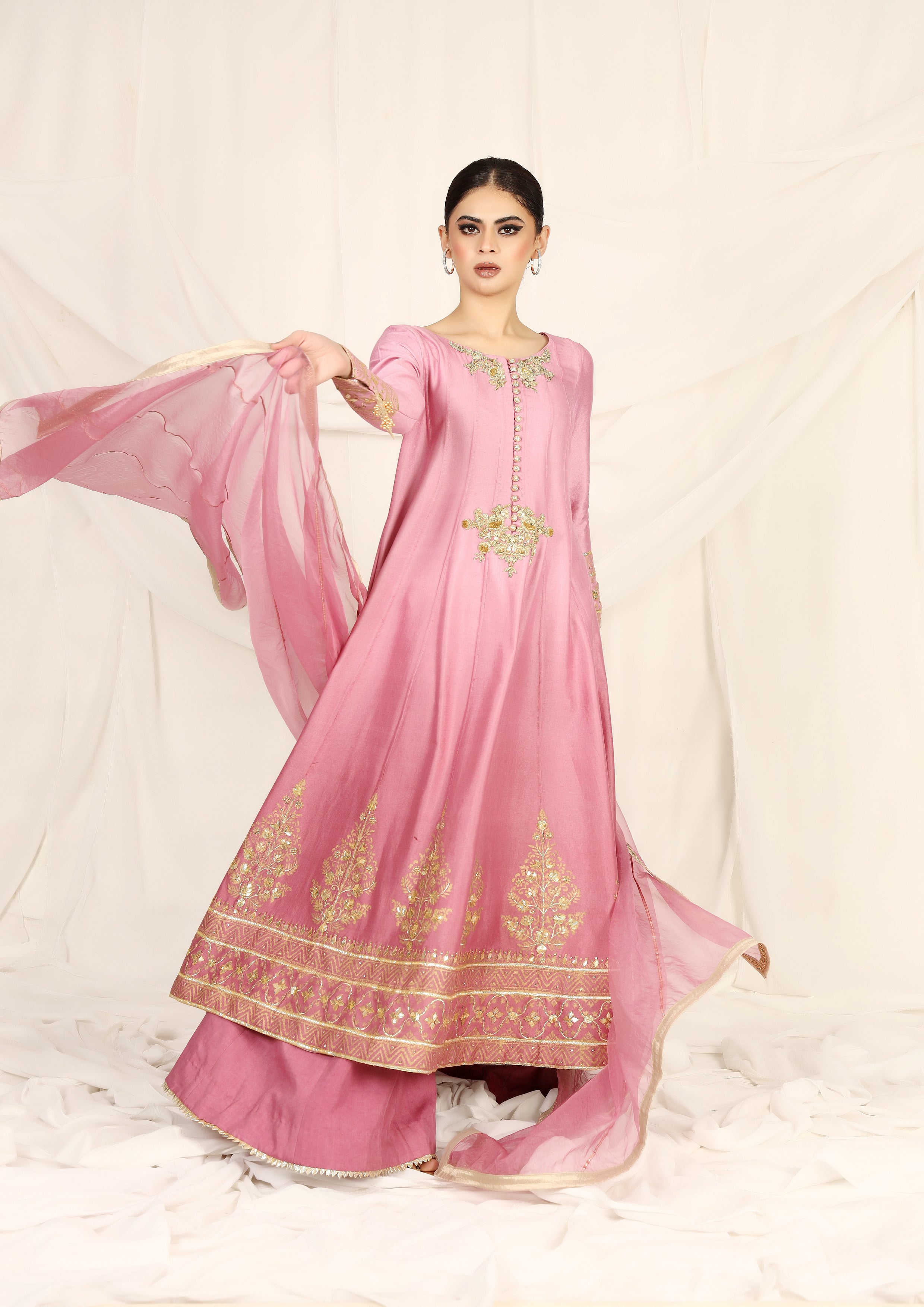 Embrace your inner elegance with our stunning shaded kalidaar cotton net outfit, featuring beautiful block printing and intricate zardozi work.
