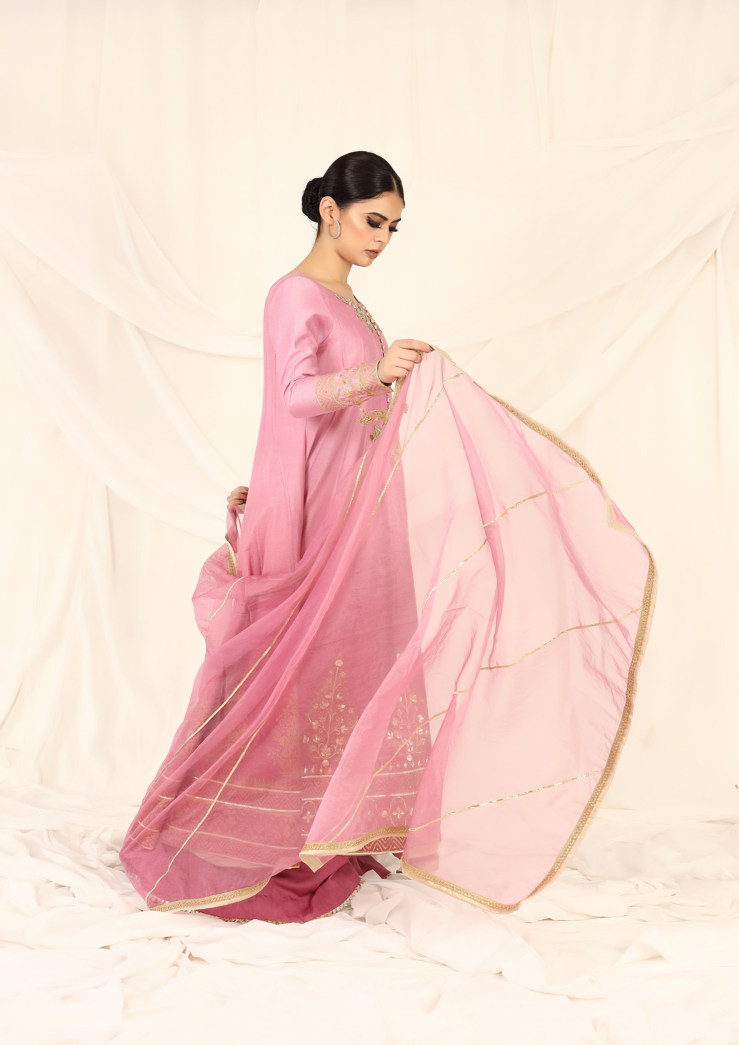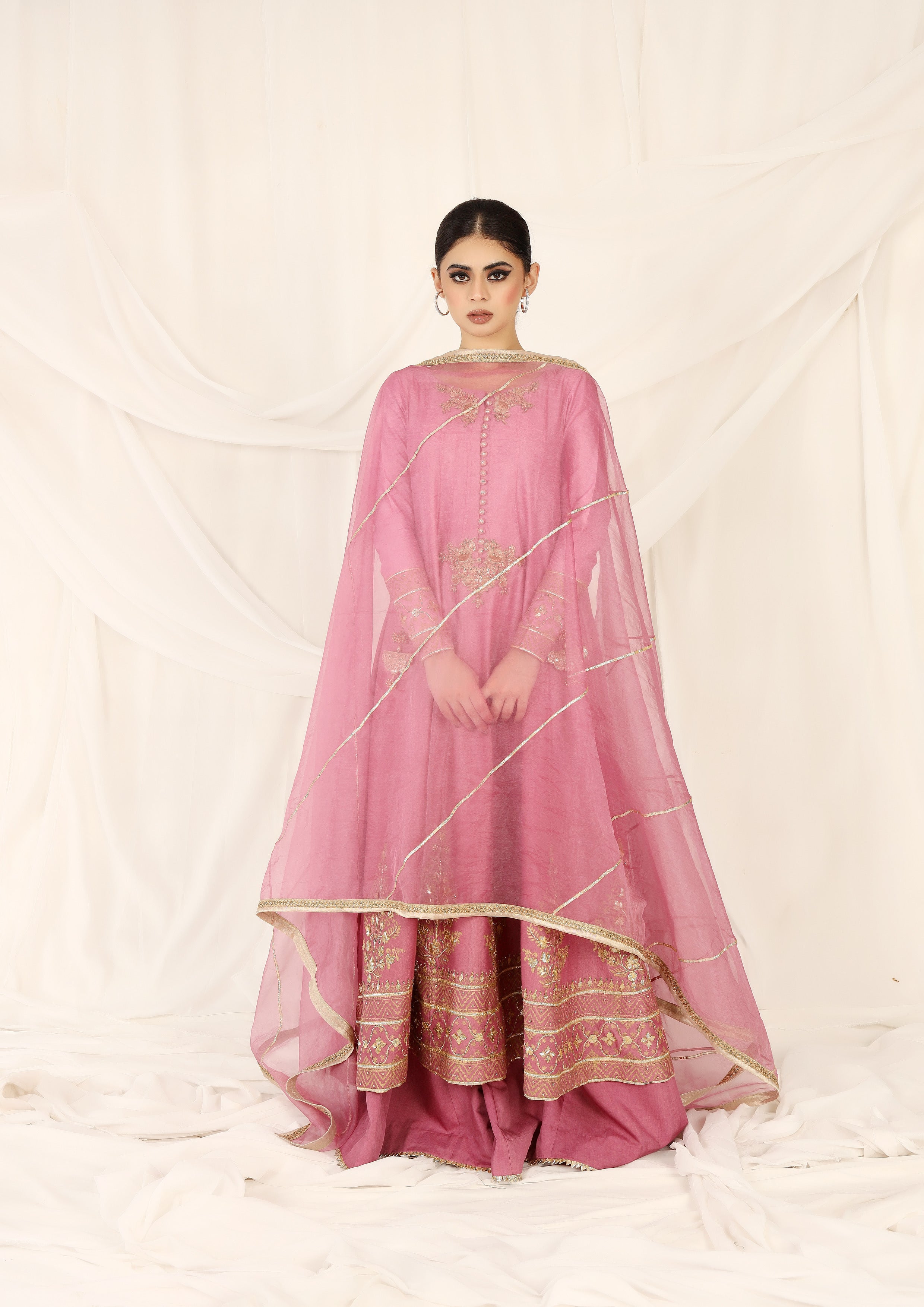 Paired with comfortable azaar pants and a delicate organza dopatta with gotta and lace detailing, this outfit is the perfect choice for any occasion. Shop now and elevate your style to new heights!