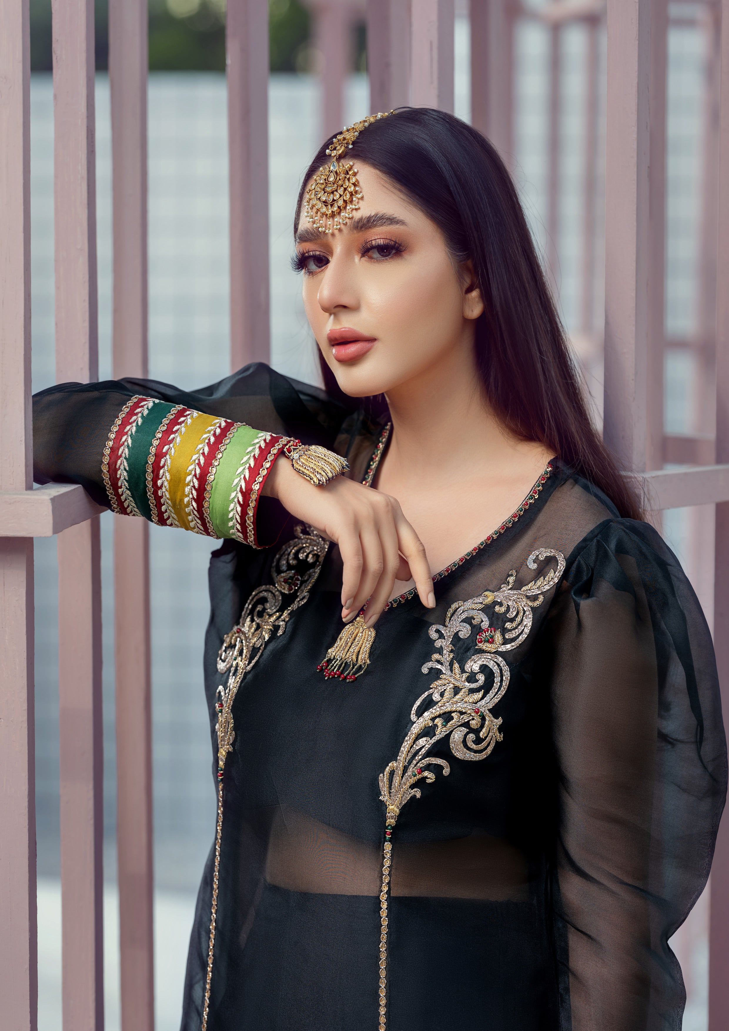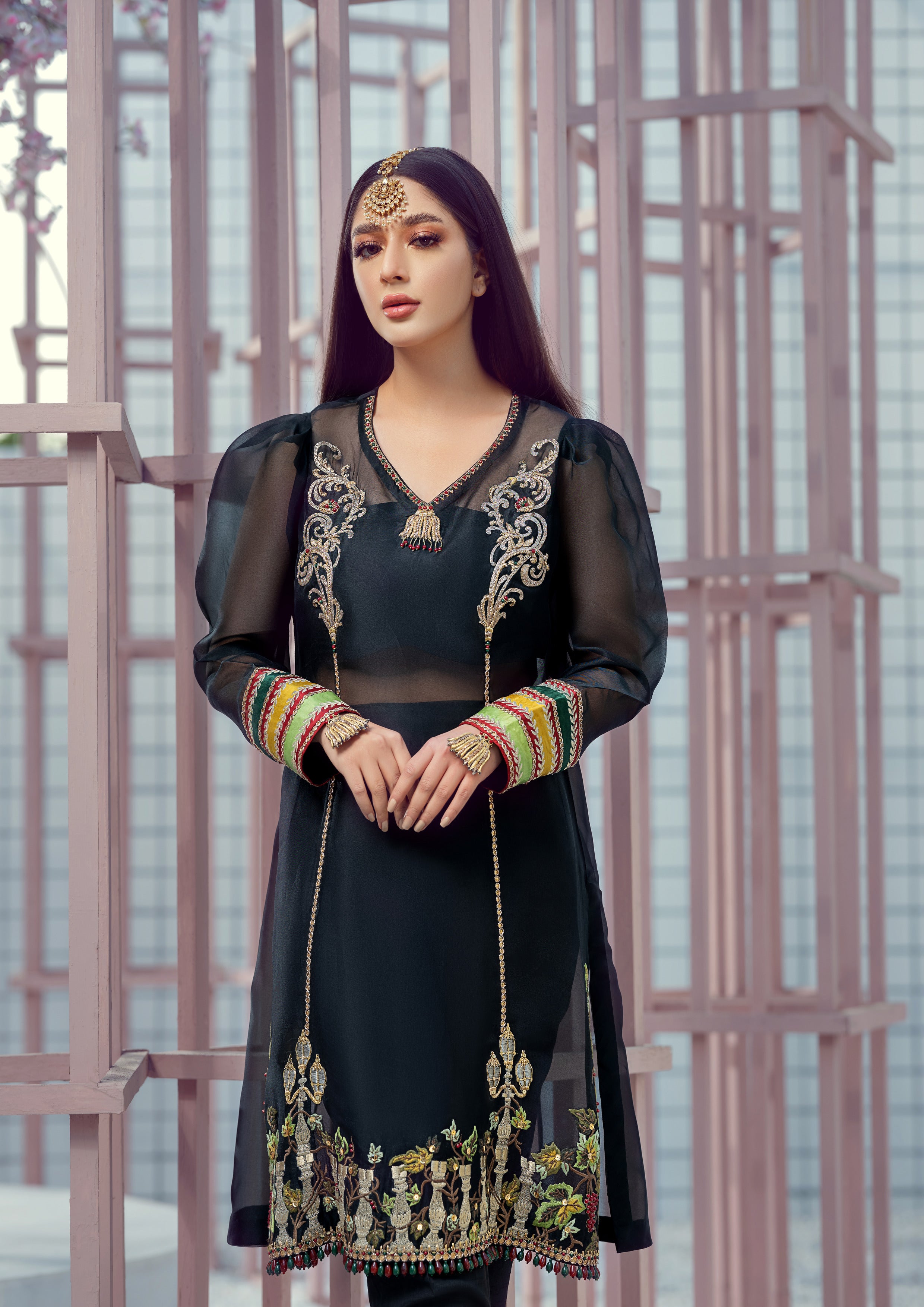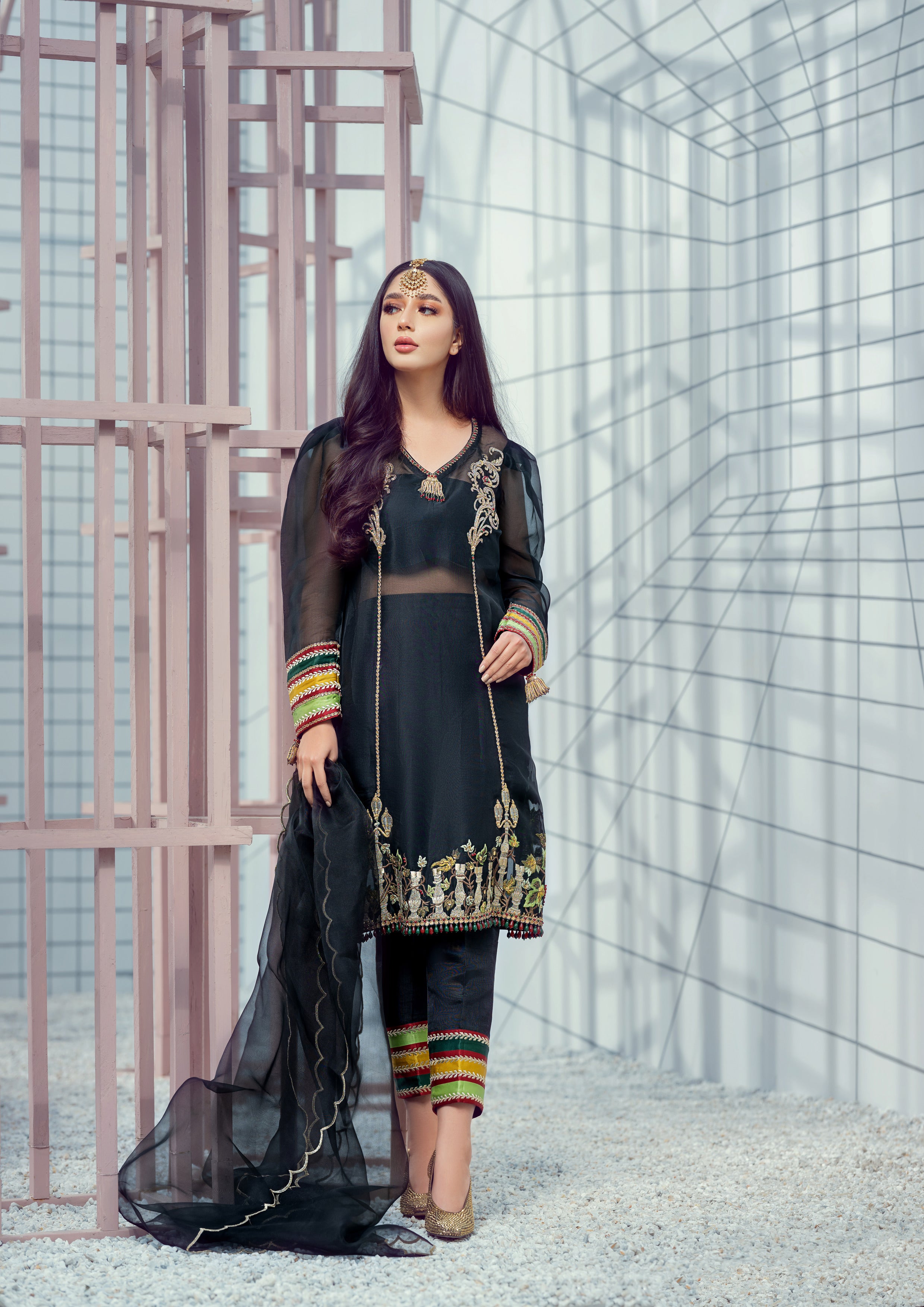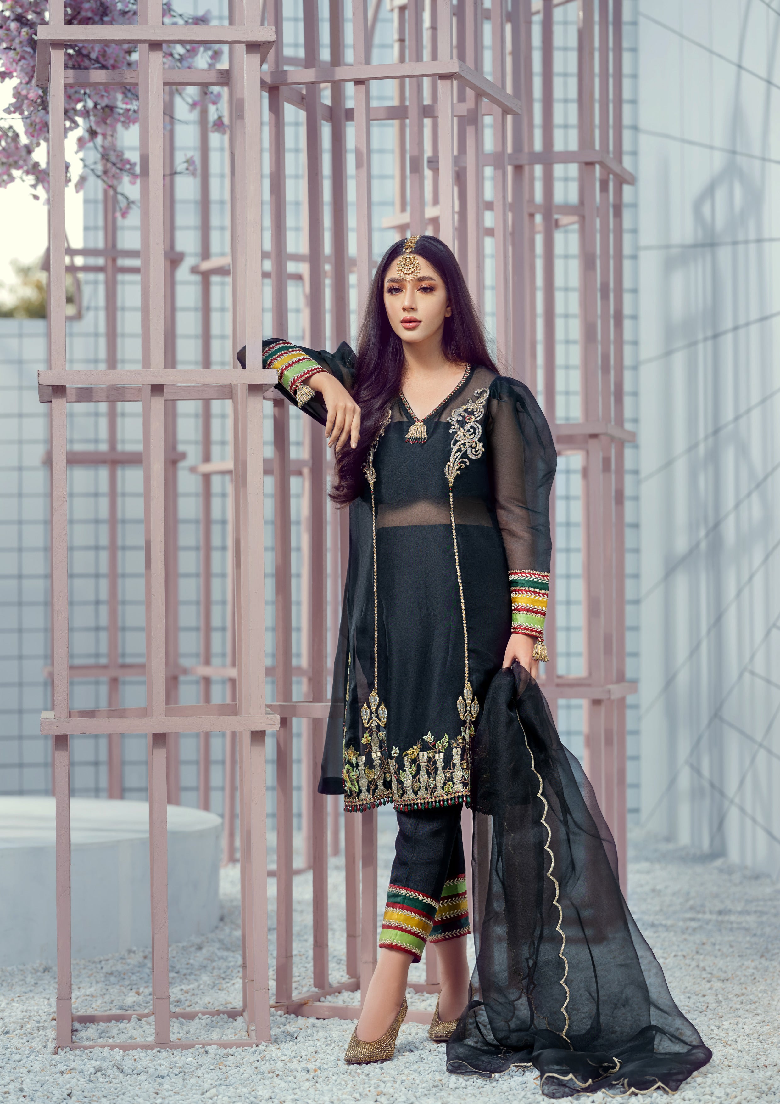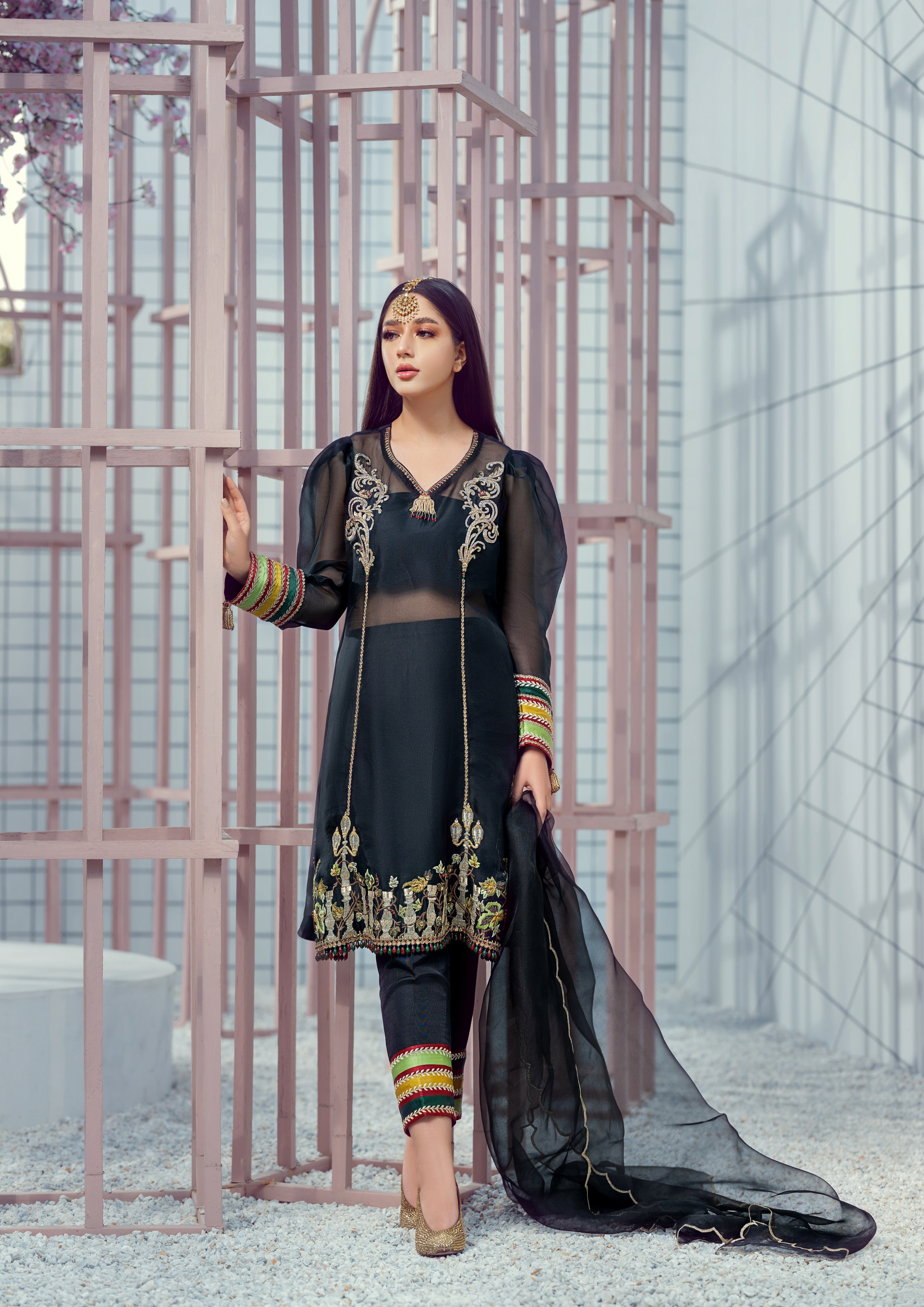 Introducing 'Starry Nights' – an enchanting black organza shirt adorned with rich gold tilla and dabka embroidery, highlighted by elegant yellow, green, and maroon accents. This outfit is paired with sleek black raw silk trousers and a delicate organza dupatta, bringing a sophisticated, festive allure to any evening occasion. With its striking details and timeless color palette, 'Starry Nights' is a statement piece designed for those who appreciate classic elegance with a modern edge.
