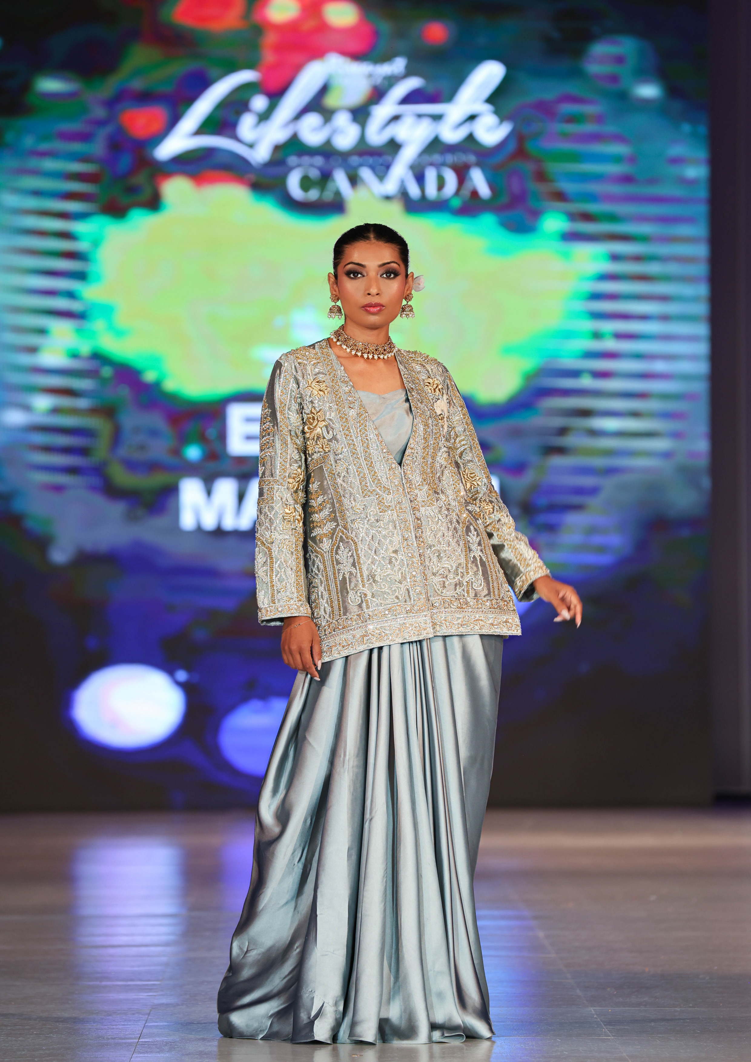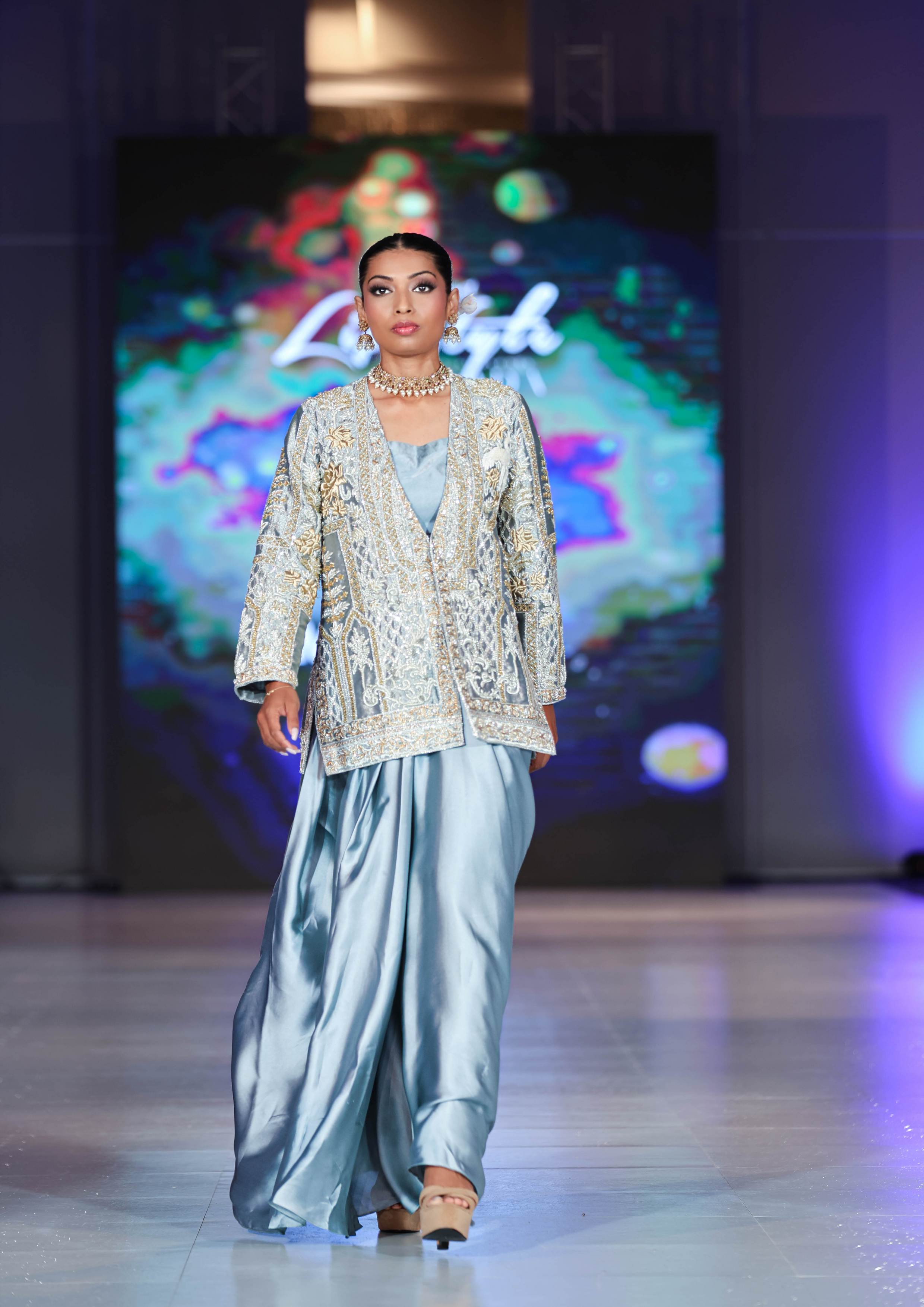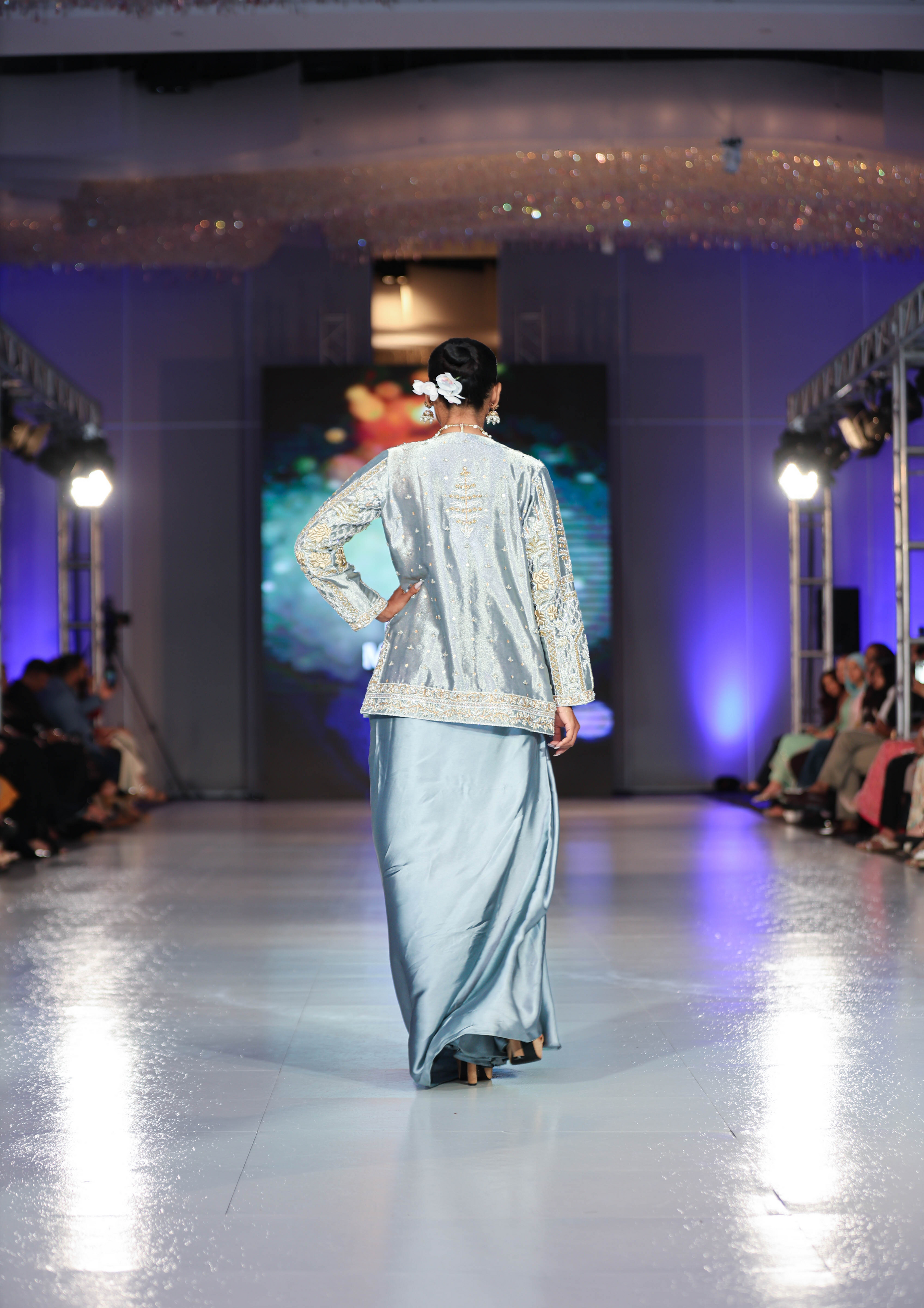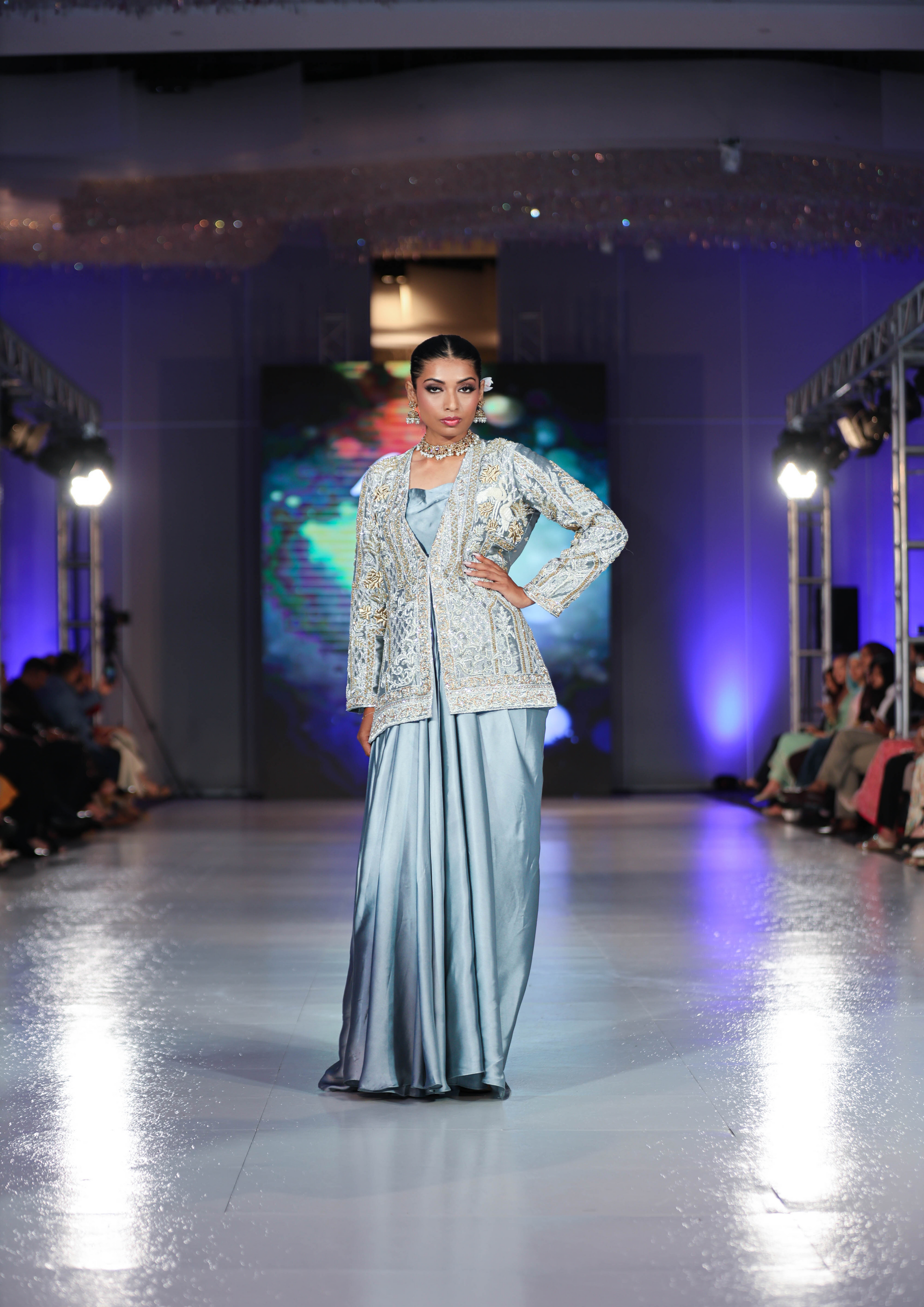 Delicate yet fierce, this jacket reflects a spirit of quiet strength in our signature style. Adorned with intricate qora, dabka, crystals, sequins, and detailed zardozi work, the jacket is further elevated with graceful swan motifs. It is paired with a draped charmouse silk skirt, completing the look with modern elegance.