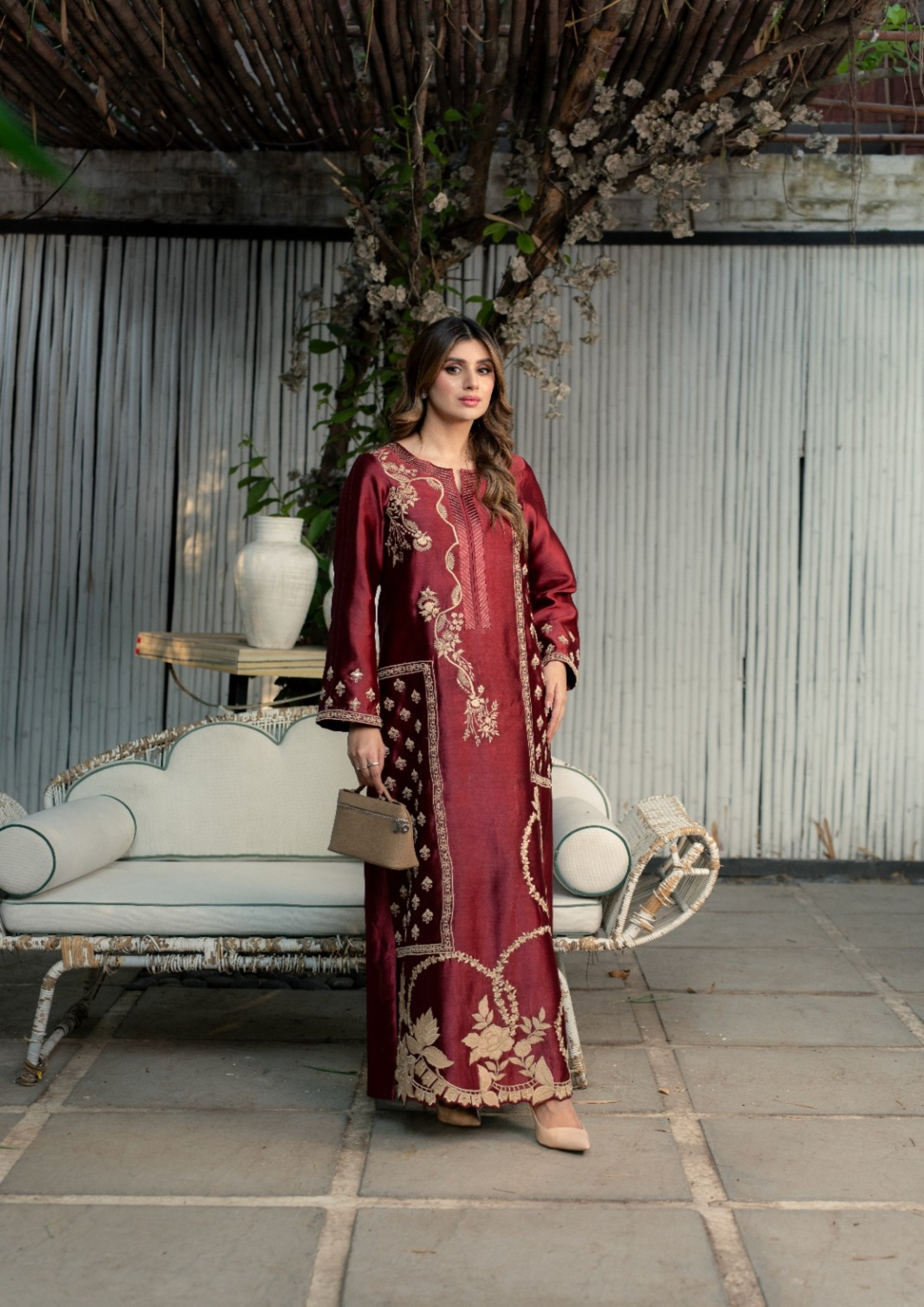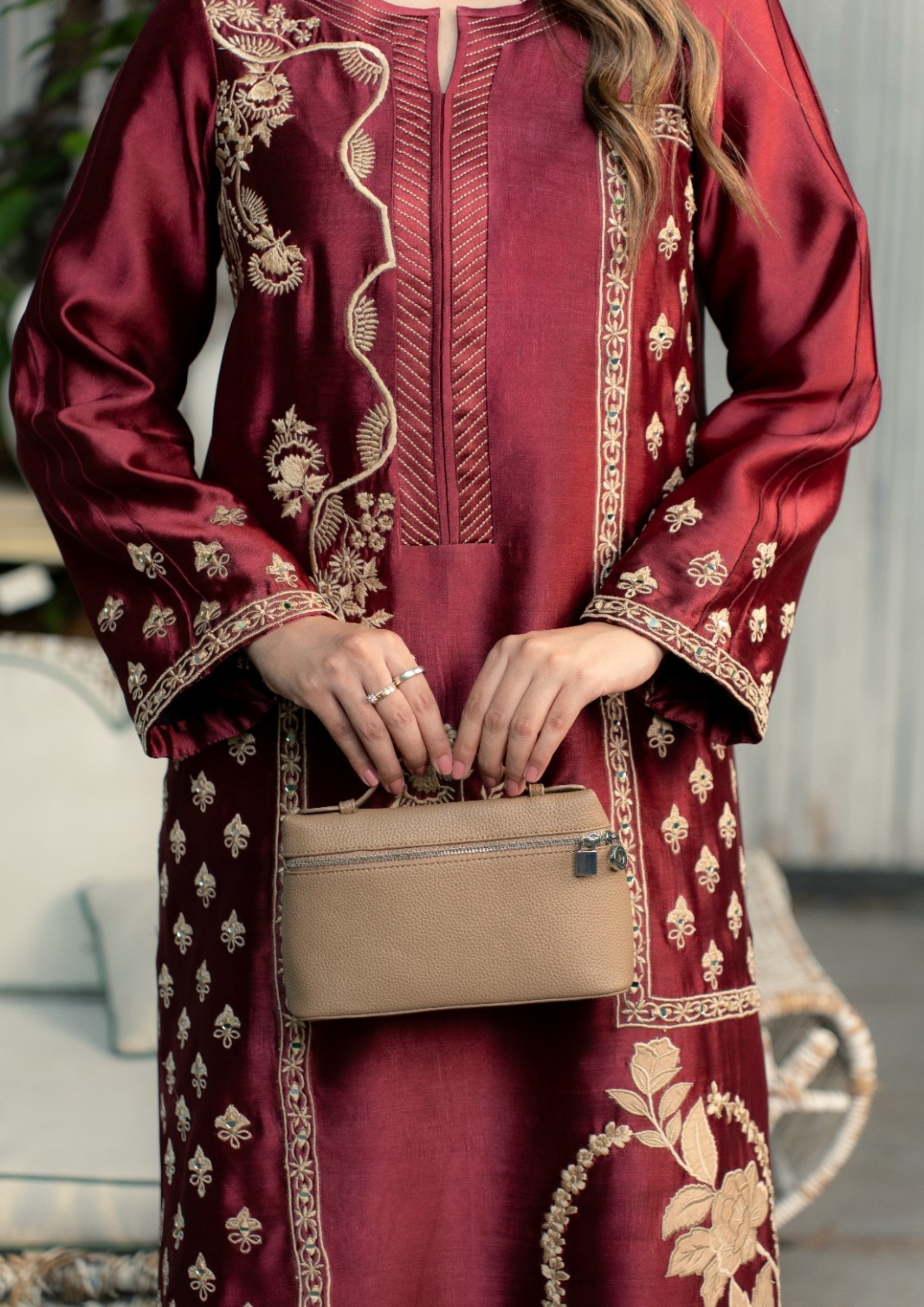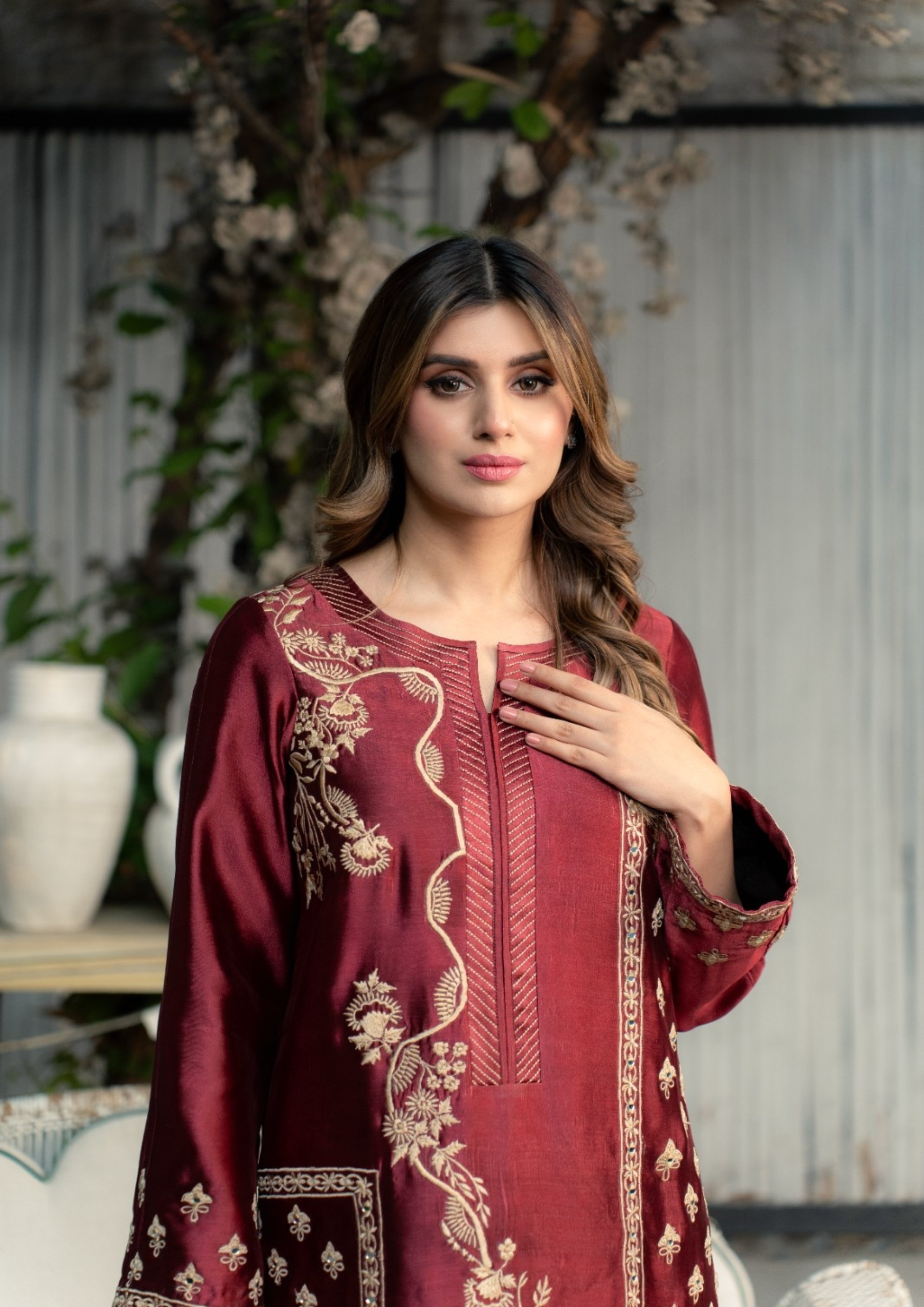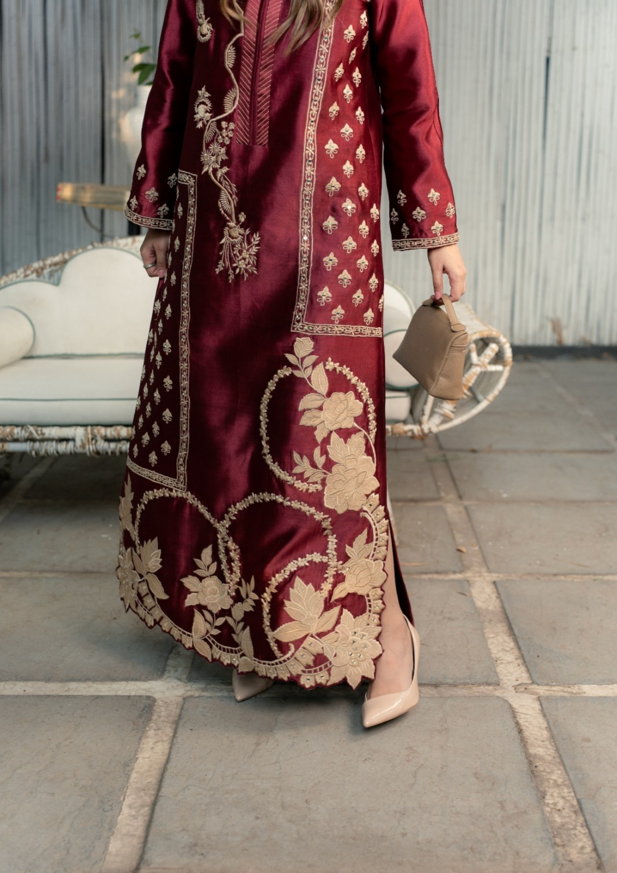 Draped in a rich maroon hue, this tissue silk kaftan-style shirt is beautifully adorned with ivory applique work featuring delicate botanical patterns, Reflecting the beauty of handmade work.