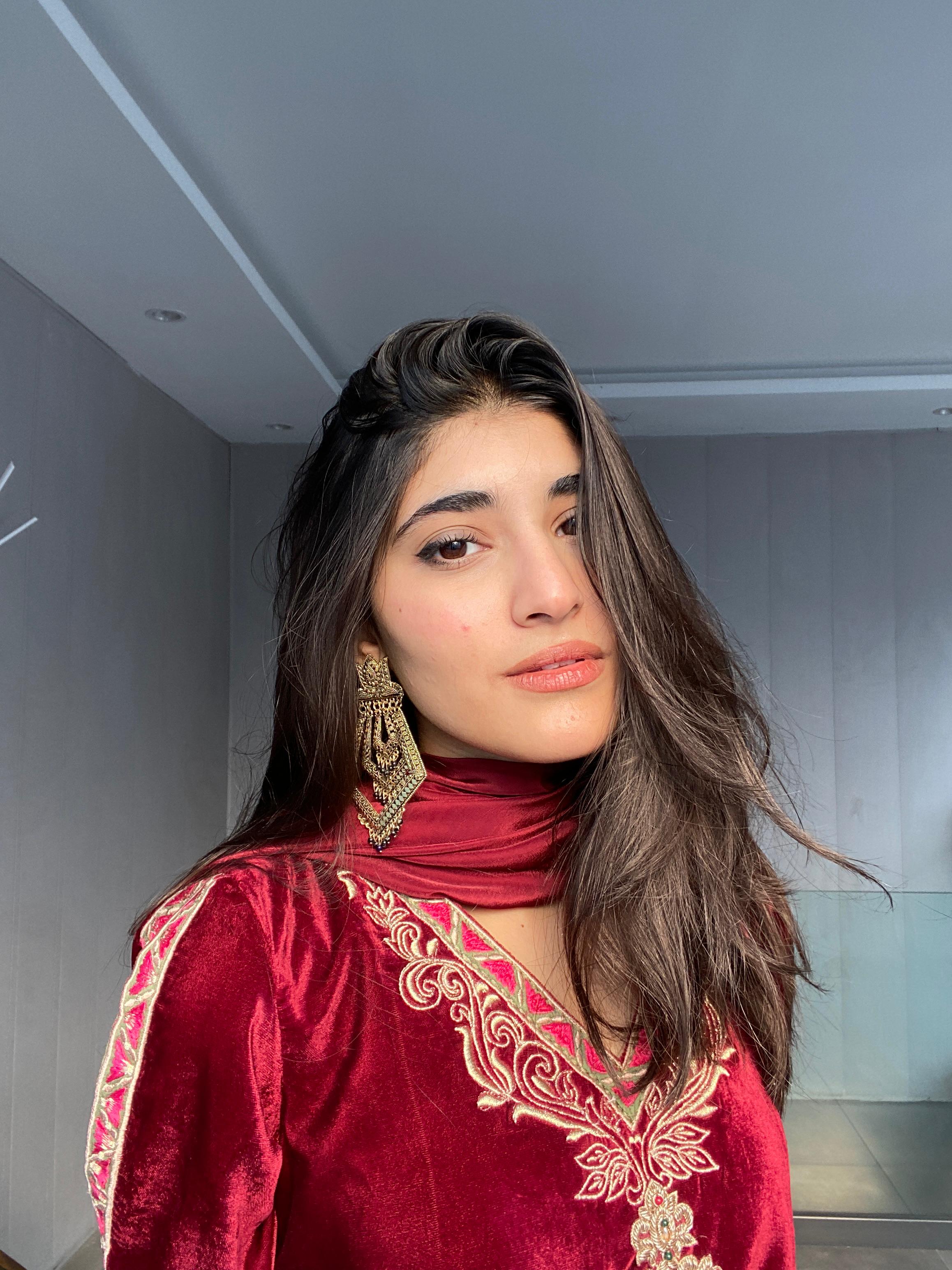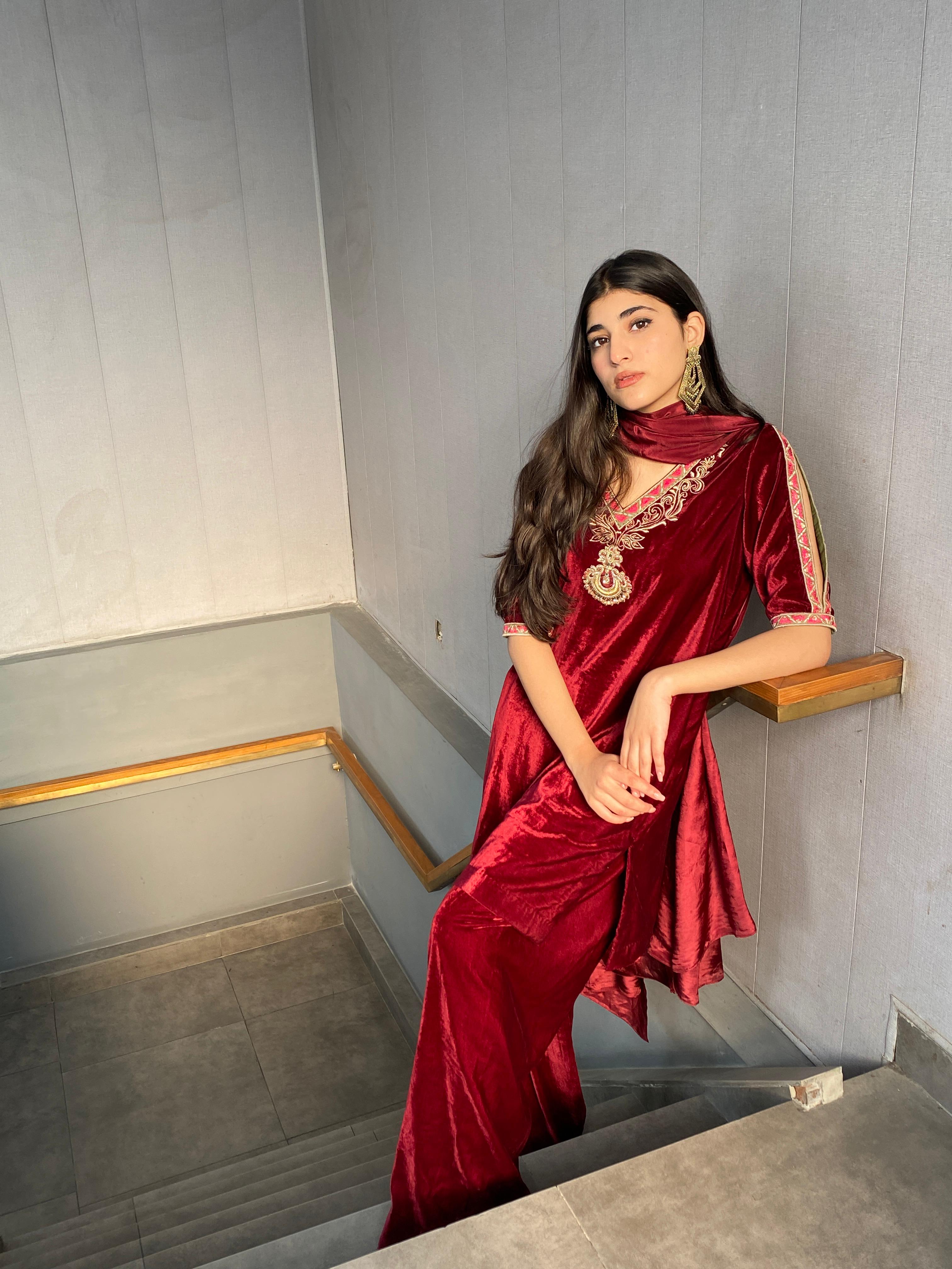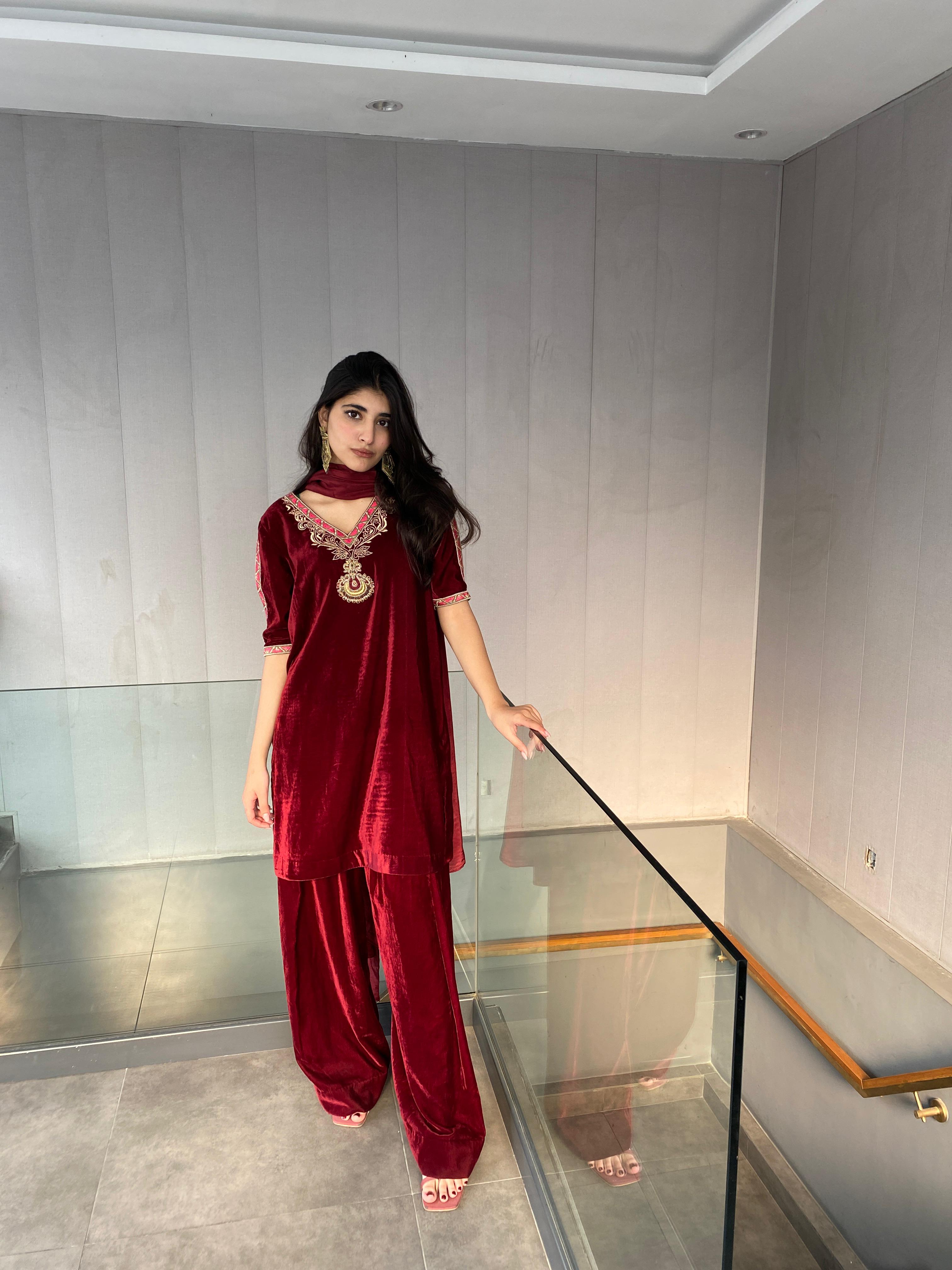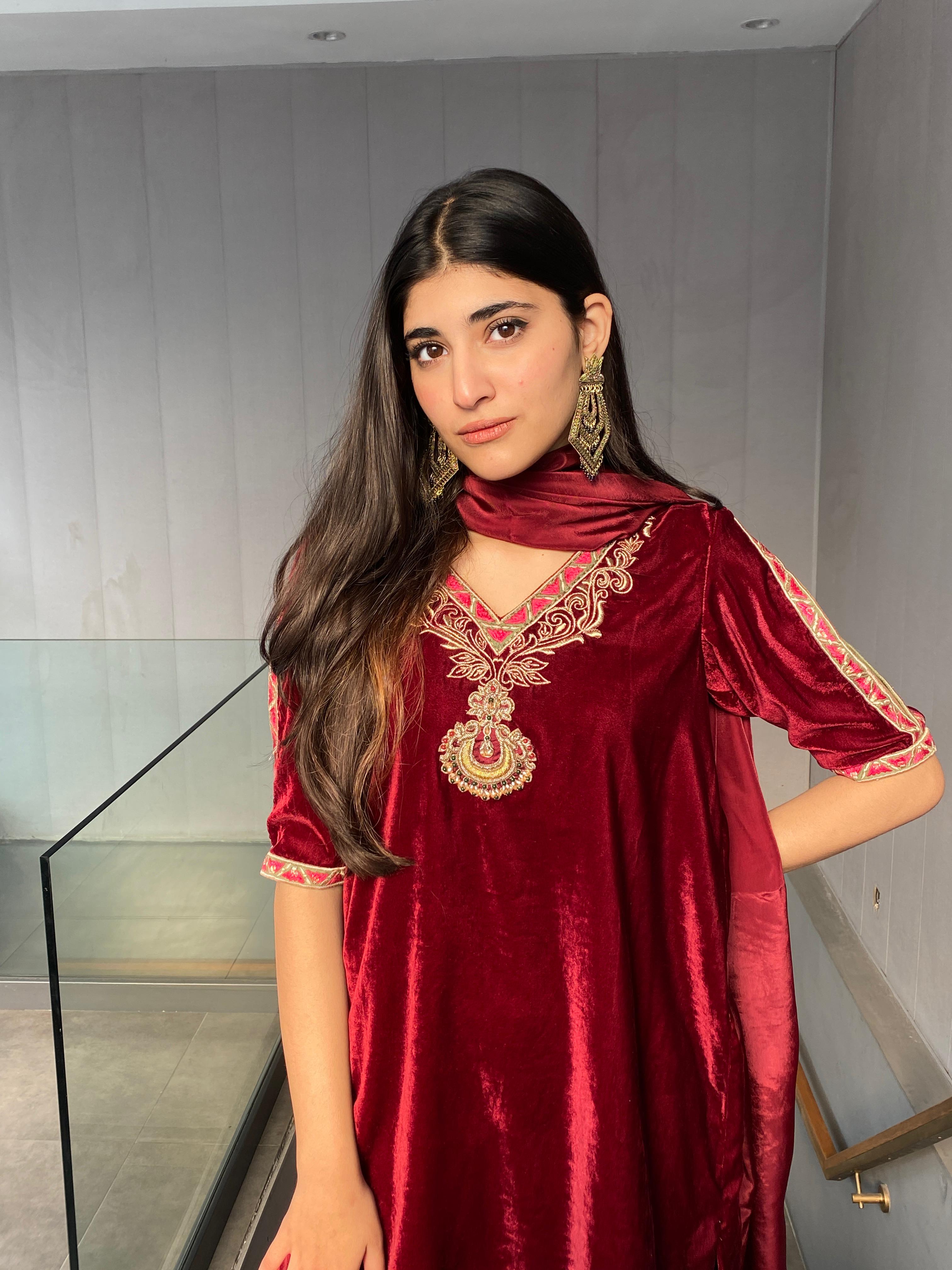 A touch of lace, a hint of gold ✨ Maroon velvet redefines elegance.